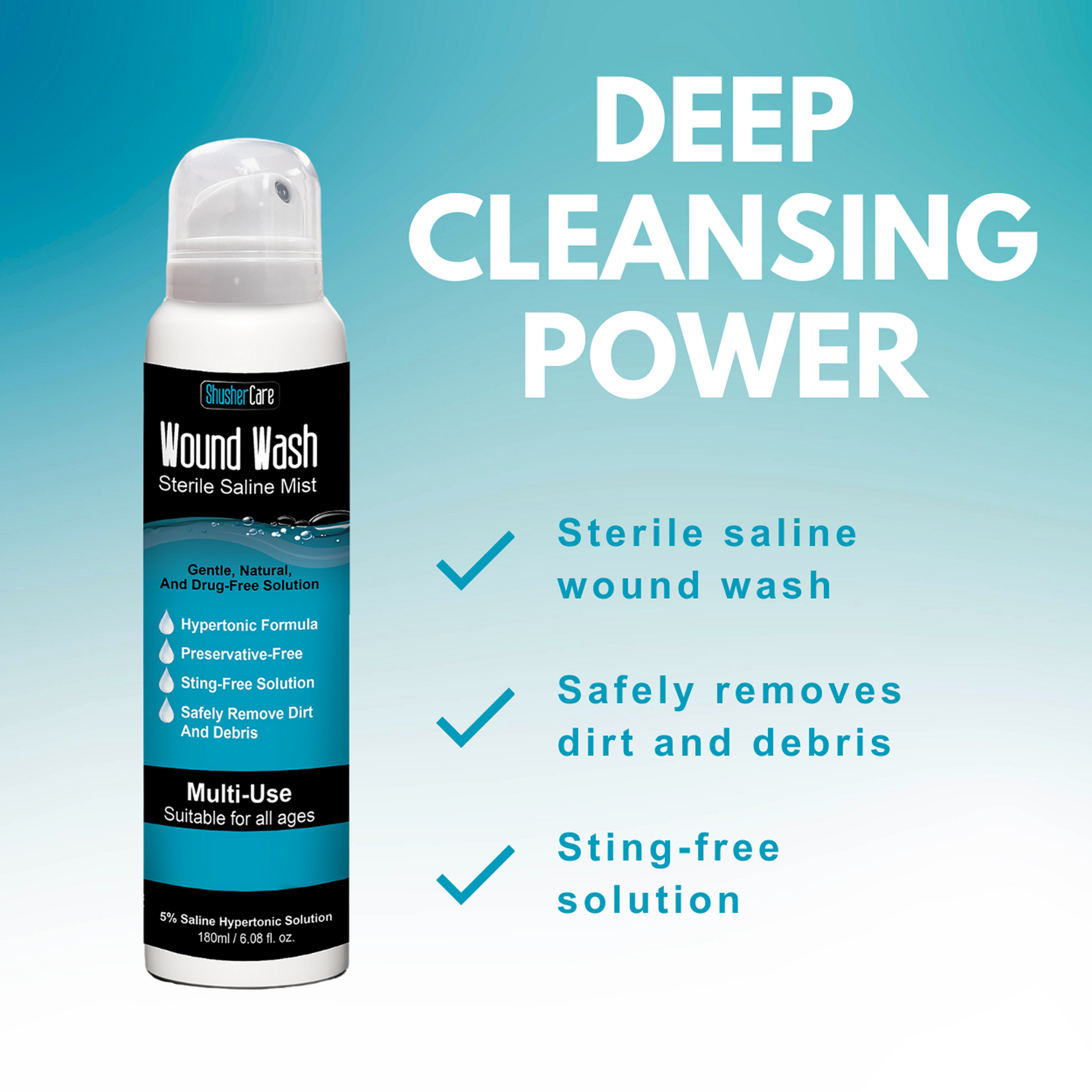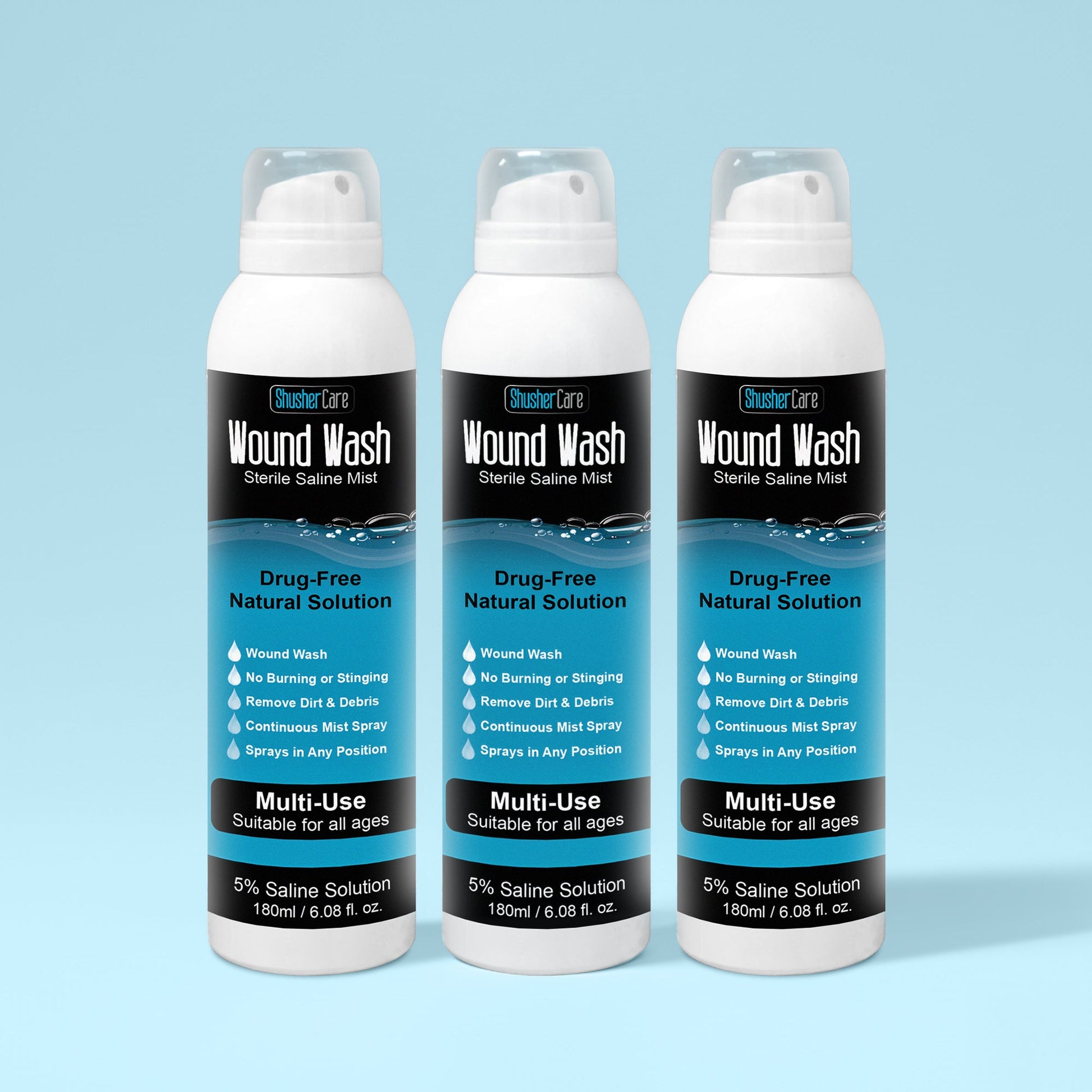Shusher Care Hypertonic Wound Wash Spray is a drug-free, sterile 5% saline solution designed to gently and effectively clean wounds while promoting faster, natural healing. Its hypertonic formula helps flush out bacteria, dirt, and debris while reducing swelling and irritation. Perfect for everyday cuts and scrapes, post-piercing care, or more complex wound support, it's a safe and convenient addition to any first aid kit.