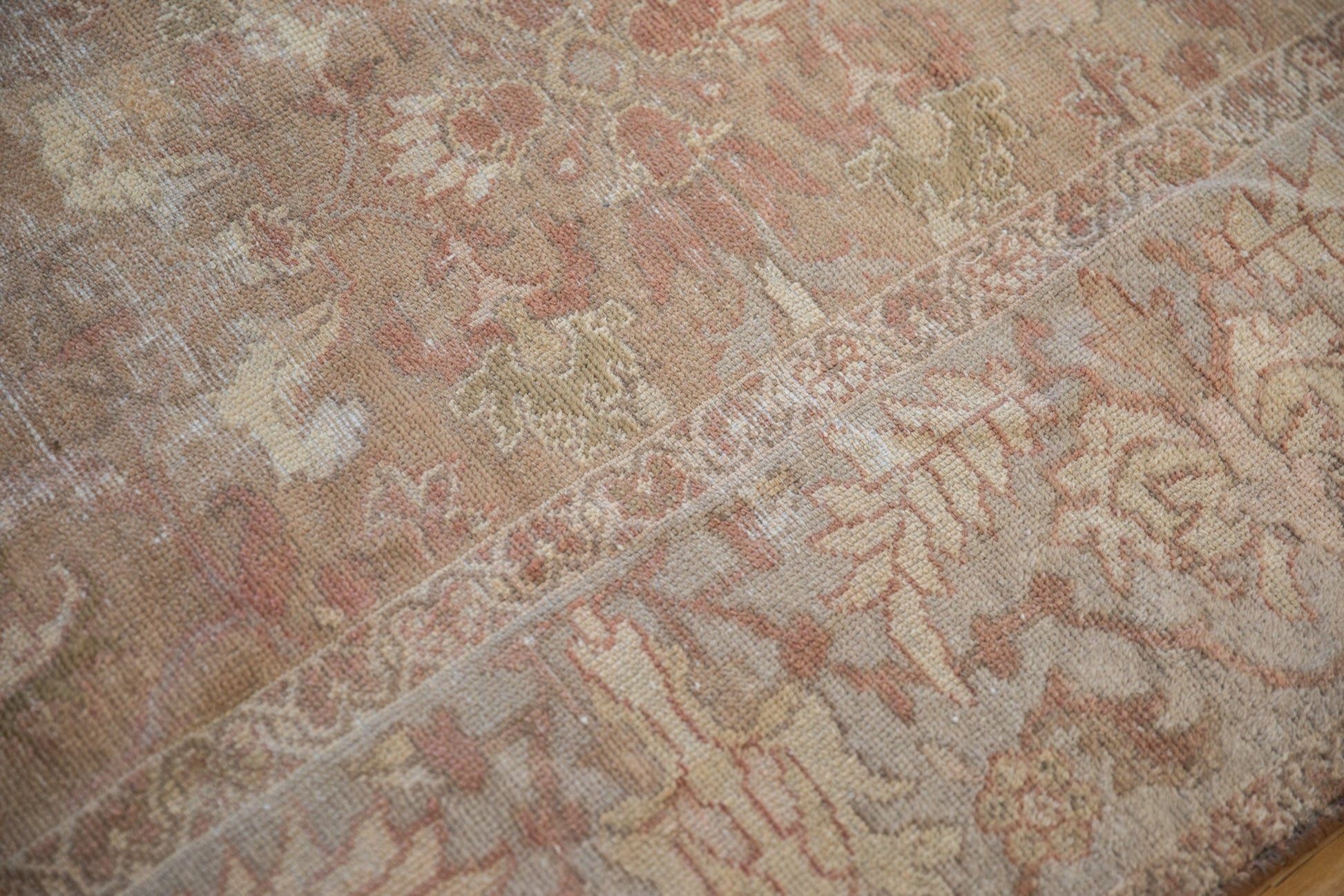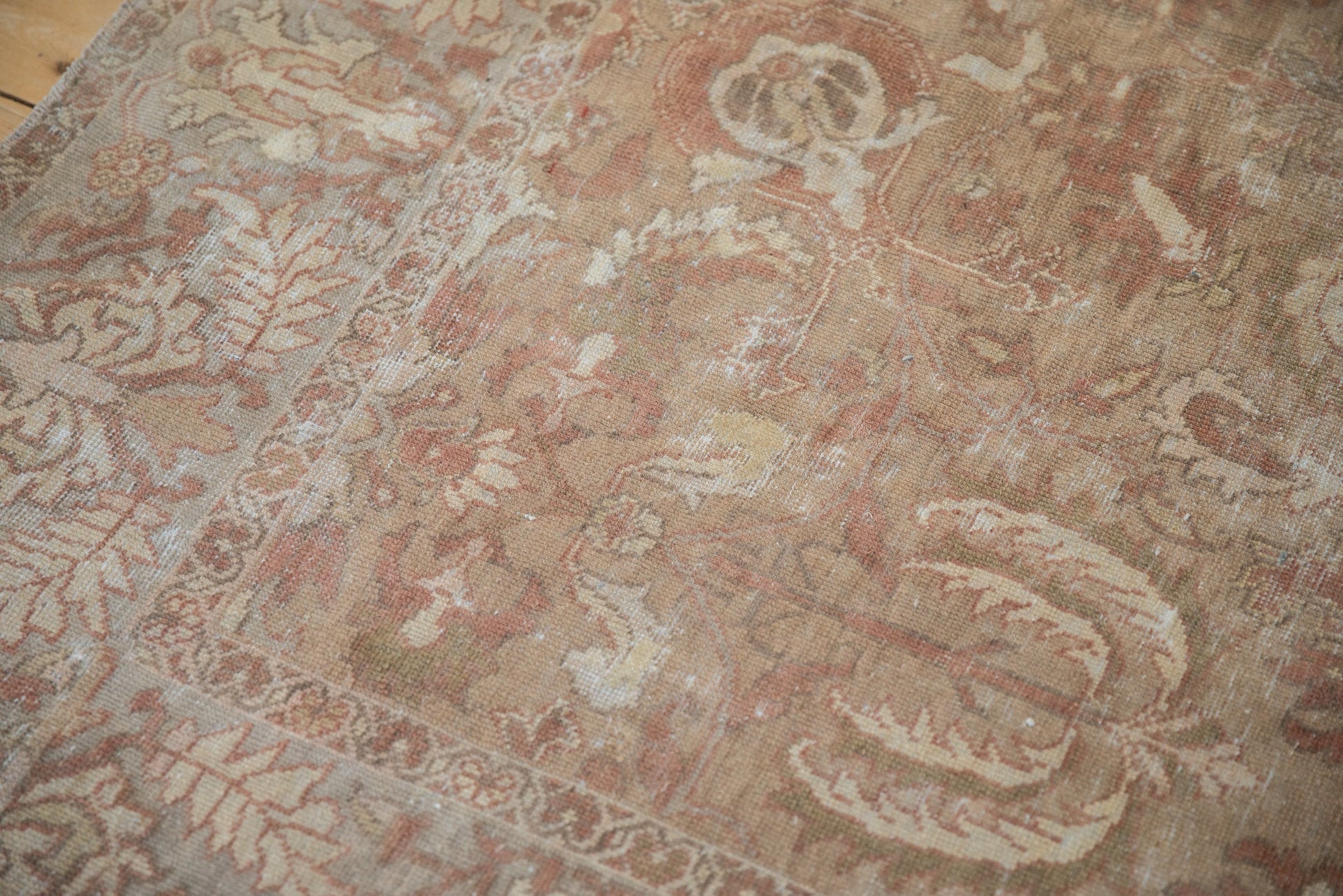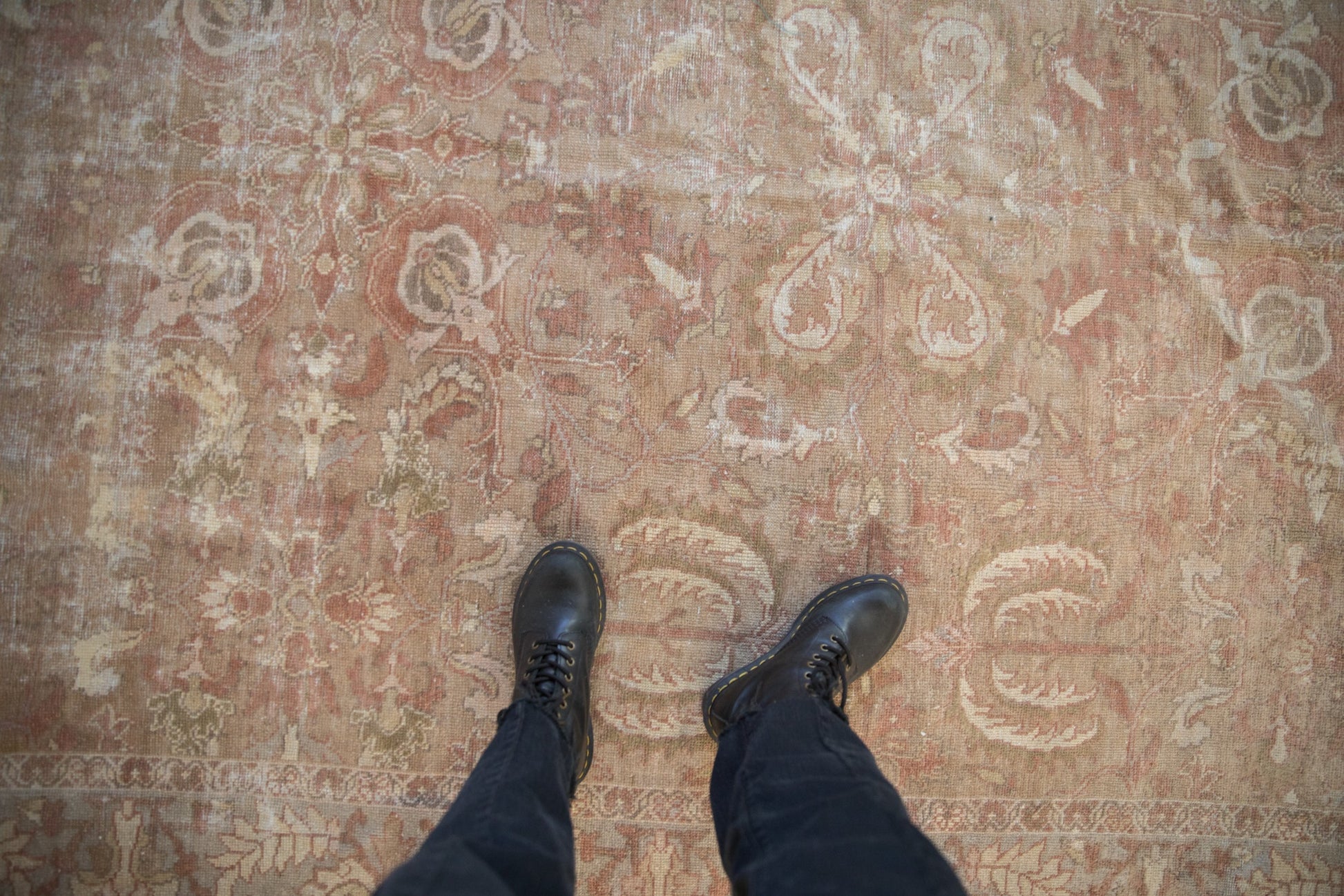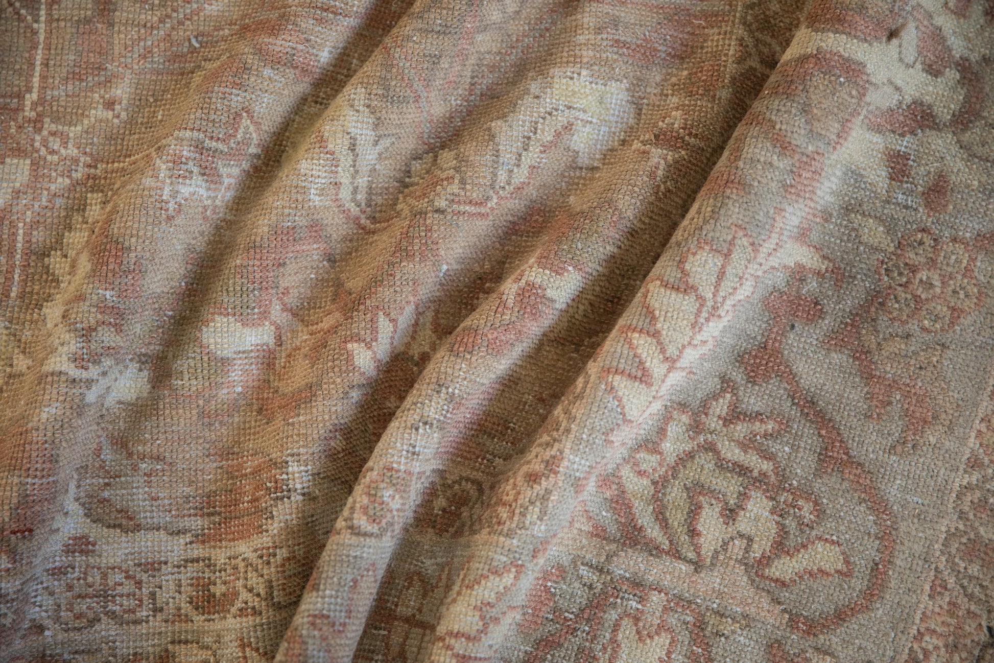 :: Covered field of serrated leaf willow tree style designs with pomegranate germinating plants, blossom cross-sections, and vinery interconnecting all. Colors and shades include: Platinum, antique ivory, beige, oxidized silver, dusty copper red, faded slate blue, and more. Condition notes: Areas of foundation showing through with wear across to knot heads. Most of the original side cord selvages are intact or restored. Fully secured sides and ends. Two inch fabric backing sewn to the edge around the perimeter of the reverse of the carpet. This rug is ideally suited for low to moderate traffic areas deeper inside the home. Recently professionally cleaned ready for in-home use! Many years of enjoyment to come with this hand knotted Persian Sultanabad carpet made in Persia circa 1920's vintage. Size measures 6'11" x 8'6".