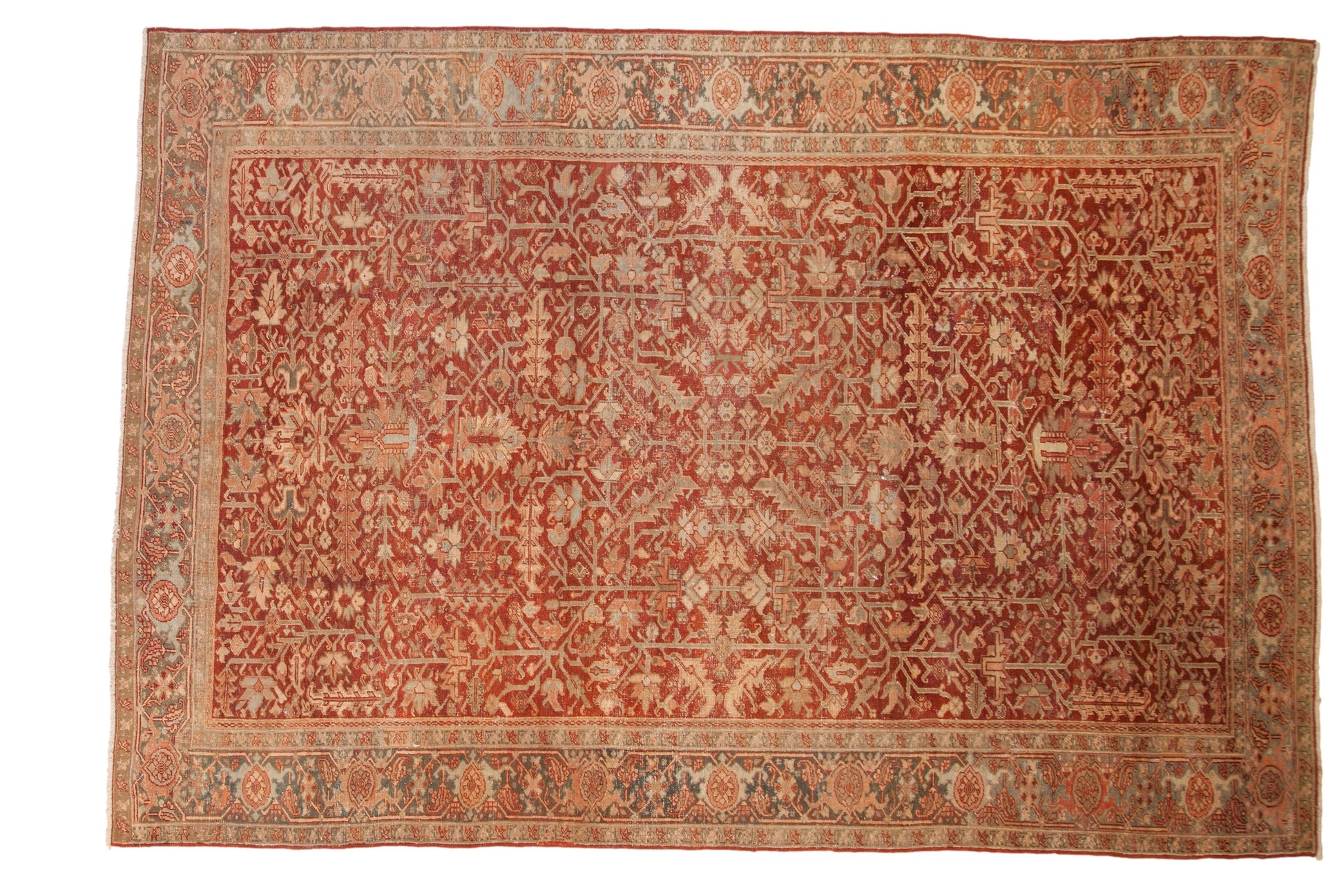 :: Allover covered field in scrolled serrated leaves, geometric vines, palmette blossoms, and interconnecting vinery throughout. Main border in a partial Herati and Turtle Samovar design motif. Colors and shades include: Deep burgundy wine red, black cherry red, dusty teal, ivory, beige, dusty blush, sandalwood, oxidized silver, silver, and more. Condition notes: Mostly even wear across to knot heads with small isolated areas of foundation showing through. Most of the original side cord selvages are intact or restored. Fully secured sides and ends. Localized areas of expert restoration and reweave with both outer minor borders fully, and expertly, restored. Recently professionally cleaned ready for in-home use! Many years of enjoyment to come with this hand knotted Persian Heriz carpet made in Persia circa 1950's vintage. Size measures 7'10" x 11'3".