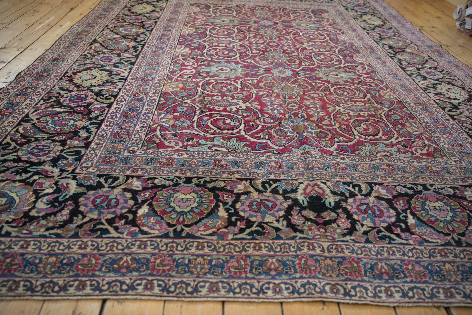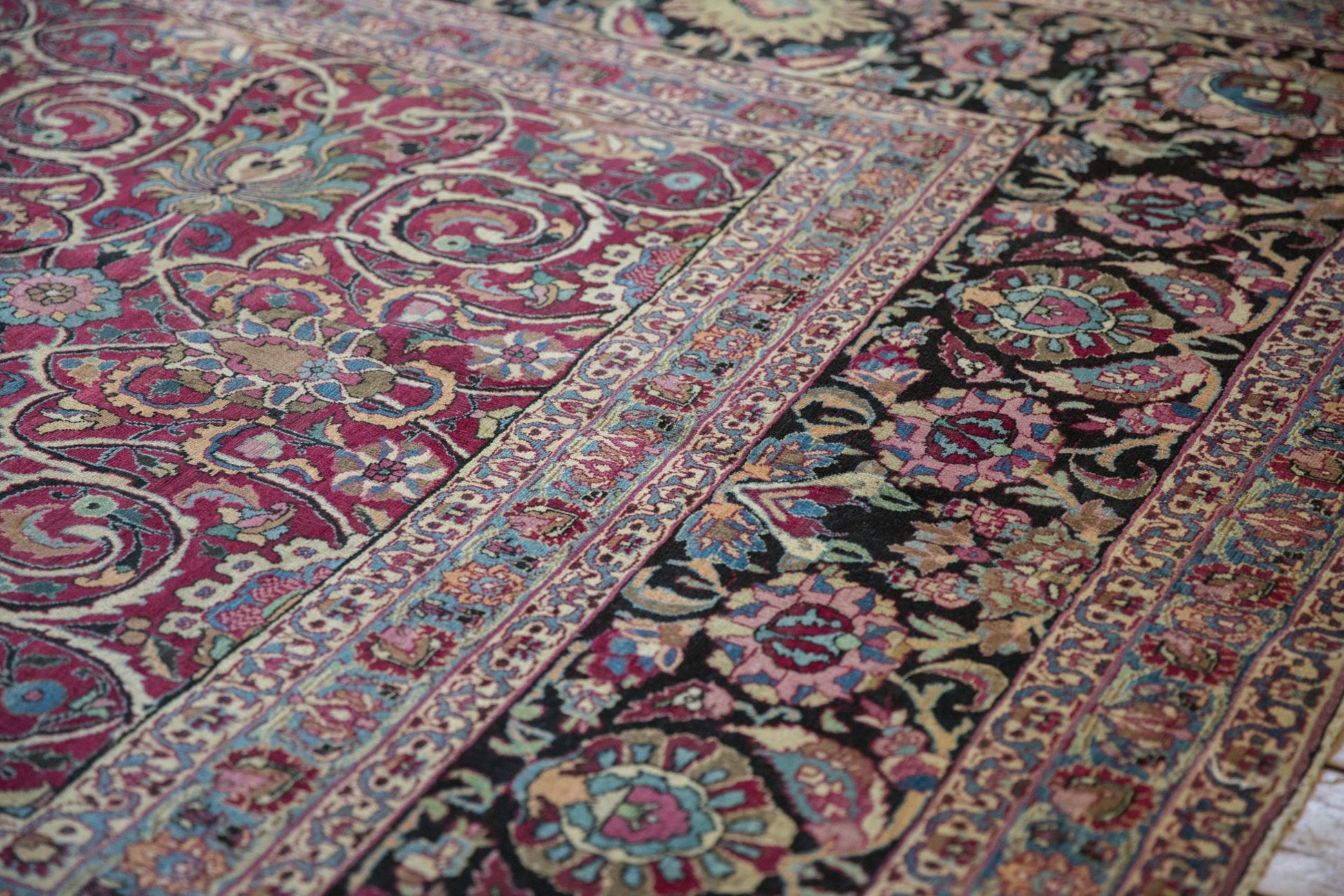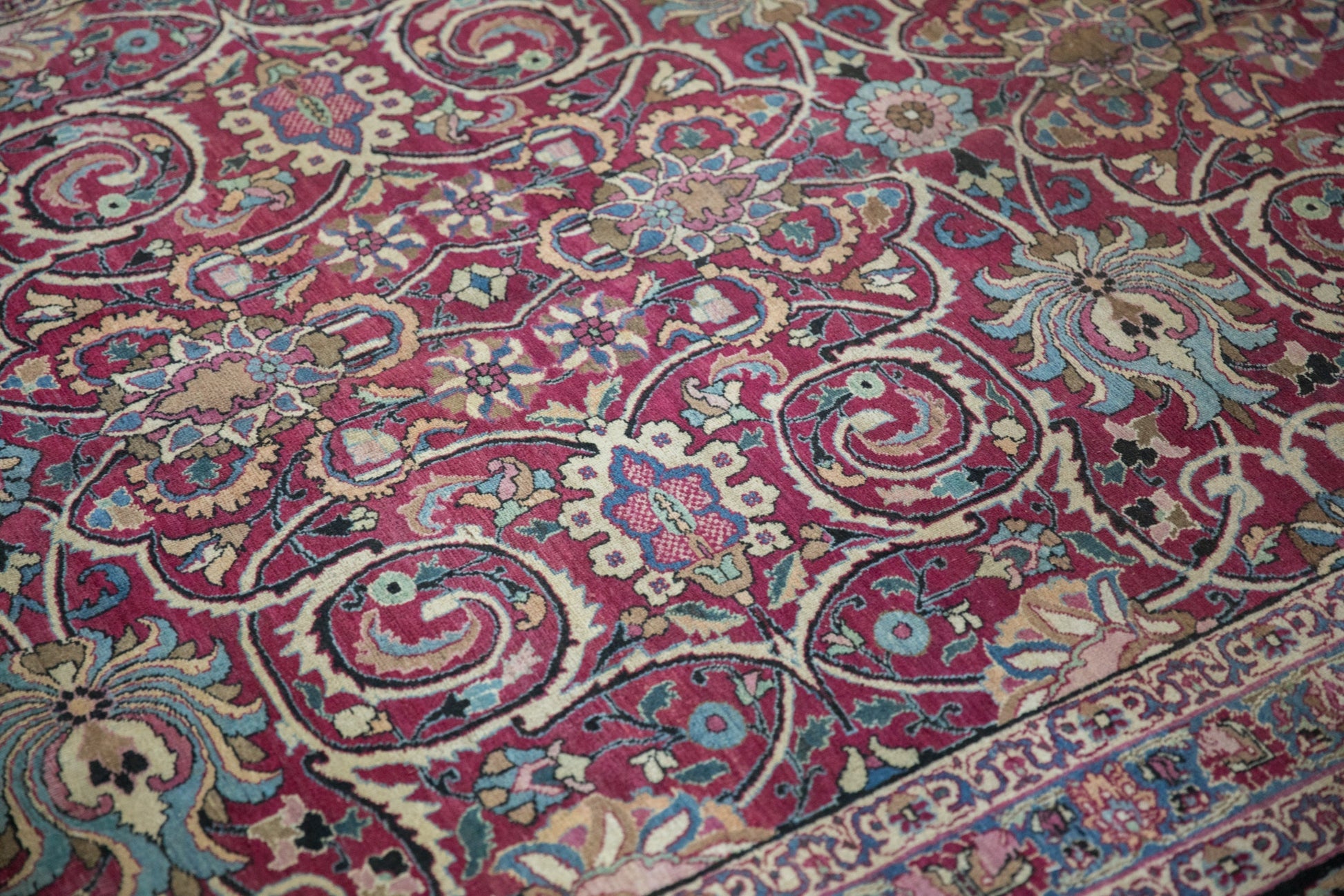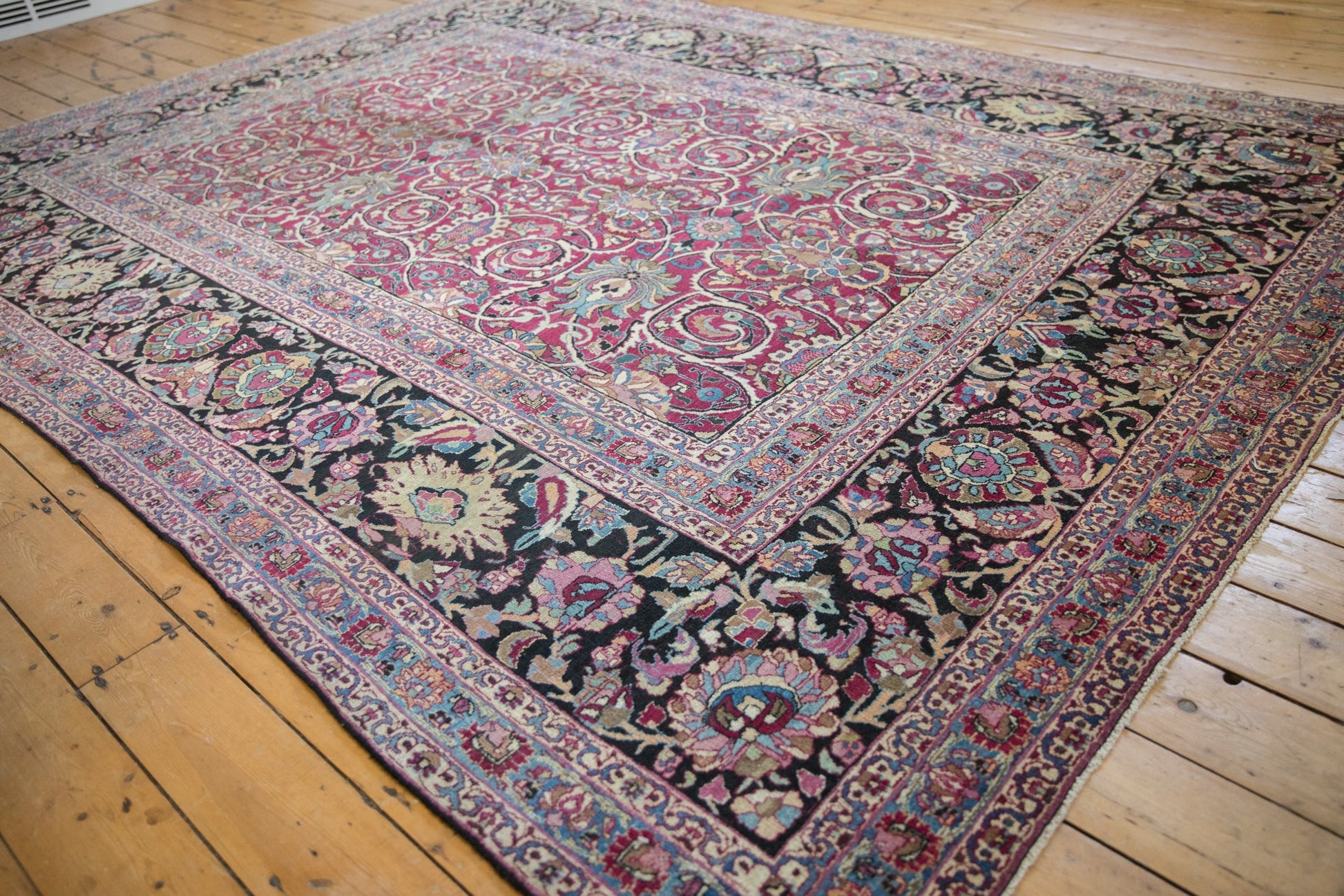:: Allover covered field in scrolling arabesques with cloudband ribboned floral vines therein and lotus flower cross-sections throughout. Wide banded main border and a dramatic visual impact. Colors and shades include: Deep magenta, navy blue black, ivory, powder blue, dark cherry red, cochineal red, indigo blue, and more. Condition notes: Areas of pile and knot heads. Fully secured sides and ends. Possible localized areas of touchups to 2'x2' area of the main field. Recently professionally cleaned ready for in-home use! Many years of enjoyment to come with this hand knotted Persian Meshed carpet made in Persia circa 1920's vintage. Size measures 8'2" x 10'9".