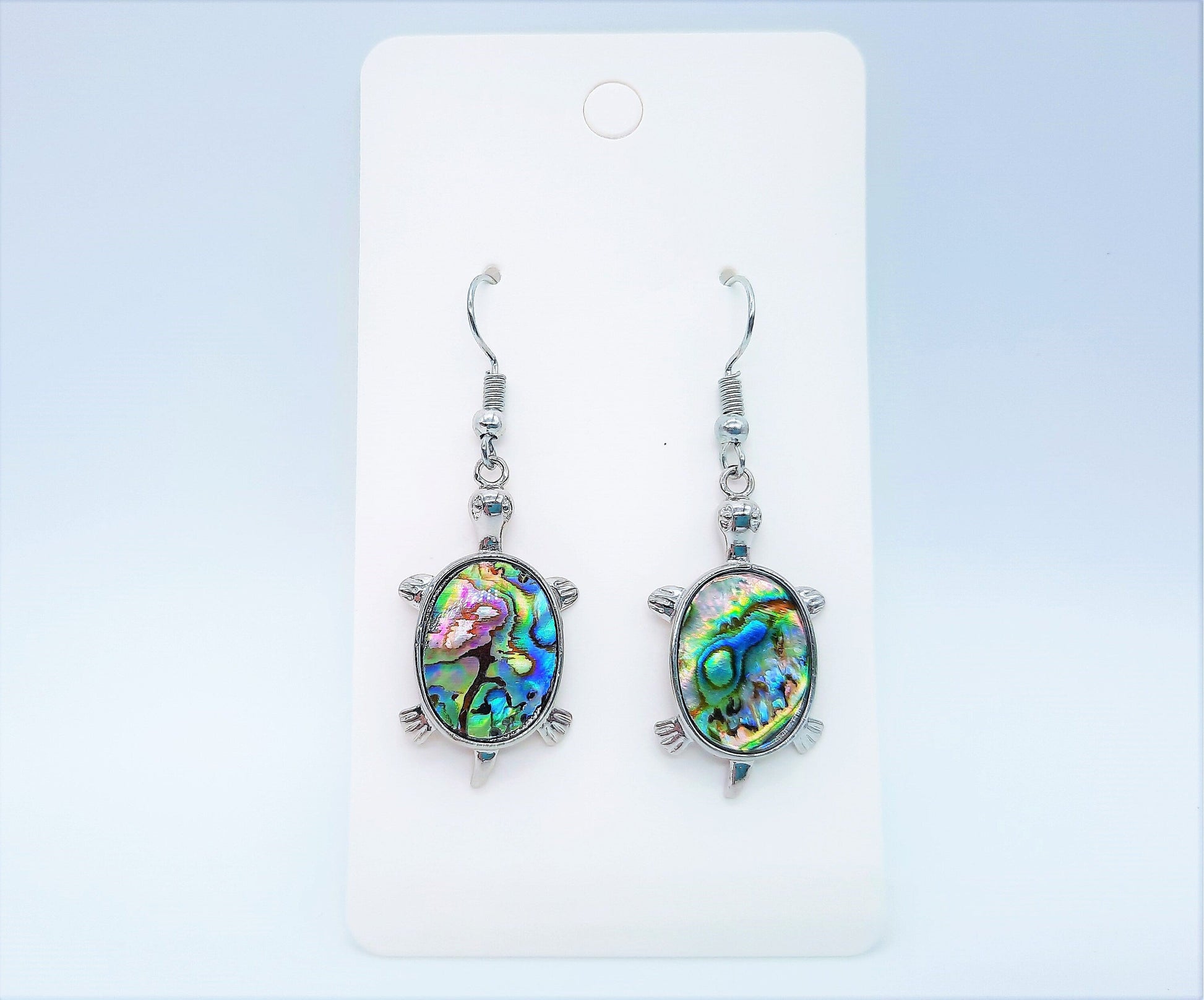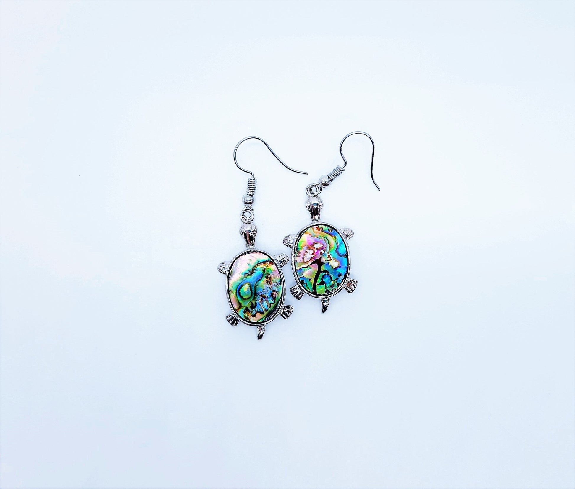 Handcrafted / Handmade Abalone / Paua Sea Turtle Dangle Earrings - Hypoallergenic Stainless Steel Hooks- Silver-Coated Brass Earrings.