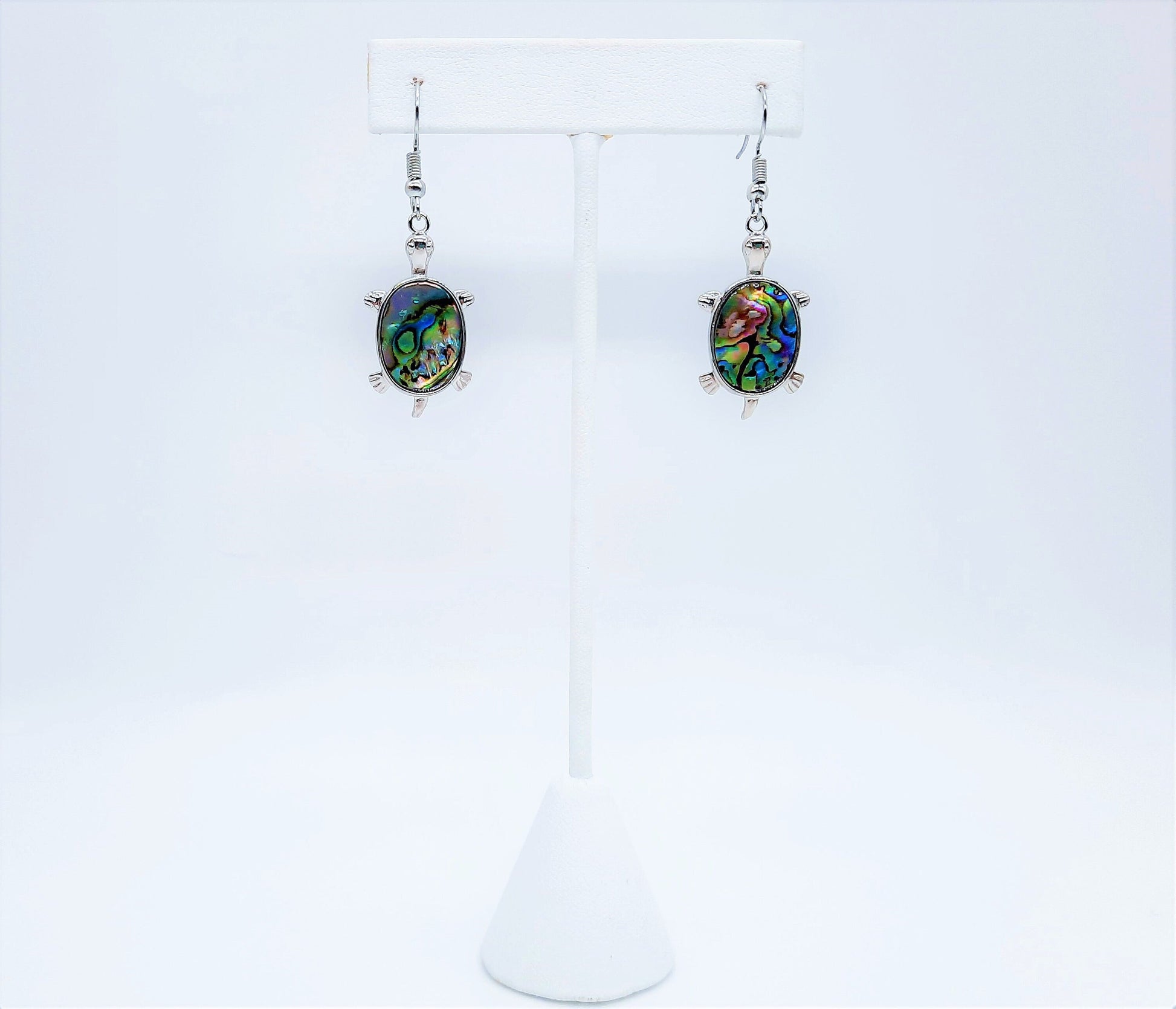 These earrings boast a metallic frame shaped like a turtle; the top of the turtle boasts a large piece of iridescent, blue-green abalone shell that shimmers and changes in the light. Comes with stainless steel ear wire hooks.