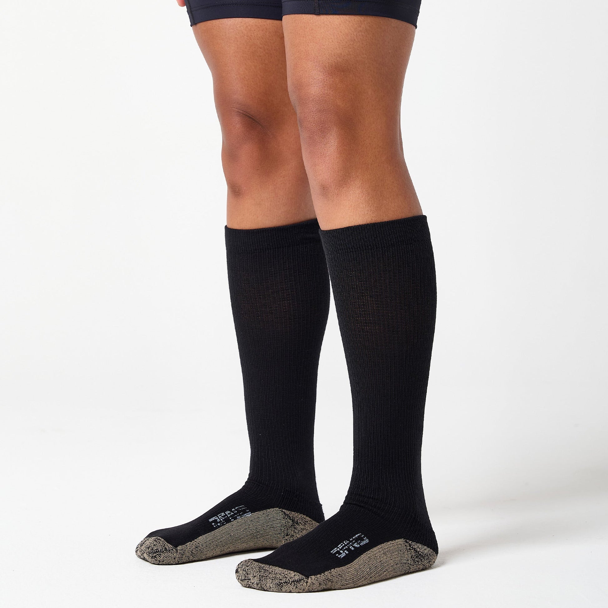 Over the calf moderate support sock with moisture management and anti-microbial finish. This specifically designed ACTIVE Ax sports performance sock combines the therapeutic benefits of graduated compression with a pillow soft cushioned foot bed and seamless to construction. This sock offers relief and comfort to the athlete.