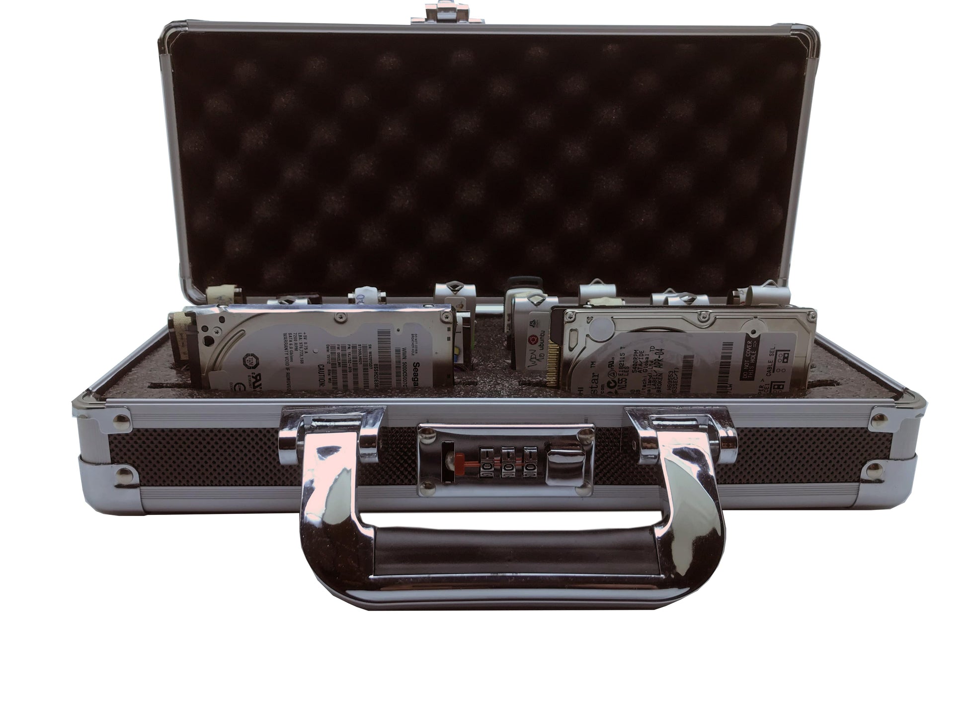 High-capacity aluminum organizer with combo lock and carry handle — holds 24 USB drives plus 2 accessory bays. Keep installers, recovery media, adapters and readers protected, labeled and ready for field work, classrooms, or your desk.