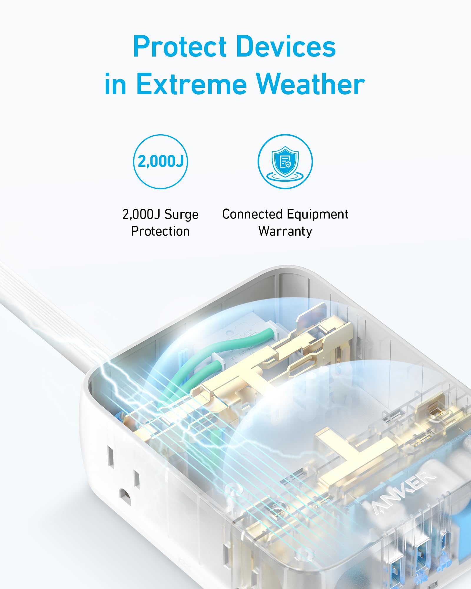 • Built-In 2000J Surge Protection: Keeps your connected devices safe from sudden power surges and voltage spikes, even in a storm.