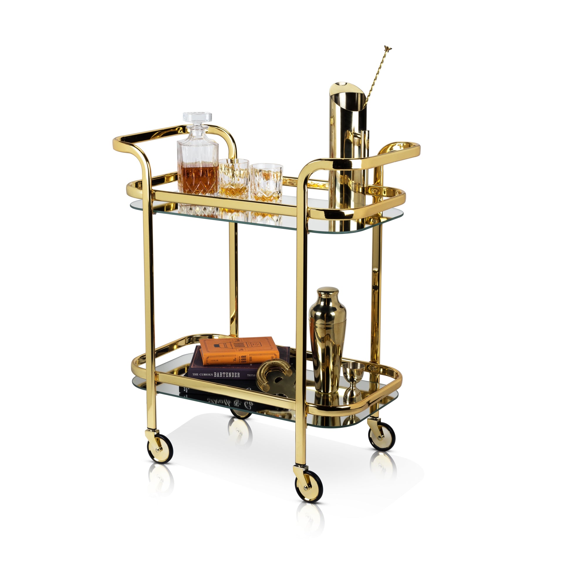 Beautiful barware deserves to be displayed with decorous style. Constructed from stainless steel with a gold finish, the Belmont bar cart succeeds in doing just that. Rubber-lined wheels make hosting a breeze, while dual mirror shelves reflect back the curated bar tools, stemware, and liquor that sit on each tier.