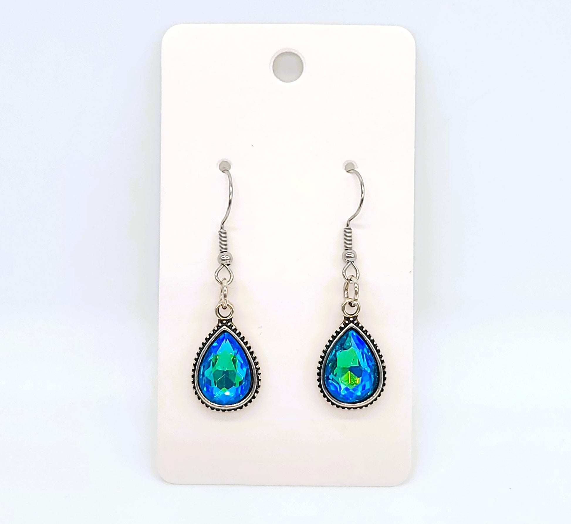 These beautiful pendant earrings feature teardrop shaped teal blue rhinestones in a metal setting.