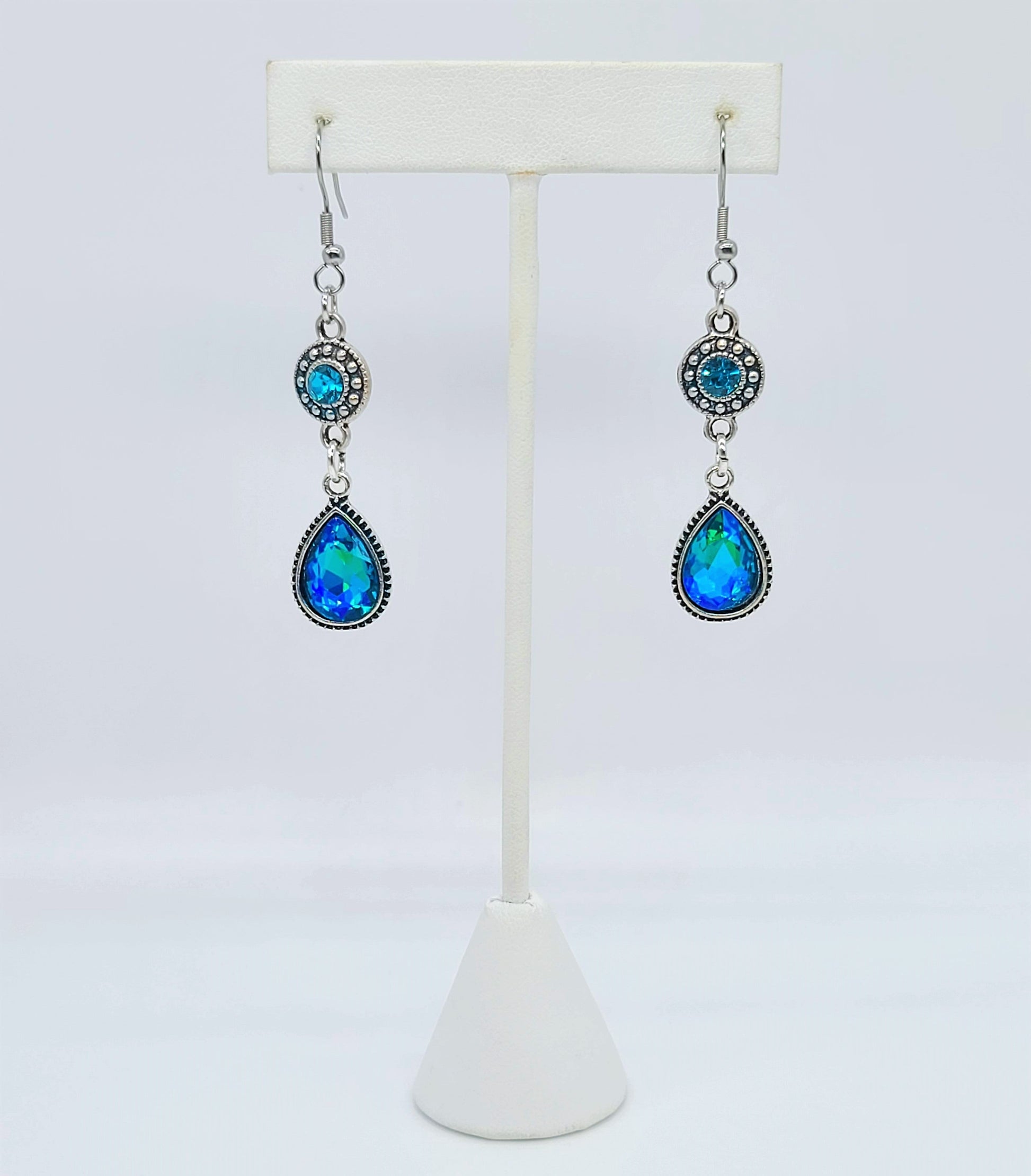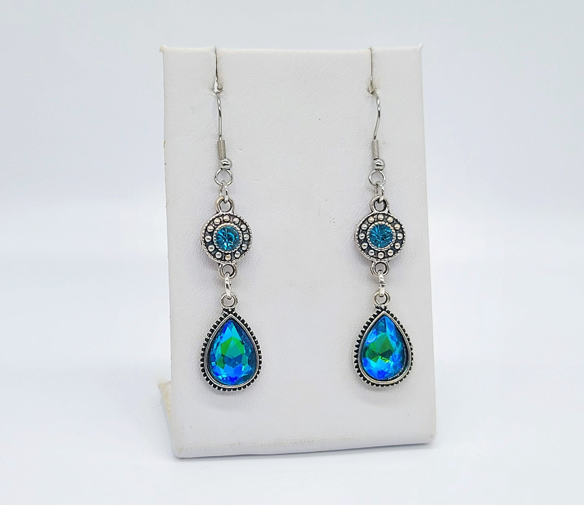 These beautiful pendant earrings feature teardrop shaped teal blue rhinestones in a metal setting.