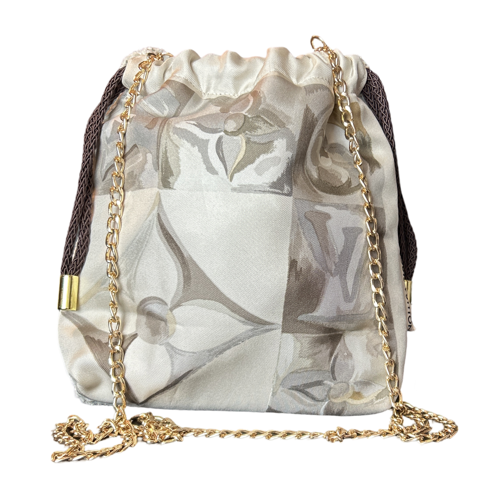 Reimagined from the world’s finest collection of vintage Louis Vuitton scarves, our drawstring bag is the ultimate accessory for your on-the-go lifestyle. Uniquely convertible from a crossbody to a handheld bag with both removable goldtone chain and silky drawstring cord.