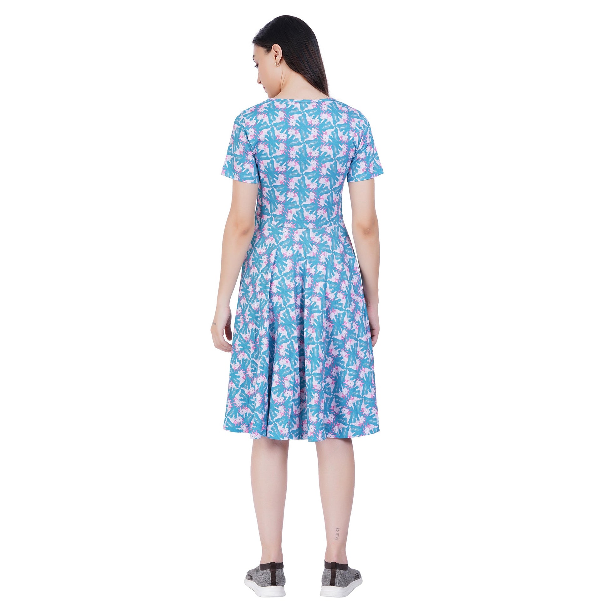 - Short-sleeve, scoop-neck, 3/4th circle twirl adult dress with pockets