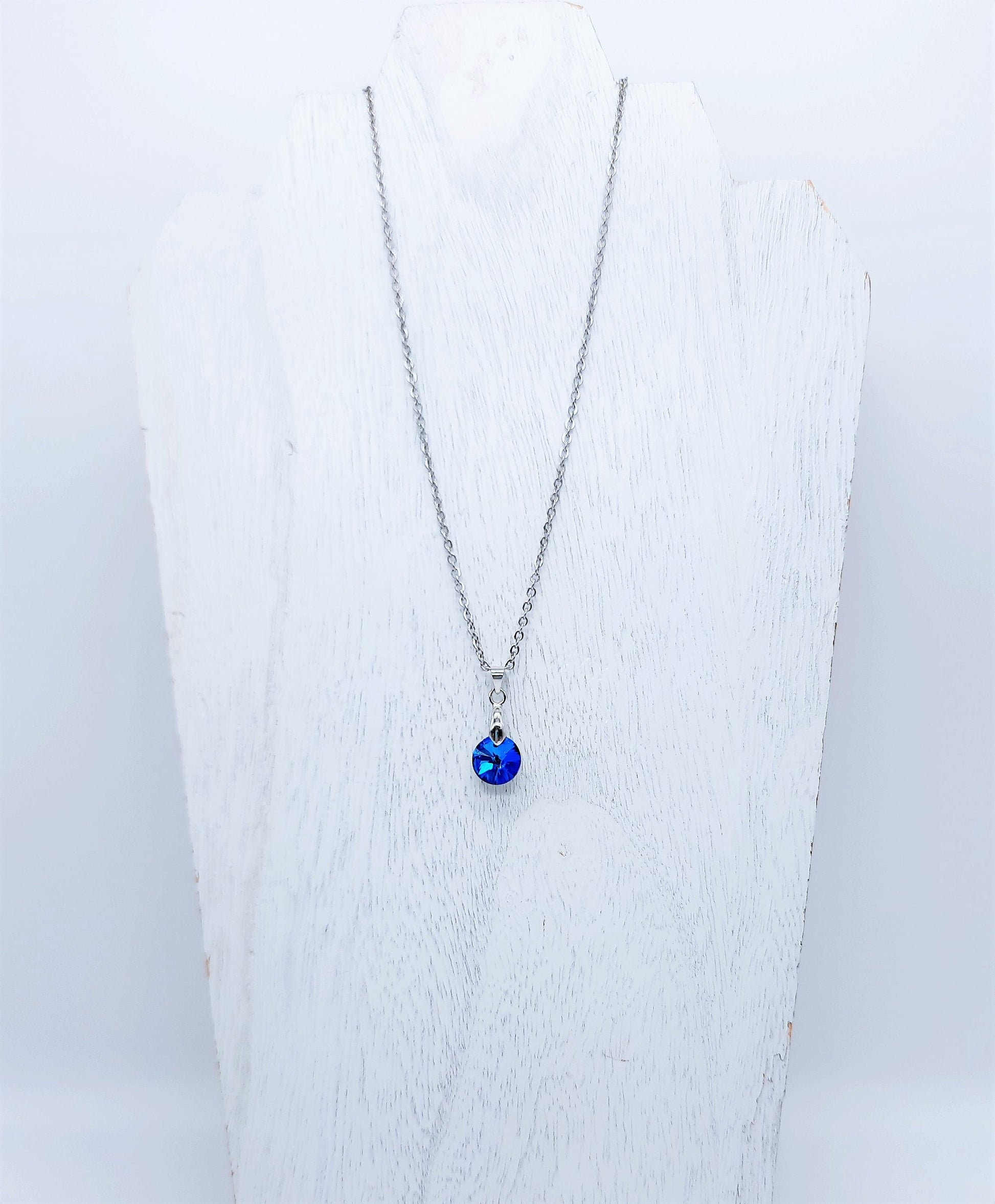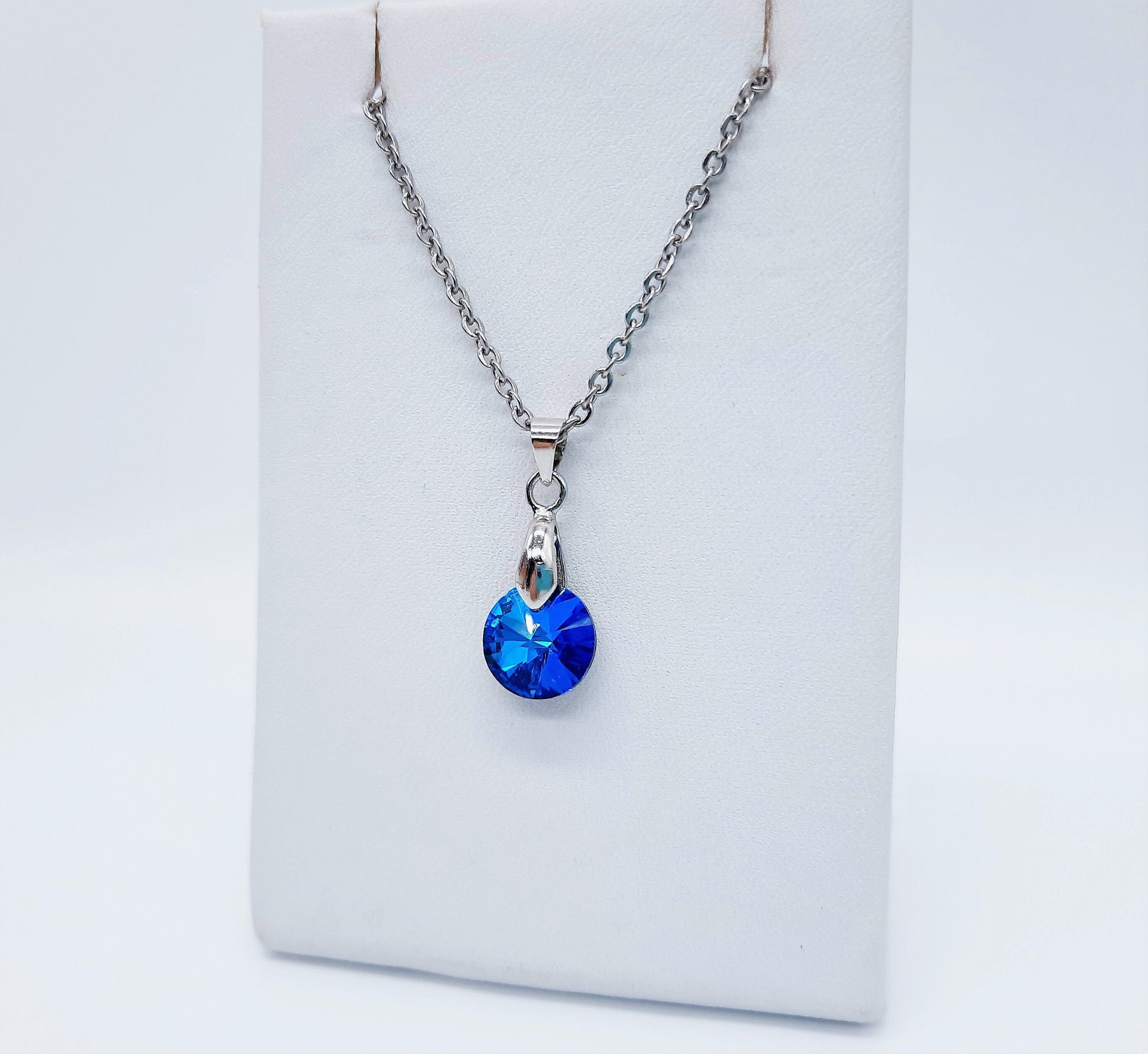 Handcrafted Multifaceted Bermuda Blue Round Glass Rhinestone Pendant Necklace - Hypoallergenic Stainless Steel Chain - Blue Zircon Look.