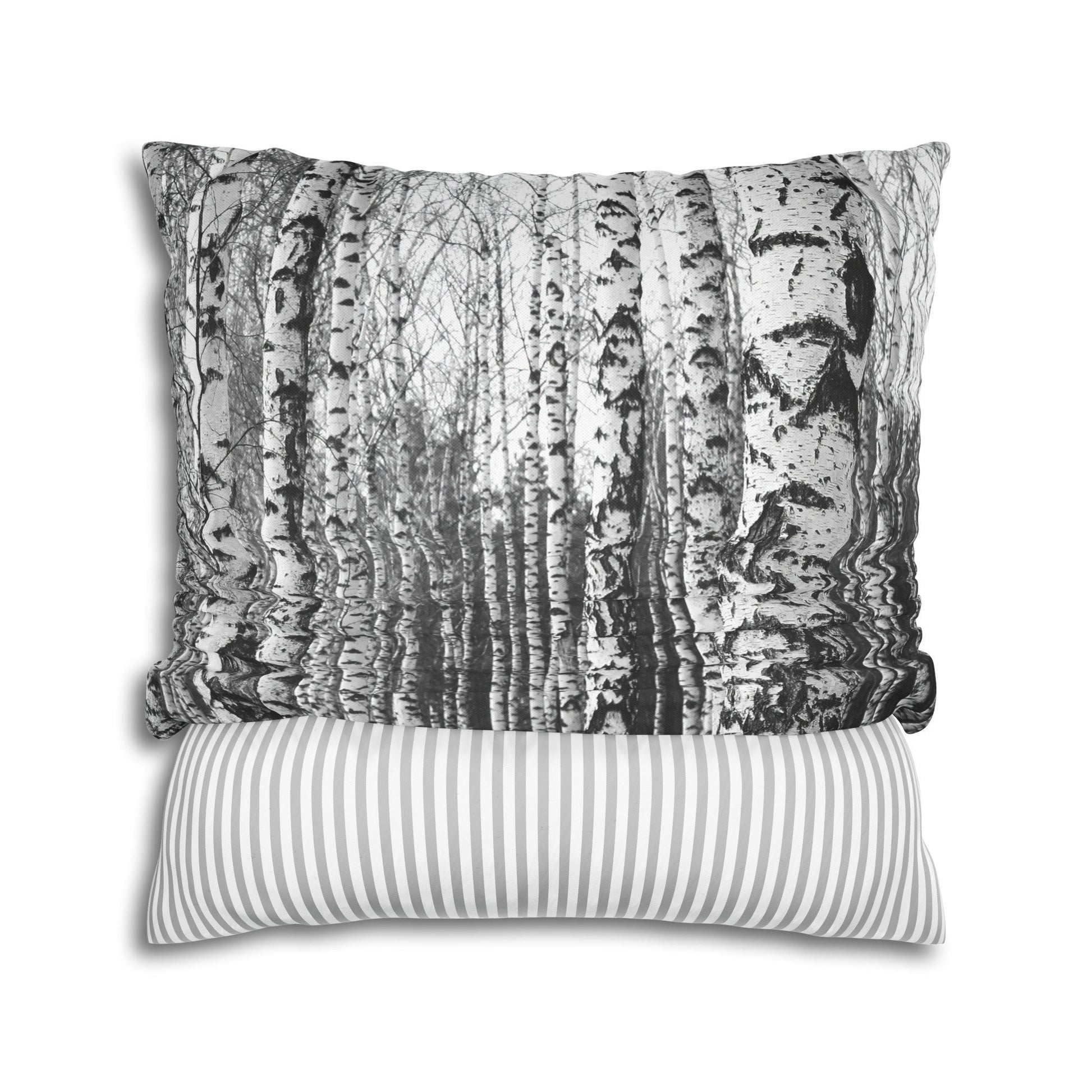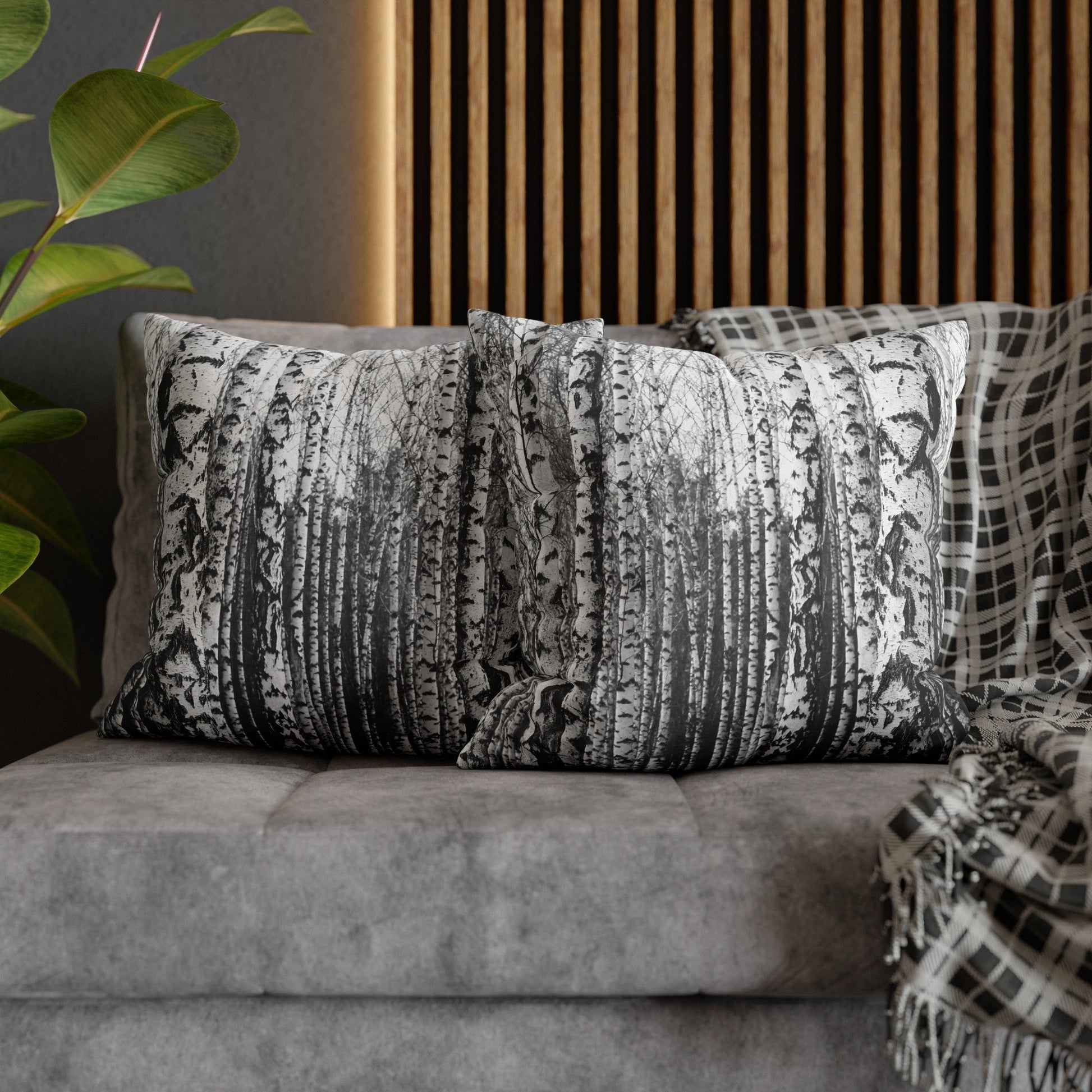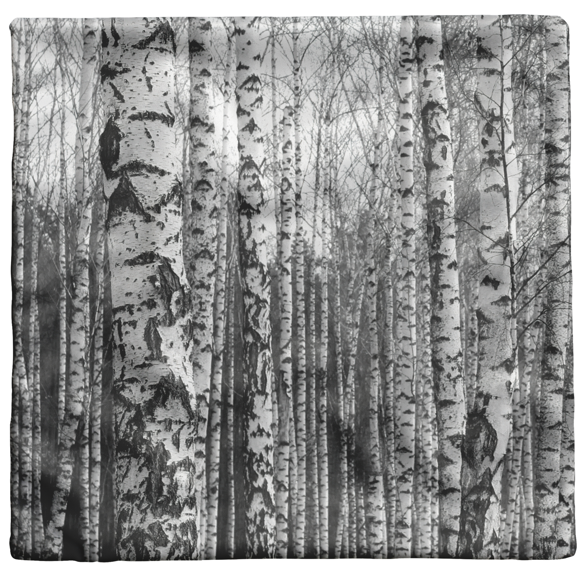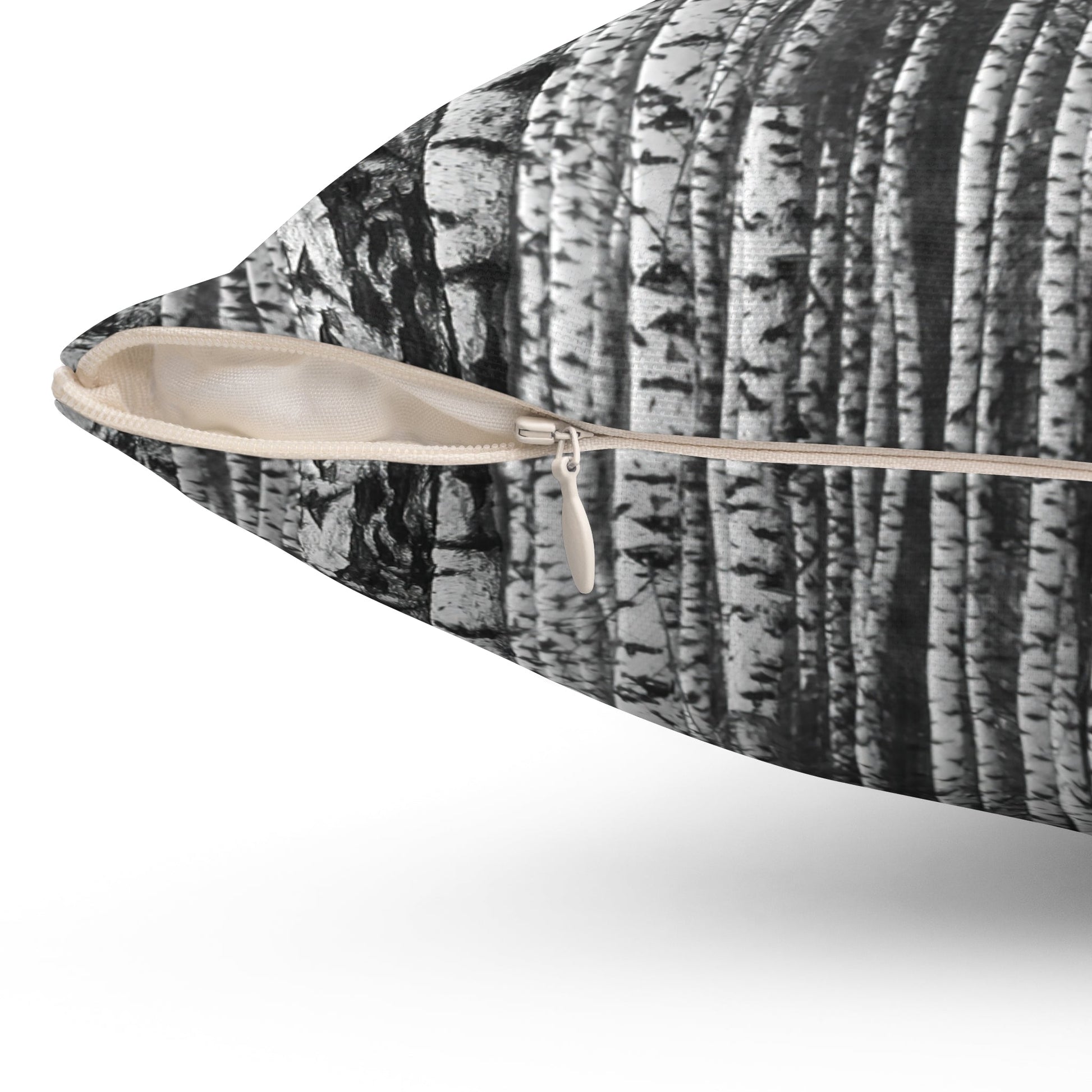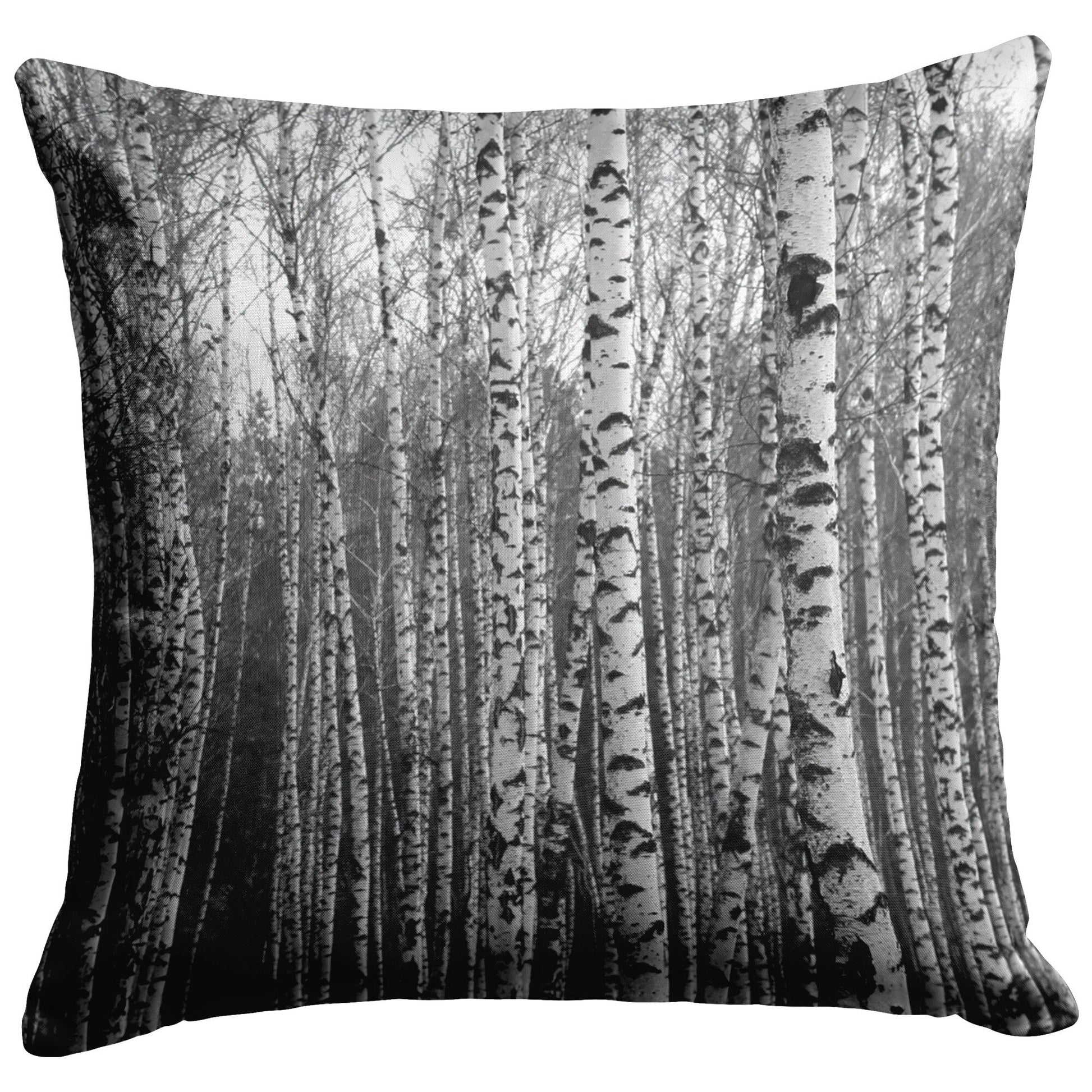 Add a touch of nature and elegance to your home with this stunning throw pillow. This pillow features a high-quality photograph of a birch forest in winter, with crisp white sky and dark tree trunks creating a striking contrast. The image captures the beauty and majesty of the natural world in a black and white photo. This pillow is perfect for any nature inspired, minimalist, lodge, cabin, cottage, mid-century, or rustic decor.