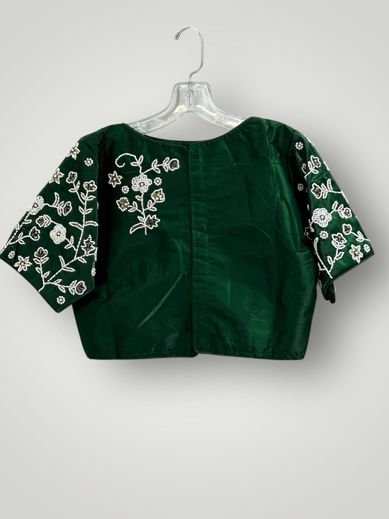 This dark green boat neck blouse is made with satin silk and features back hooks for a secure and comfortable fit. The smooth fabric adds an elegant touch to any outfit, making it perfect for formal occasions or everyday wear. With its stylish design and premium material, this blouse is a must-have for any wardrobe.