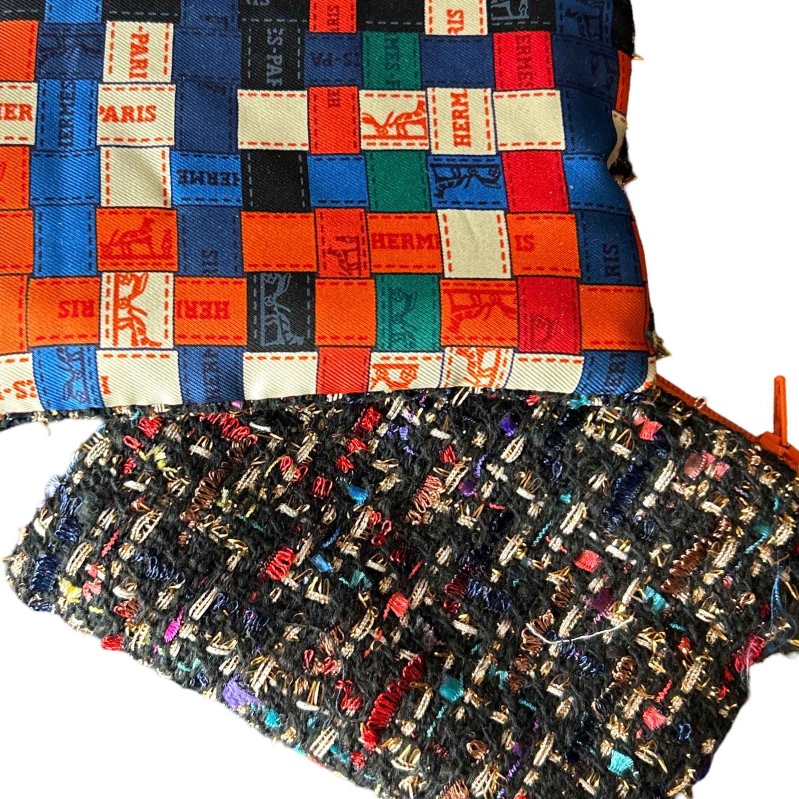 Vintage Hermès Bolduc Au Carrée scarf front paired with tweed reverse. Fully lined, zippered closure with removable gold-tone keyring and lobster clasp