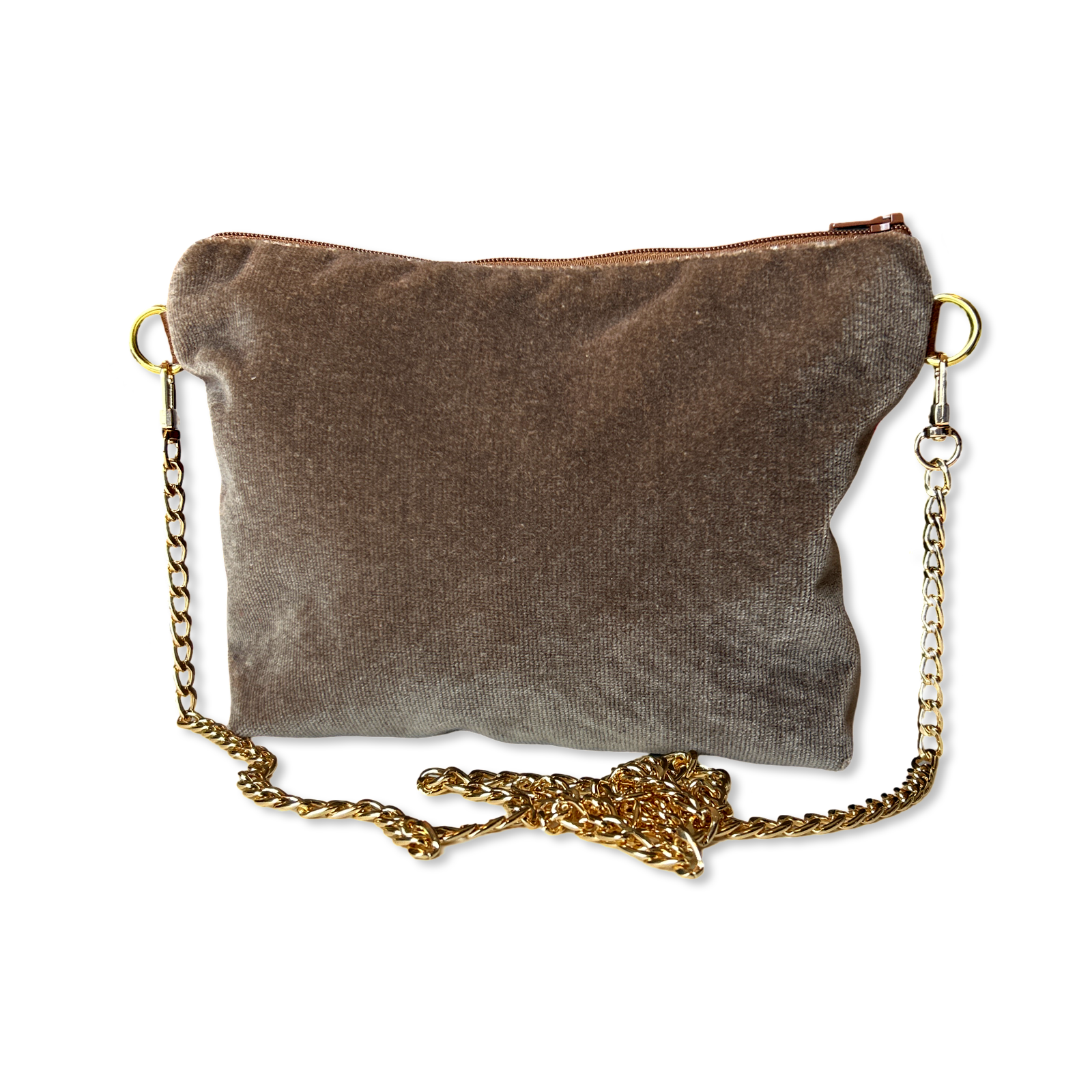 Vintage Hermes Bolduc Ribbon silk scarf front paired with coordinating taupe velvet reverse. Fully lined, zippered closure with removable 23" drop gold-tone crossbody chain.