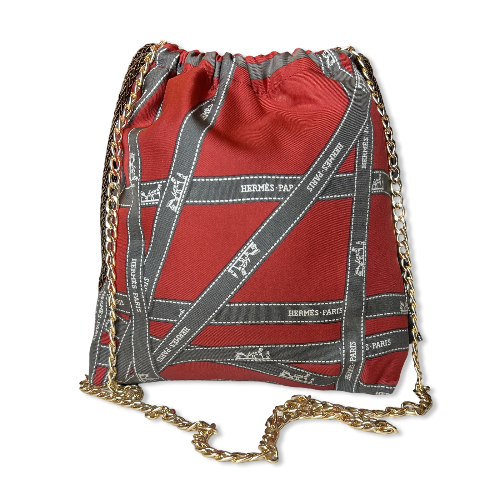 Reimagined from the world’s finest collection of vintage Hermès scarves, our drawstring bag is the ultimate accessory for your on-the-go lifestyle.  Uniquely convertible from a crossbody to a handheld bag with both removable goldtone chain and silky drawstring cord.