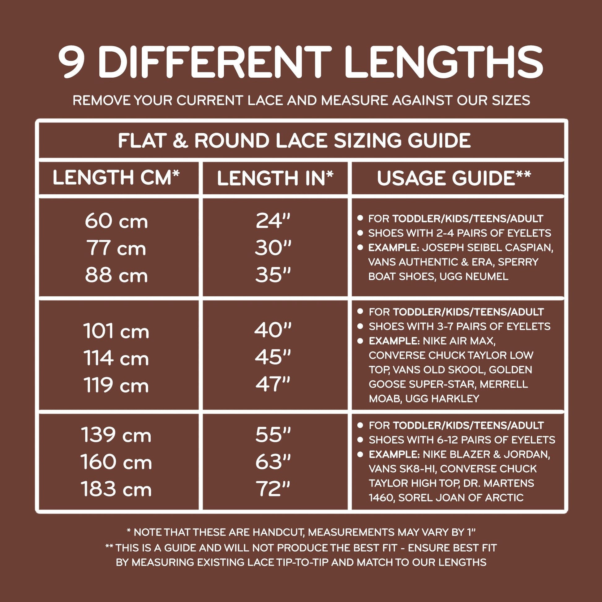 Flat laces measure 1/4 inch wide.