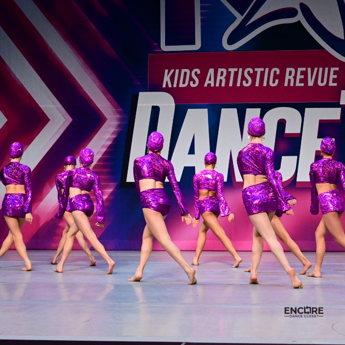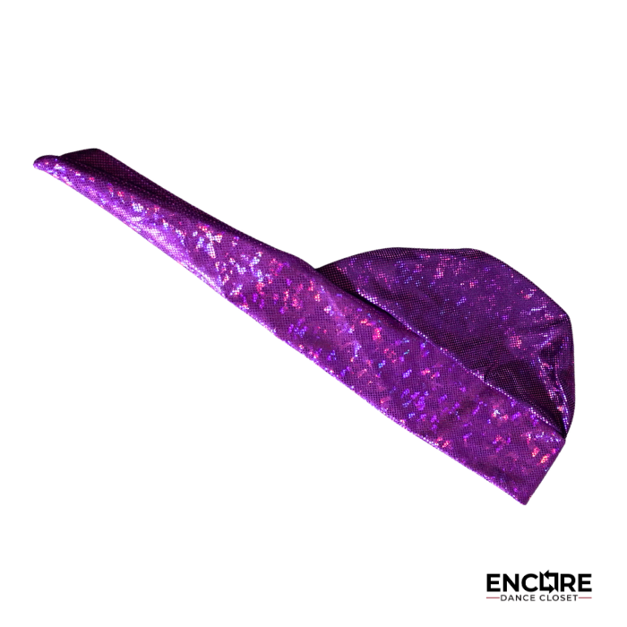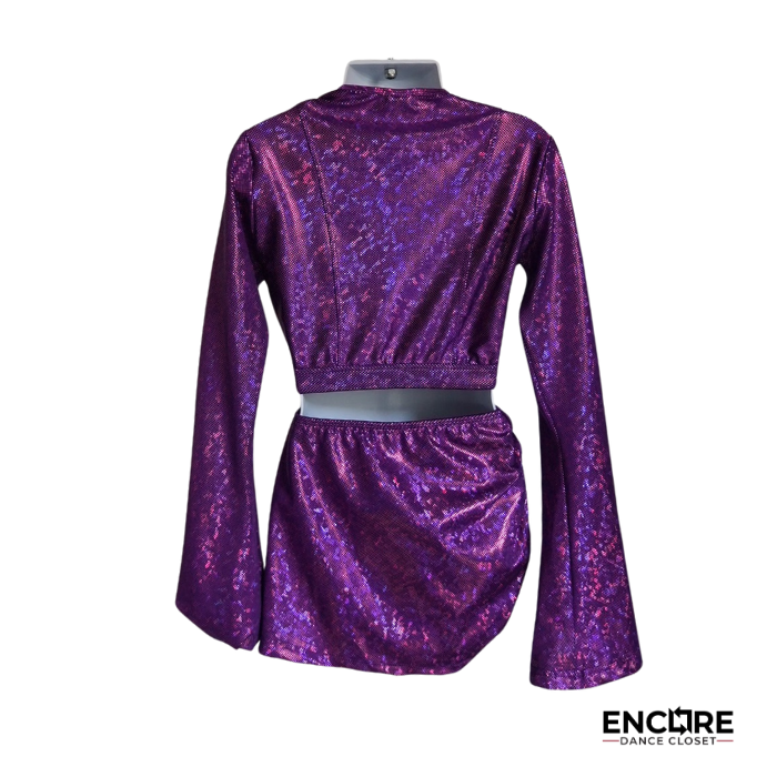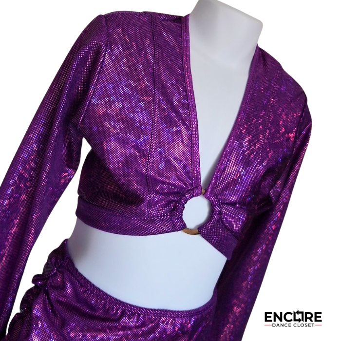 Total 80s glam! A metallic purple set with a bell-sleeved deep V top fastened with a silver hoop, ruched briefs, a flirty mini skirt, and a matching headpiece. Over-the-top and made to shine—just like your dancer.