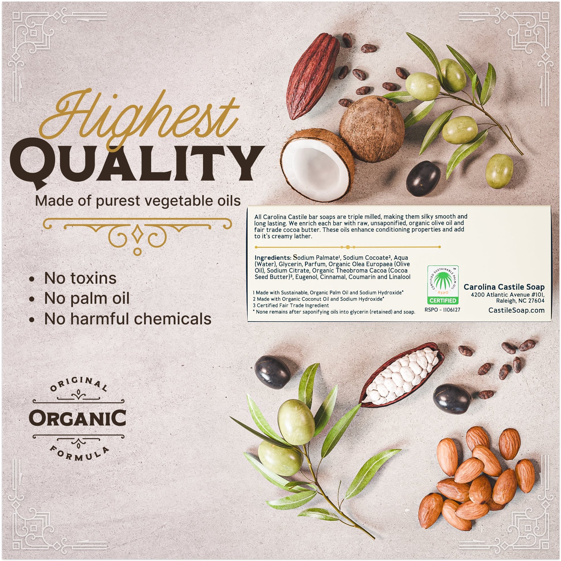 - Sodium Palmate (Organic Sustainable Palm Oil & Sodium Hydroxide*)
