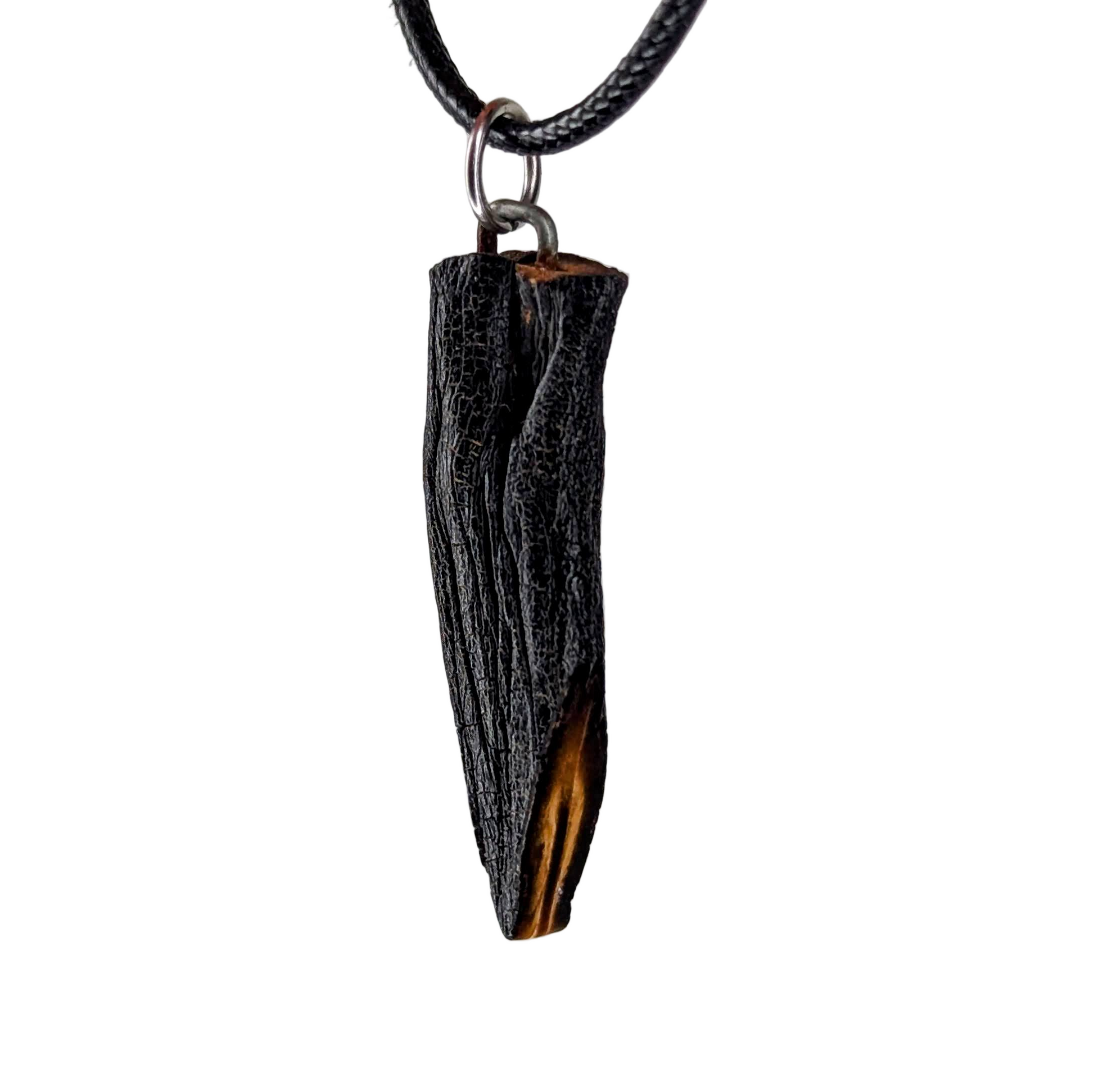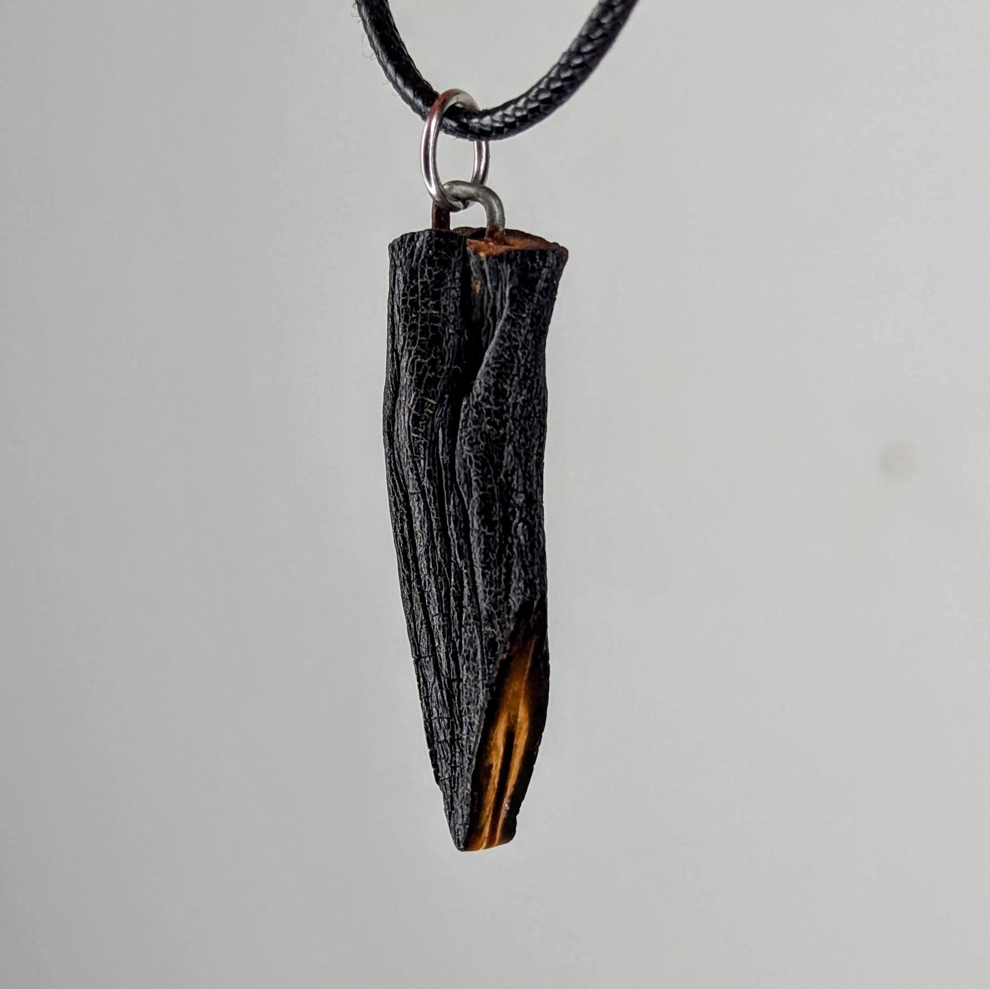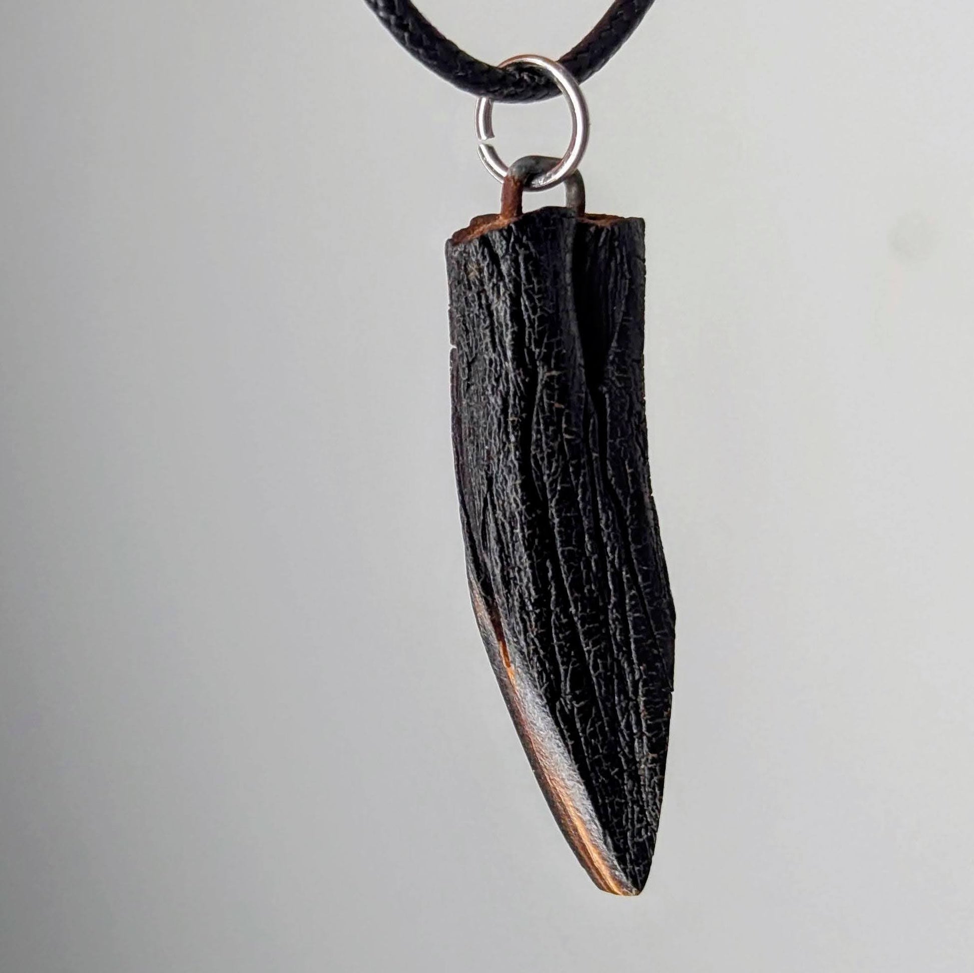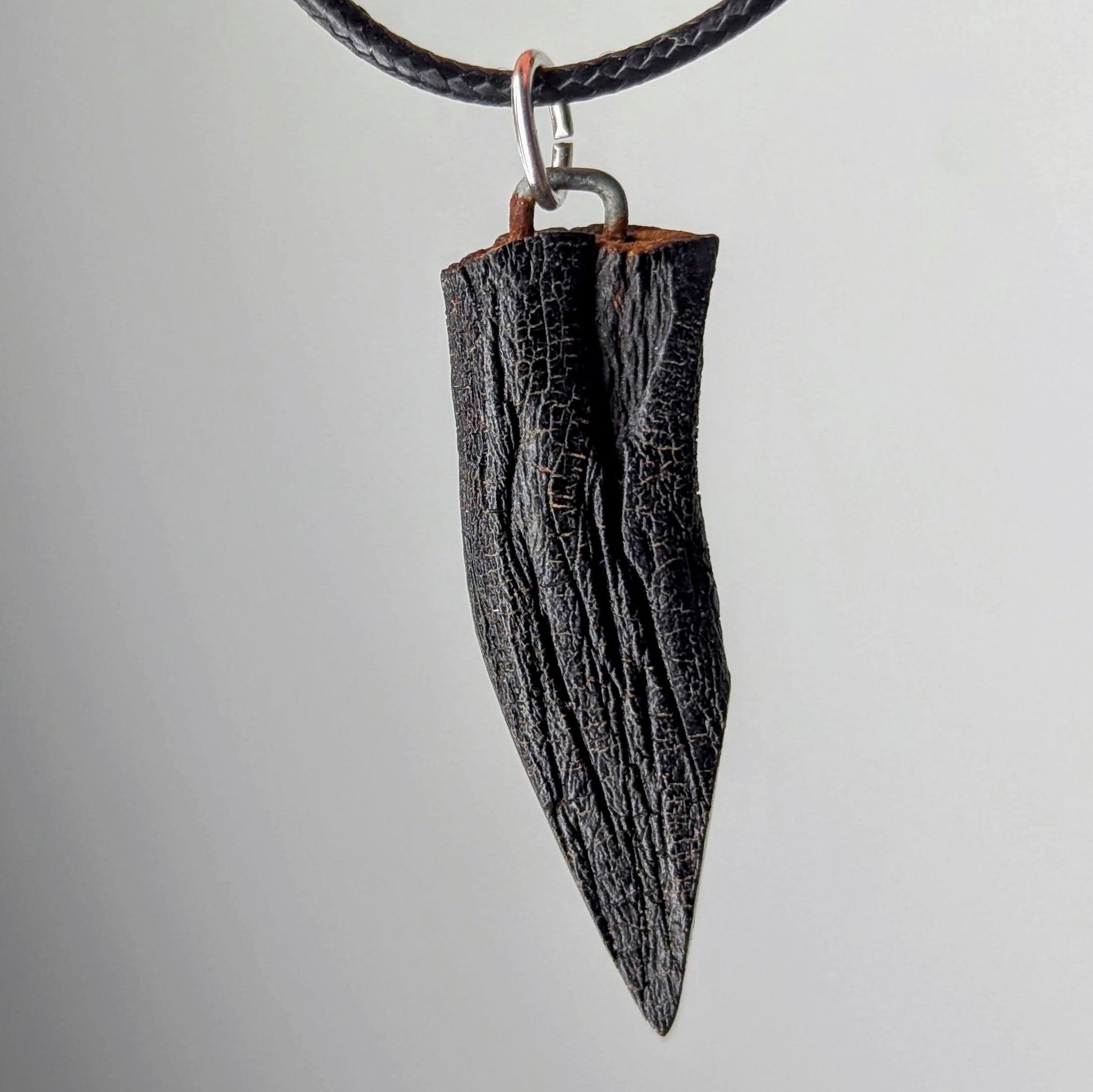 This pendant cuts through minimalism with the force of nature itself. Sculpted from real Heterokont algae, it evokes the silhouette of a claw, fang, or ancient blade—its surface deeply textured like cracked basalt, its edge tapering to a precise point. Faint bronze tones flash at the base like glints of buried fire, hinting at the organic material within.