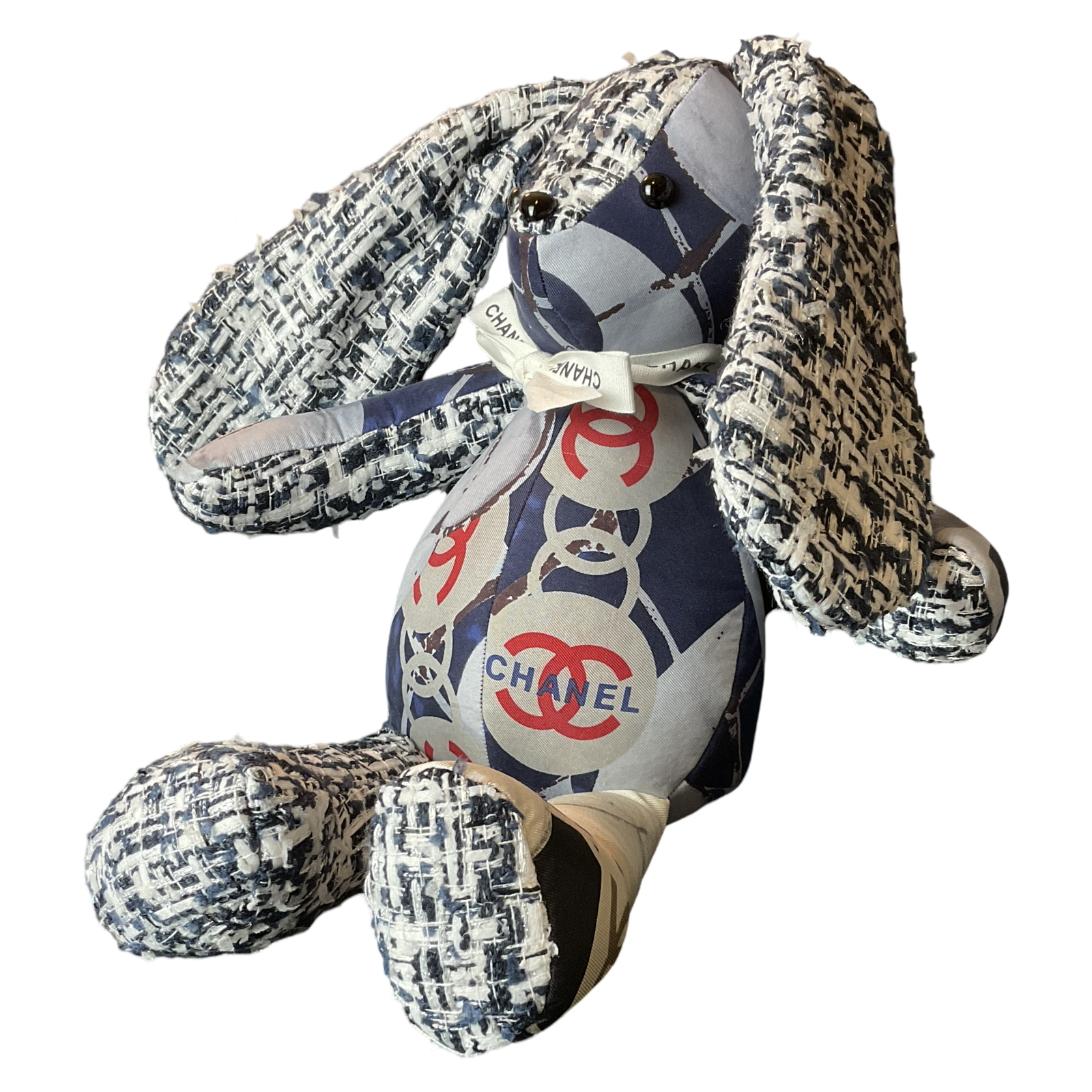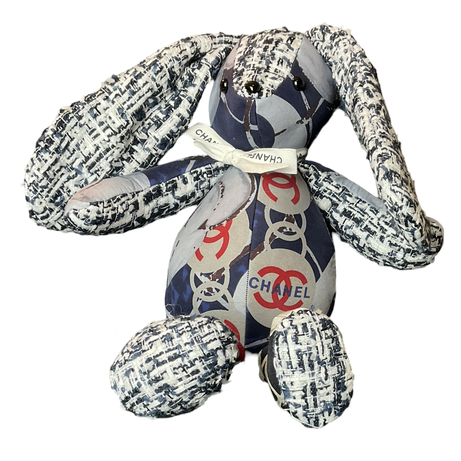 Vintage Chanel silk scarf and blue & white tweed cloth handmade into a one of a kind animal. Non-Allergenic polyfill stuffing. For decorative use only.