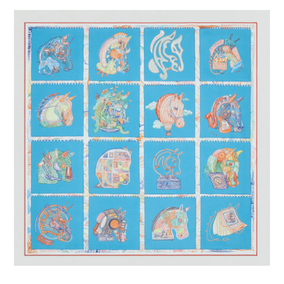 The scarf is a celebration of horses, a recurring motif in Hermès's designs, reflecting the brand's origins in saddlery and harness making