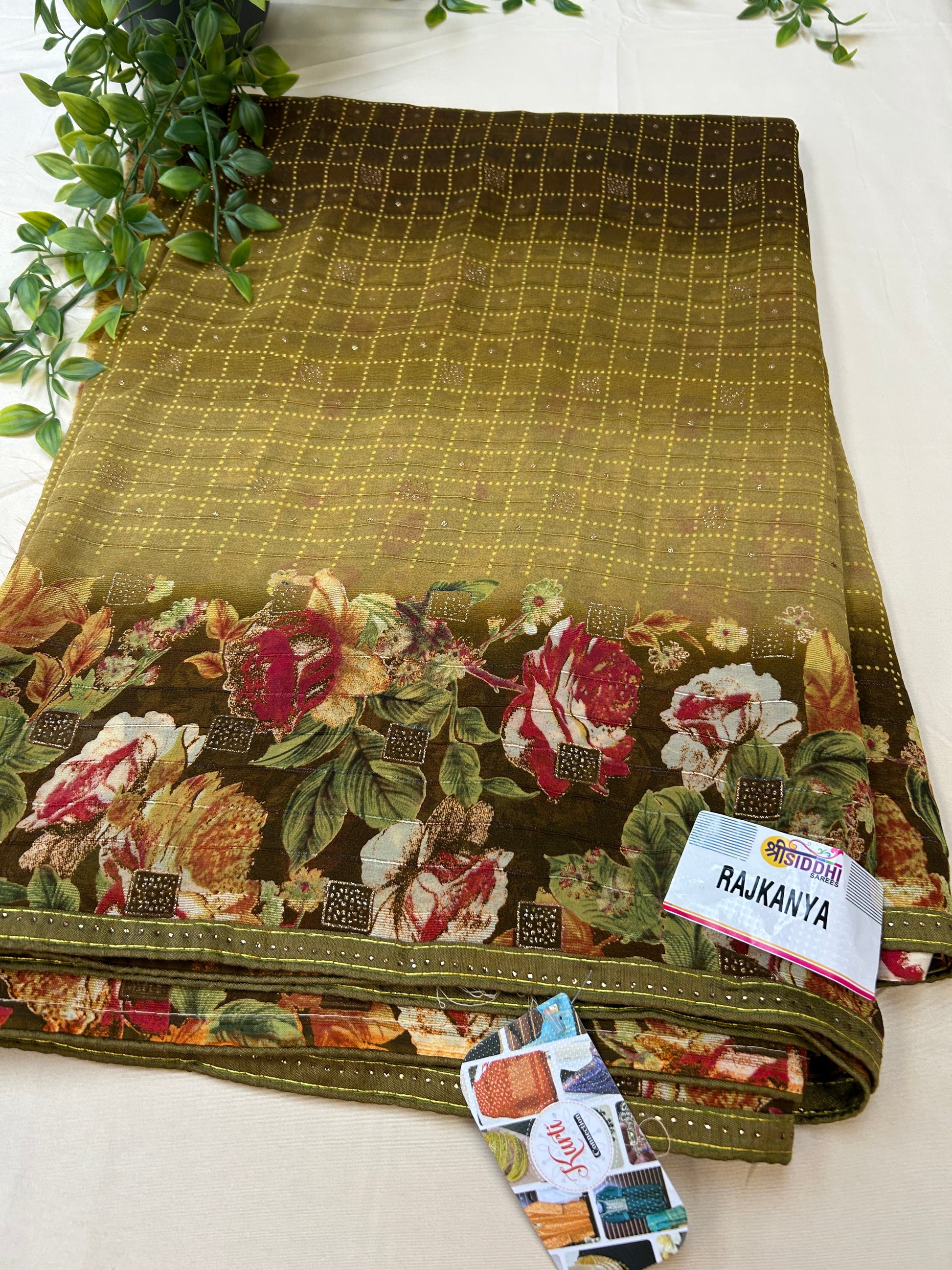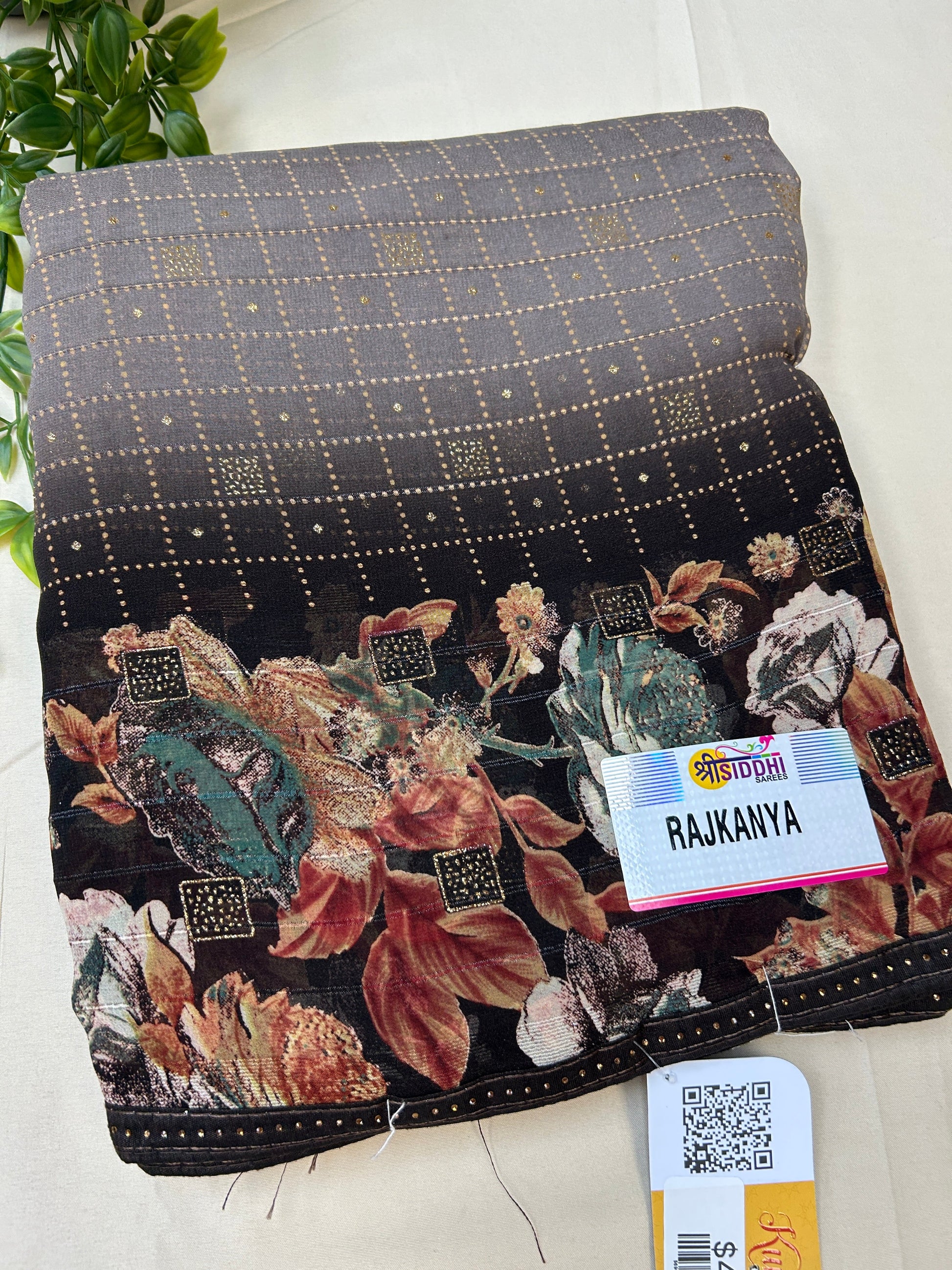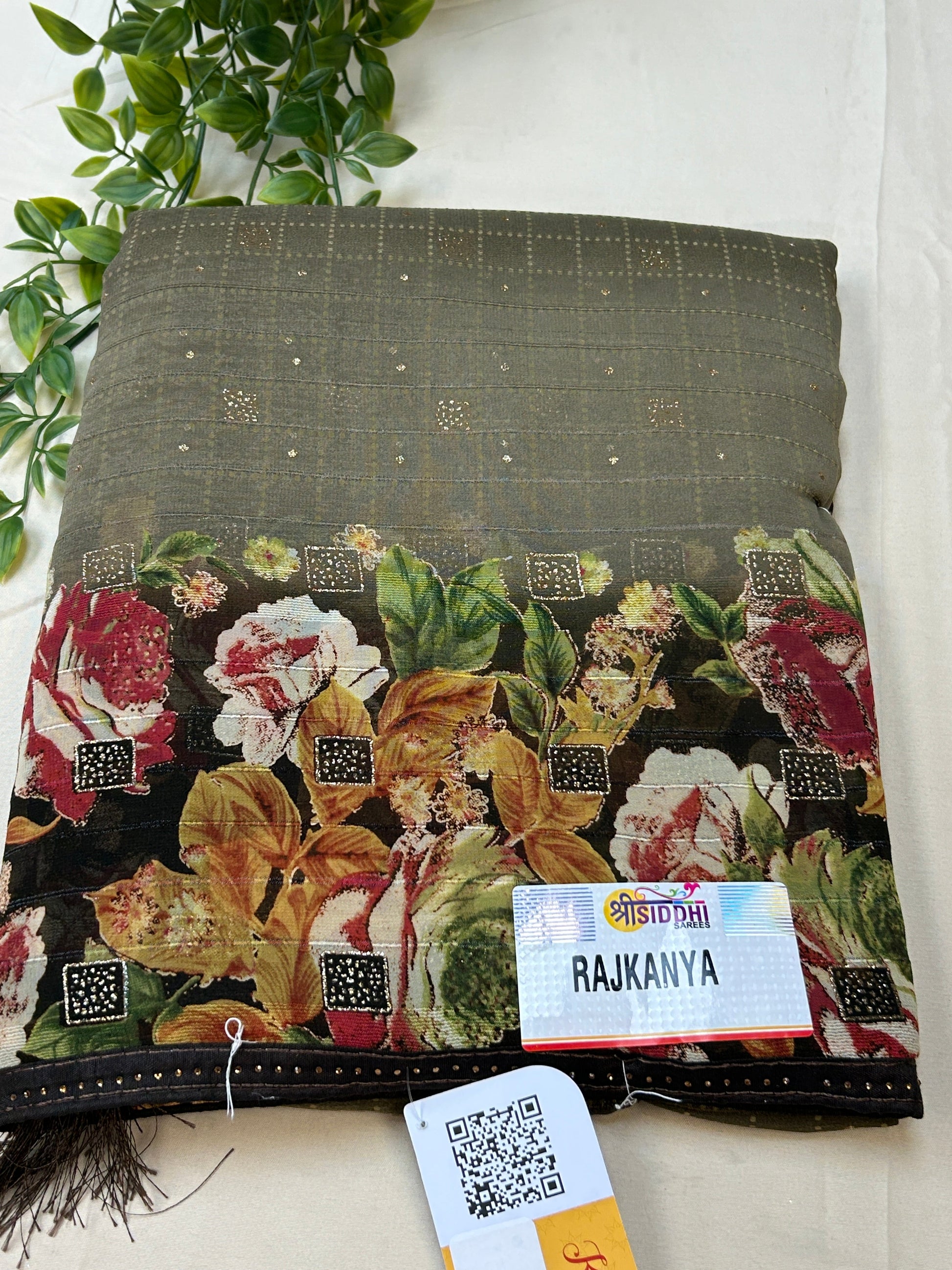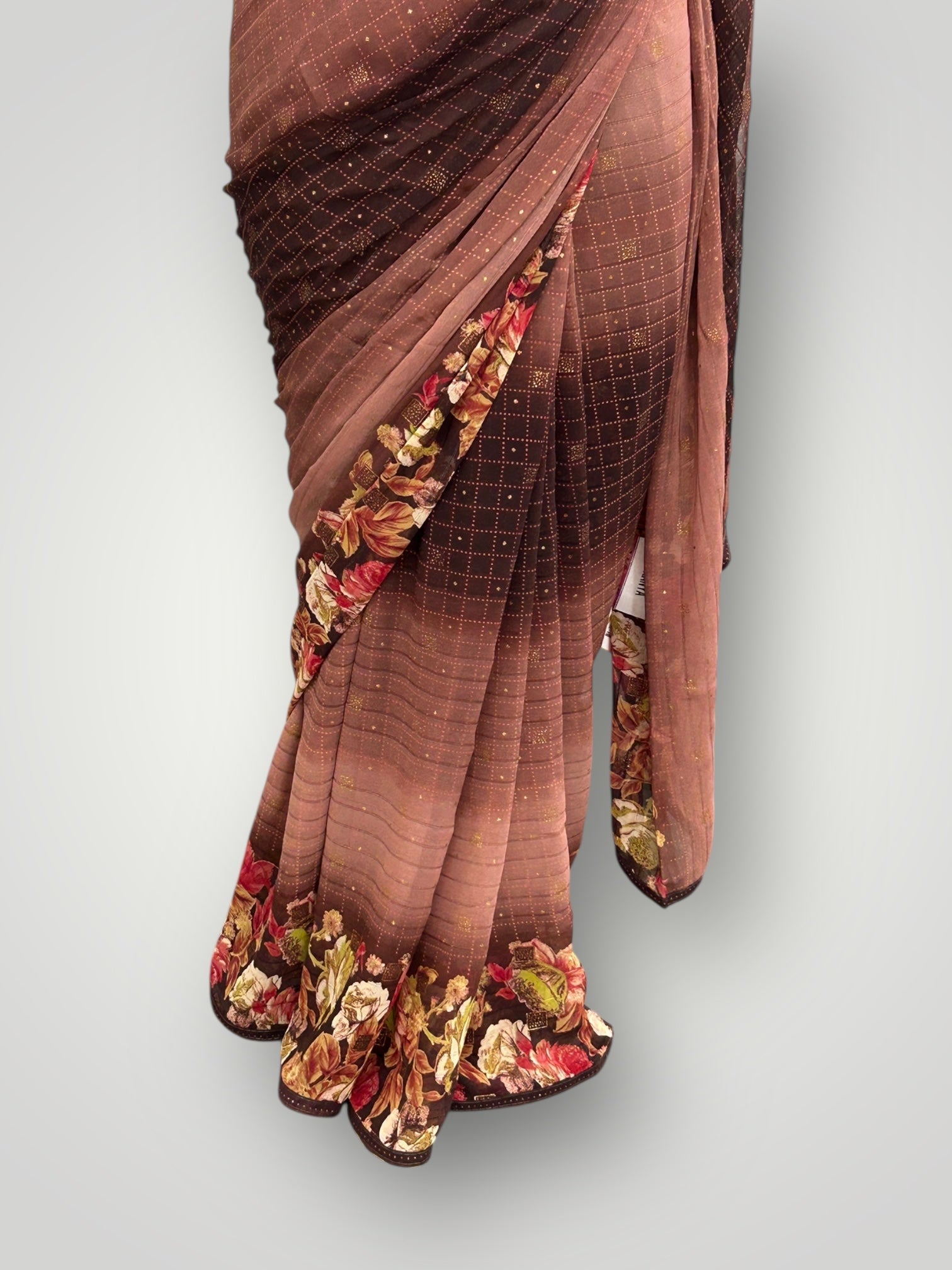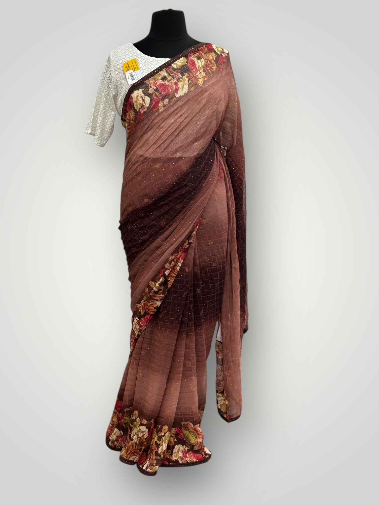 This light brown Chiffon Saree exudes elegance and grace with its delicate fabric and intricate design. Perfect for any occasion, its soft color adds a touch of sophistication to your outfit. Made with high-quality materials, this saree offers both comfort and style, making it a must-have in any wardrobe.