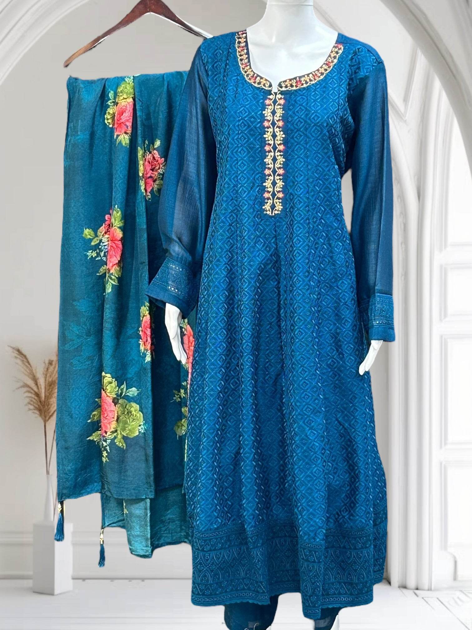 This Anarkali set showcases delicate Chikankari work, creating a timeless and elegant look. The intricate embroidery adds a touch of femininity and sophistication to the traditional kurti set. Perfect for any occasion, this set effortlessly combines style and comfort.