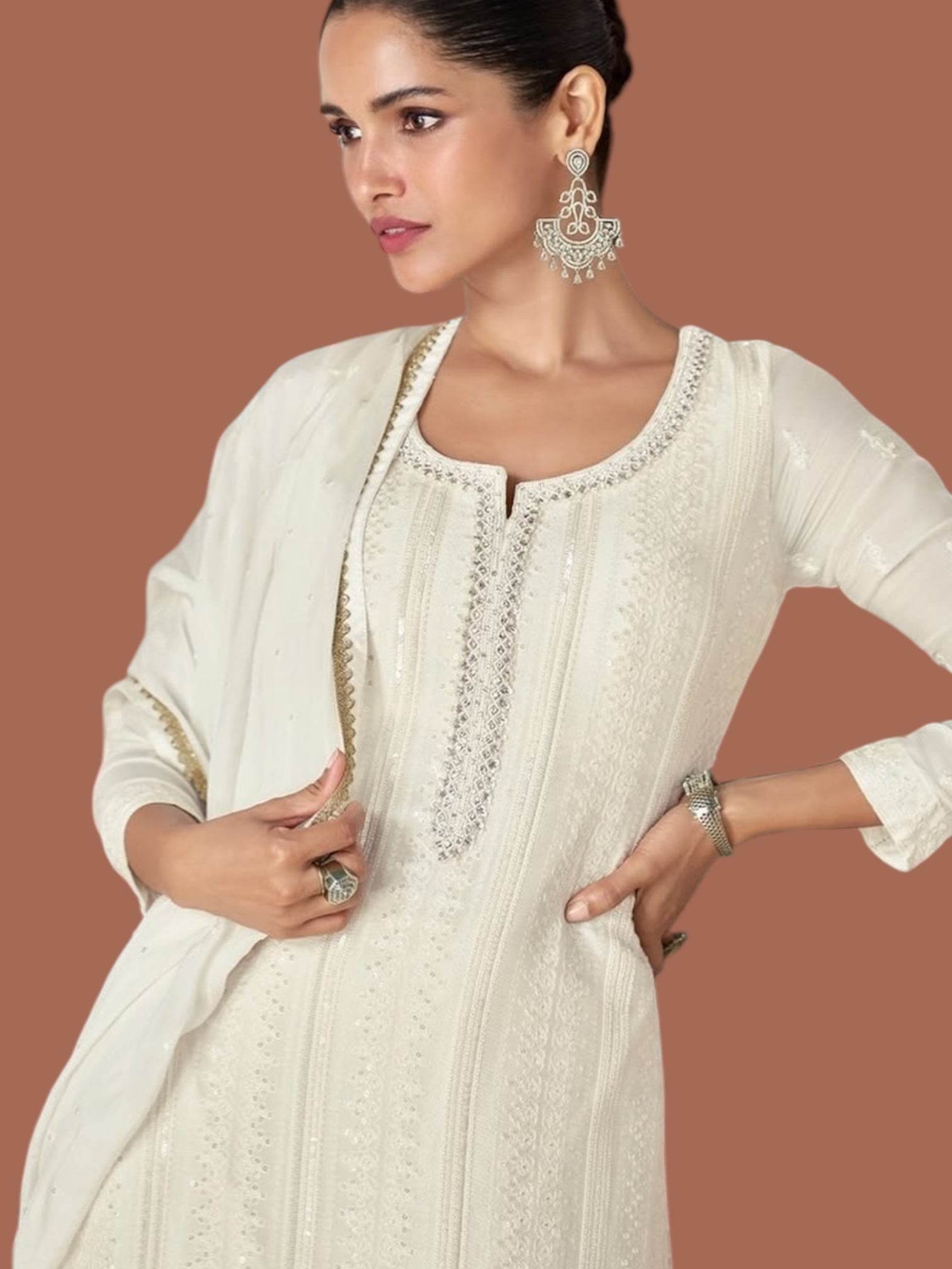 This Chikankari work sharara suit features exquisite heavy work, making it perfect for glamorous parties. Elevate your style with this statement piece, showcasing intricate embroidery and traditional craftsmanship. Step into the spotlight with confidence and grace.