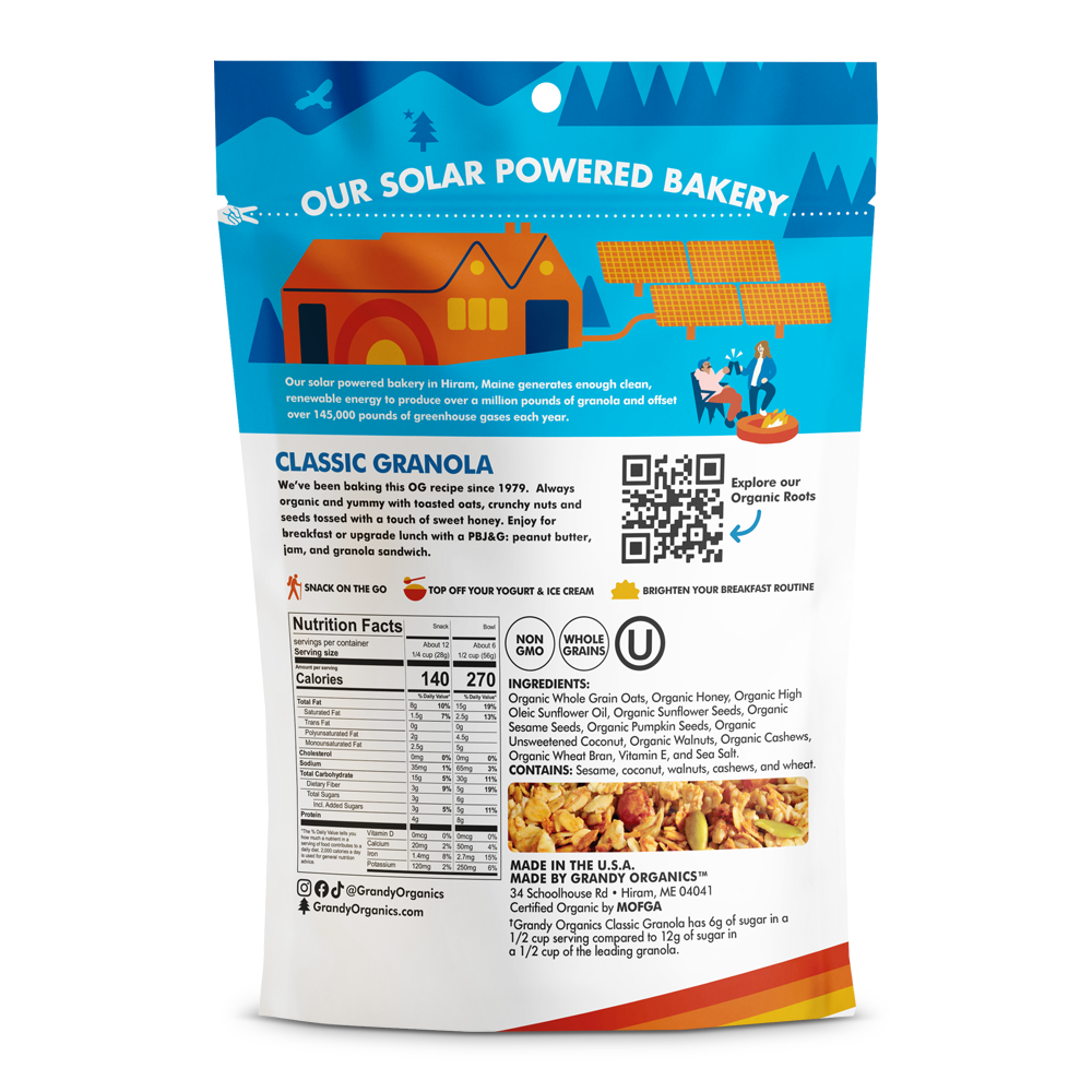 Classic Granola is the delicious recipe that started it all for GrandyOats in 1979! This traditional oat-based granola features nutritious pumpkin seeds, walnuts and cashews, and is lightly sweetened with wildflower honey. Classic Granola is made in small batches at our solar-powered bakery and just like the sun, it provides you with energy to power your adventures.