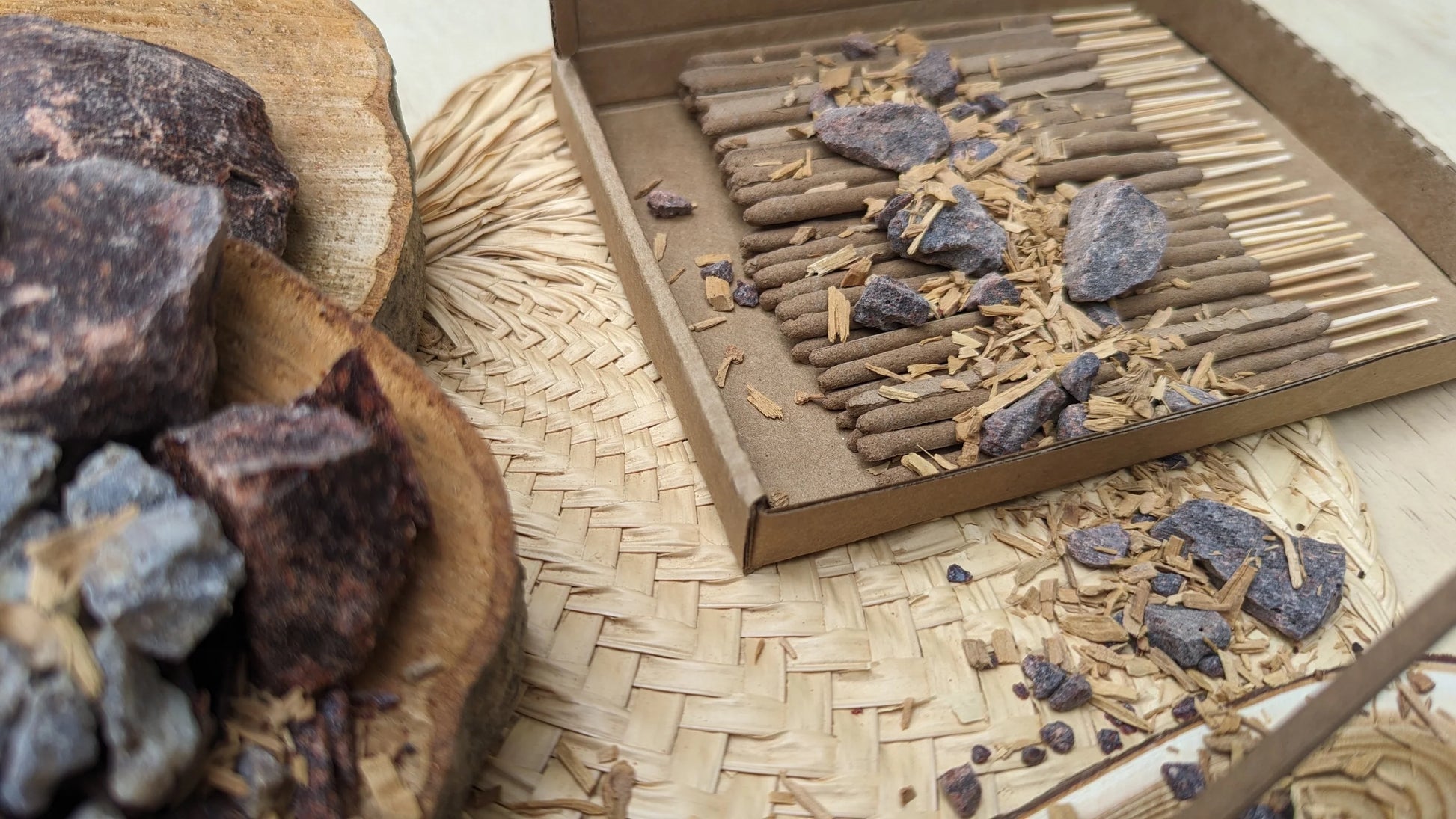 Each stick is made by grinding the herbs, flowers, and spices into a powder and then dipping the sticks in resin, rolling the ground herb onto the stick, and then sun-drying.