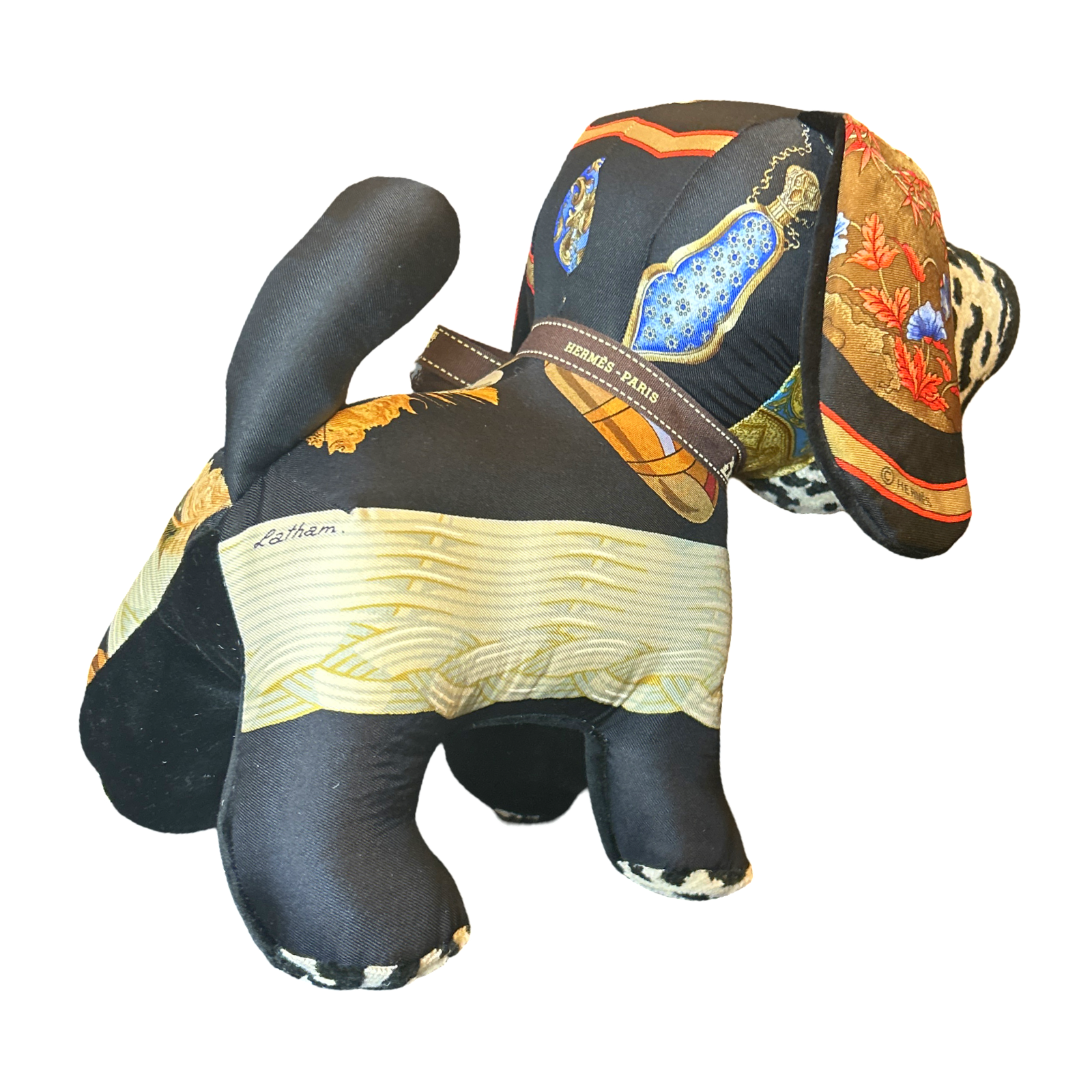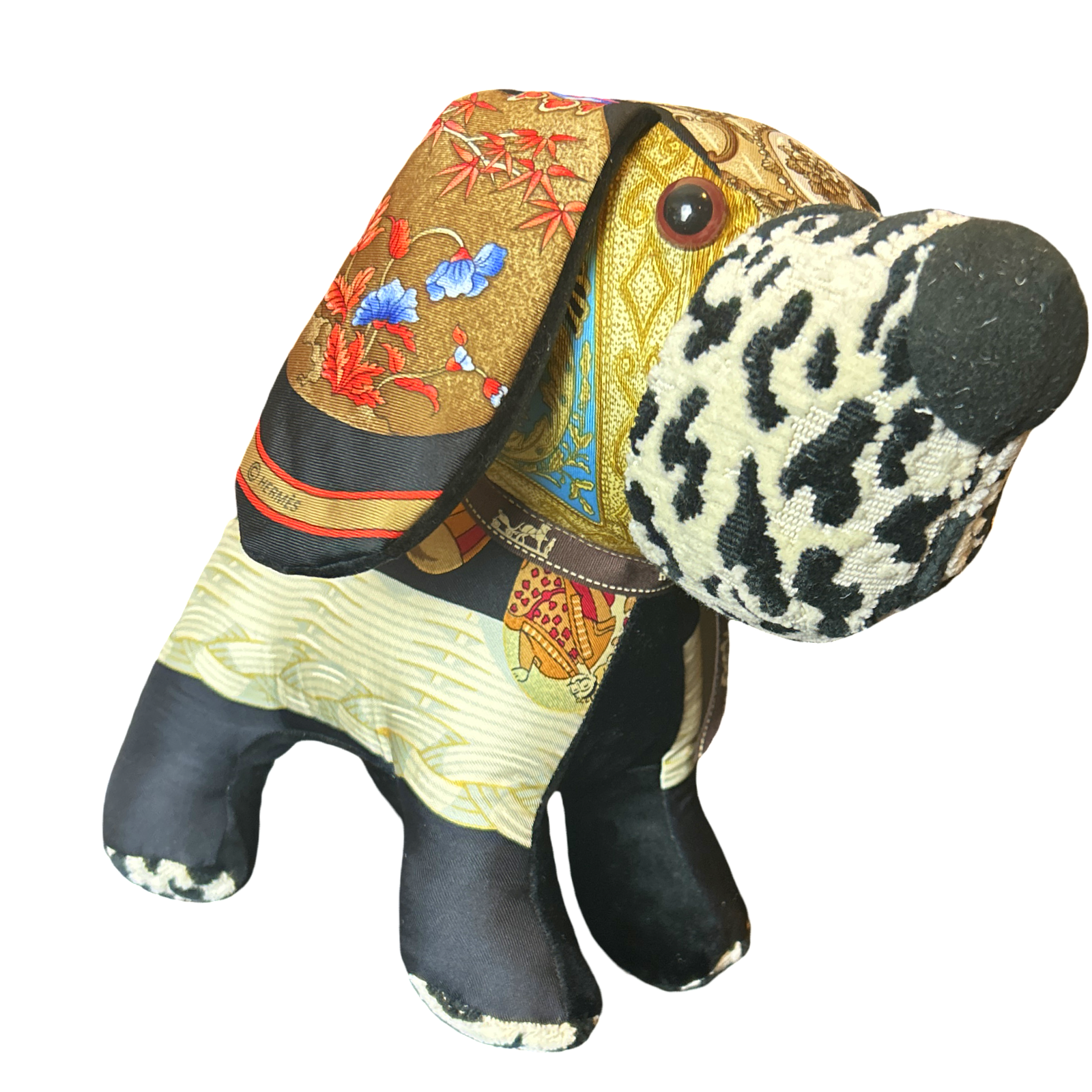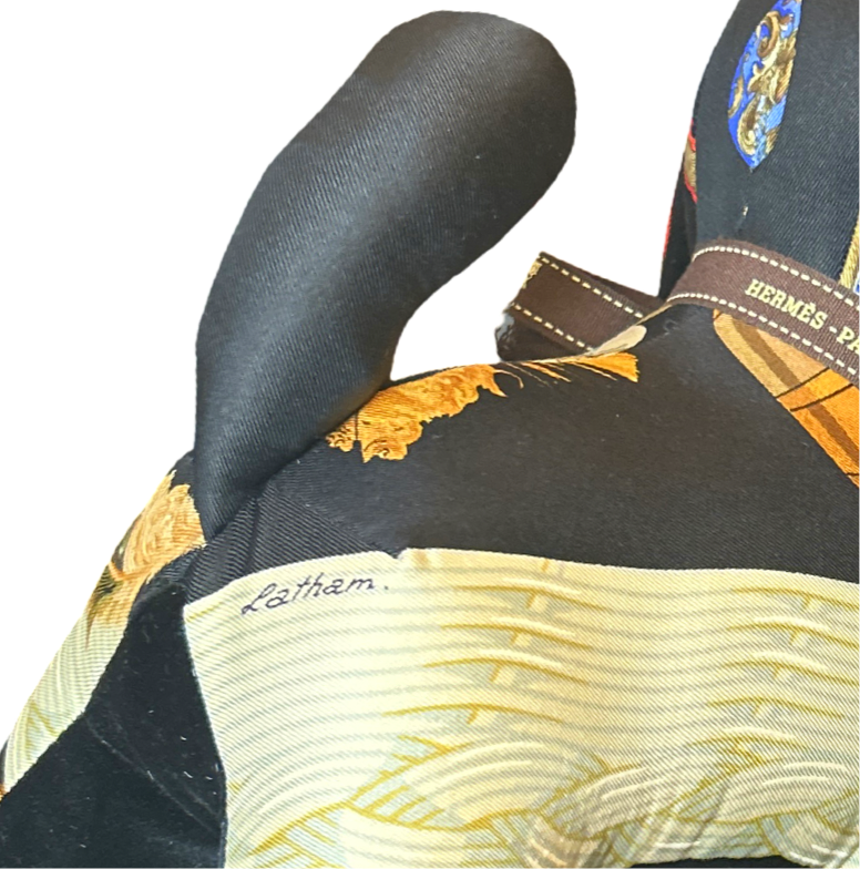Vintage Hermès Couvée d'Hermes and Qu'Importe le Flacon scarves paired with velvet cloth handmade into a one of a kind animal. Non-Allergenic polyfill stuffing. For decorative use only.