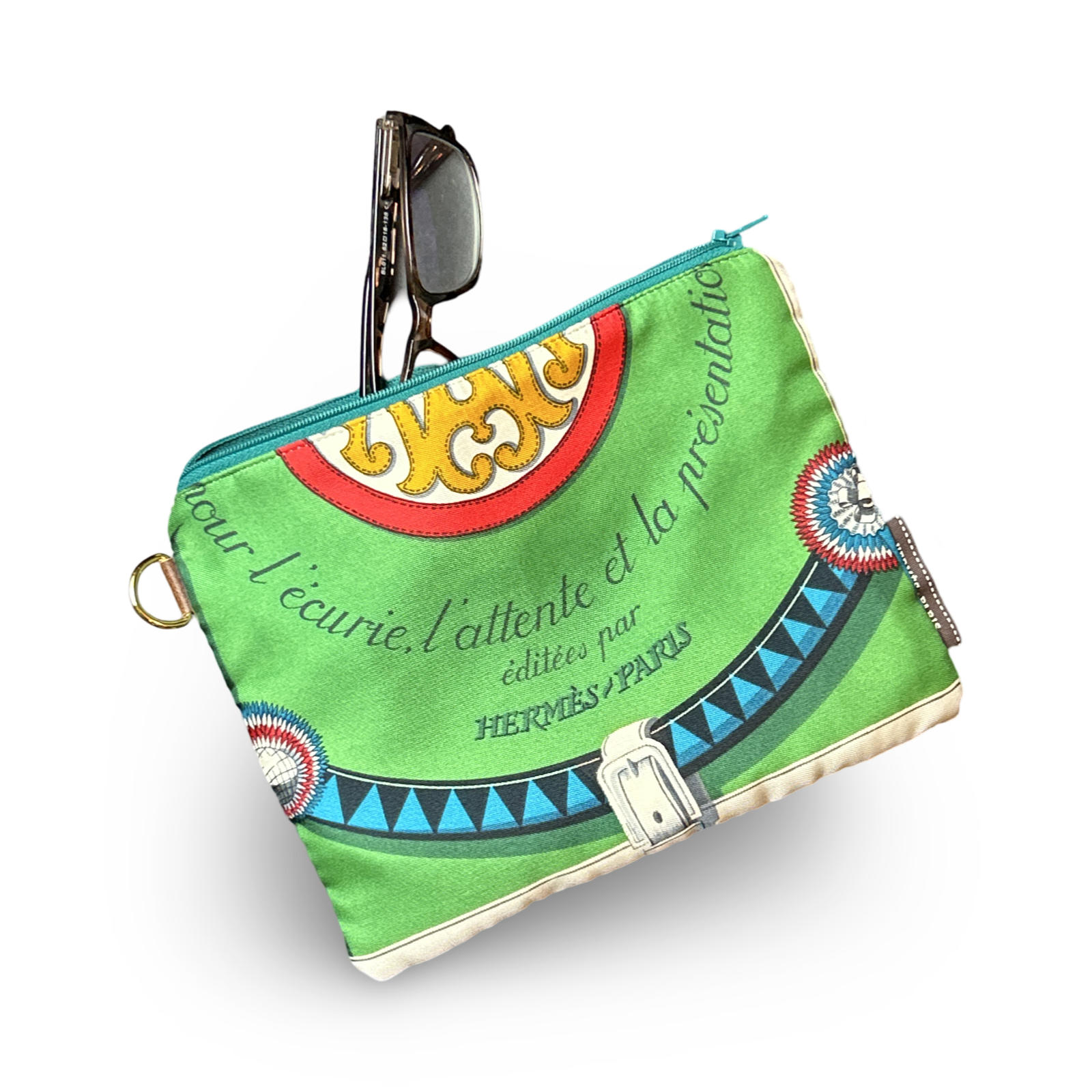 Vintage Hermès Couvertures et Tenues du Jour scarf front paired with coordinating houndstooth plaid reverse. Fully lined zippered bag with handy d-ring.