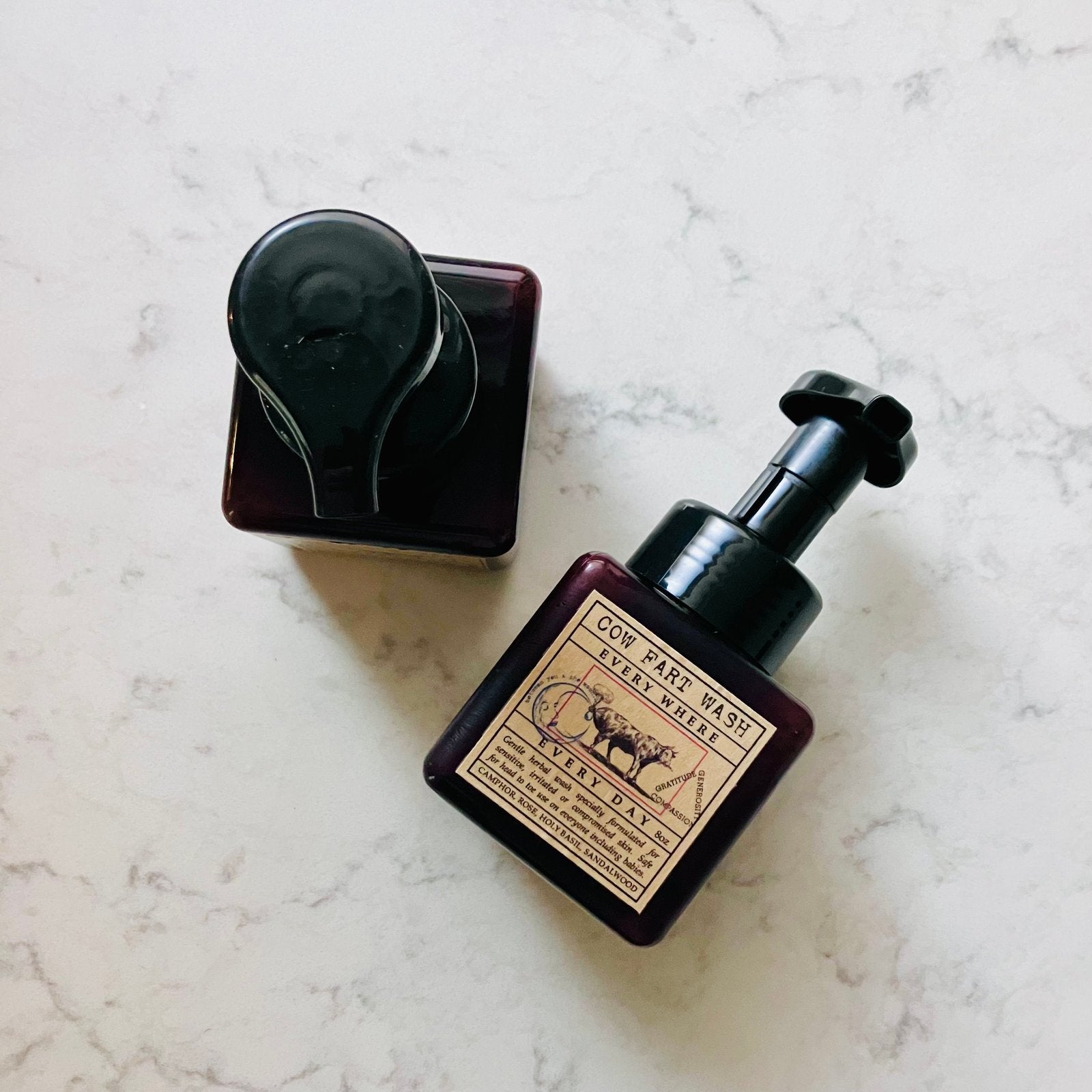 Every body has the need to keep clean. Daily hand hygiene prevents illness while body hygiene keeps our skin fresh so that we can look—and smell—our best. However, pervasive chemicals in most hygiene formulations can disrupt the endocrine system and compromise the human microbiome, while causing sensitivity and exacerbating existing irritations. Cow Fart Wash is formulated to get the job done in the most gentle way while supporting the skin—a sense organ—holistically. Formulated with Witch Hazel distillate for cleansing, and Camphor, Sesame and Cow Fart botanicals for compromised skin that needs special attention. The perfect way to keep your hands and body clean while soothing your senses — body, mind, and spirit.