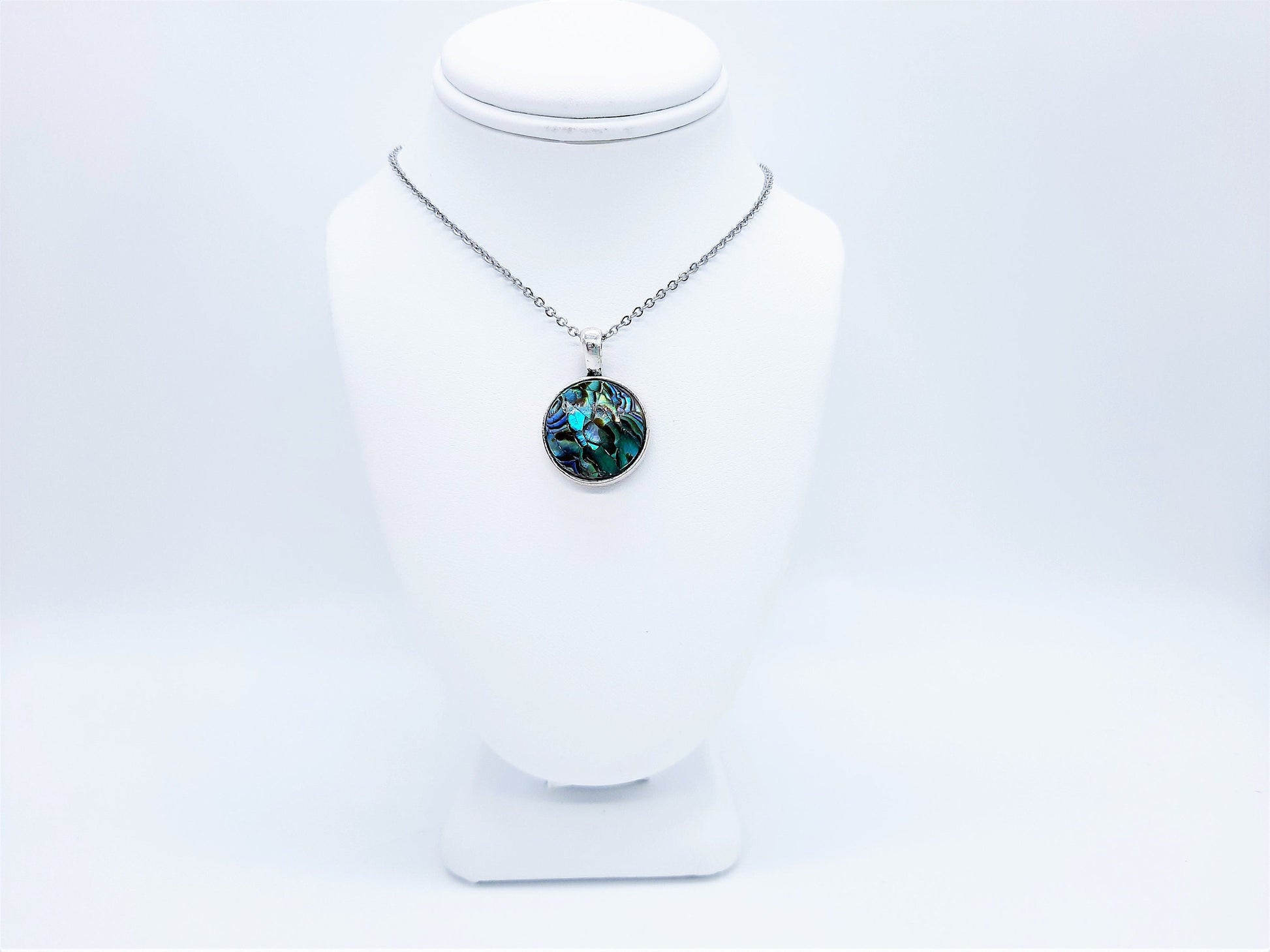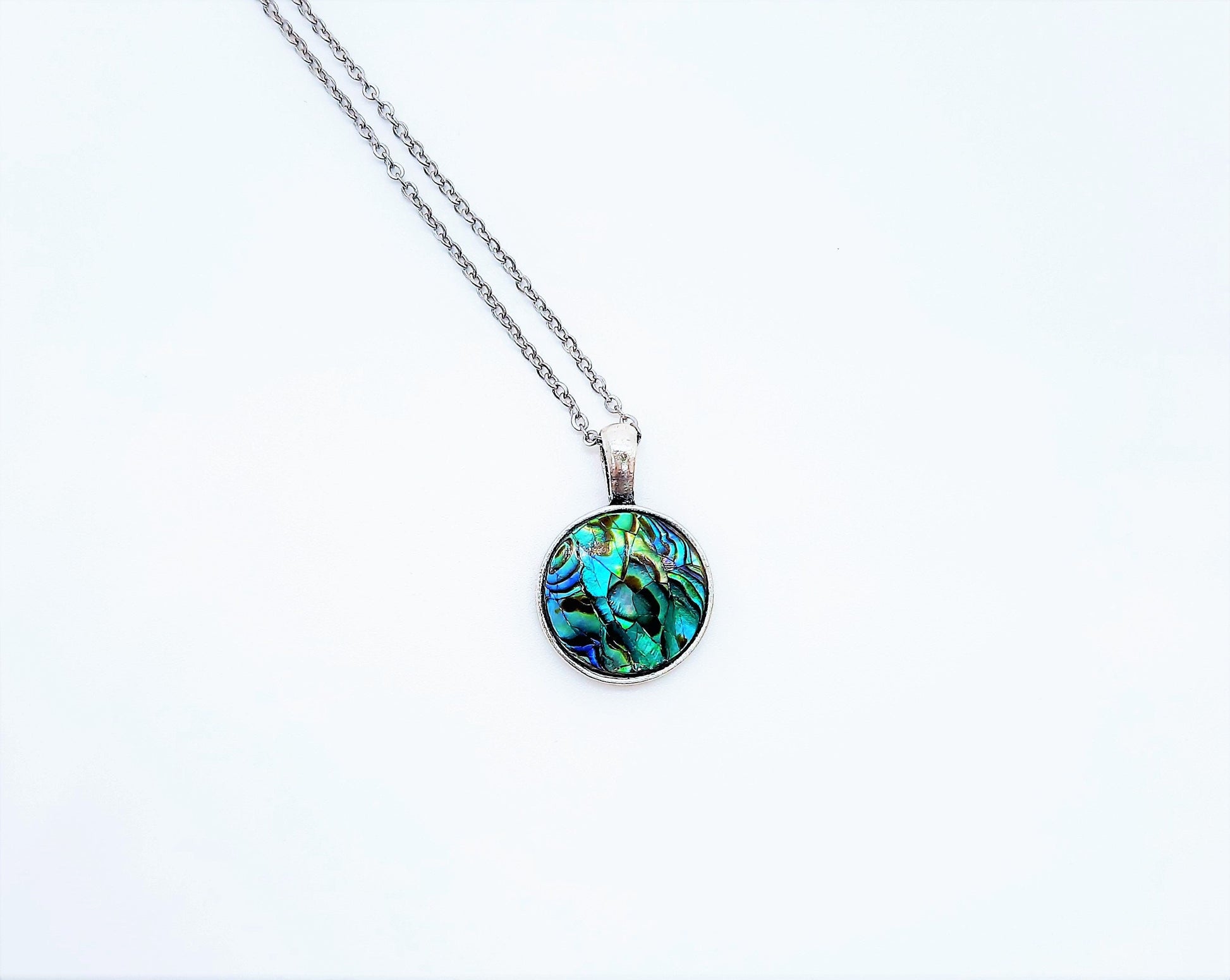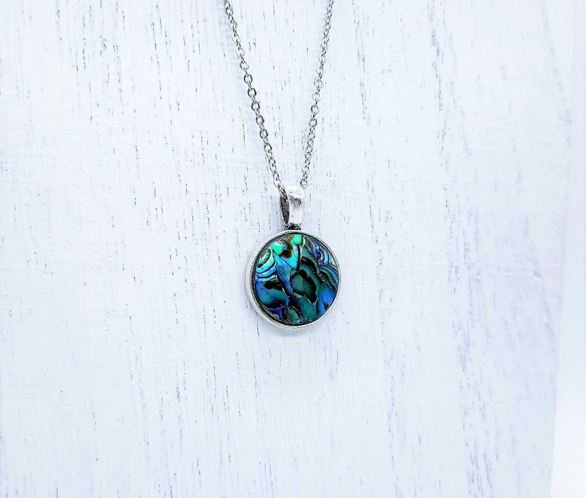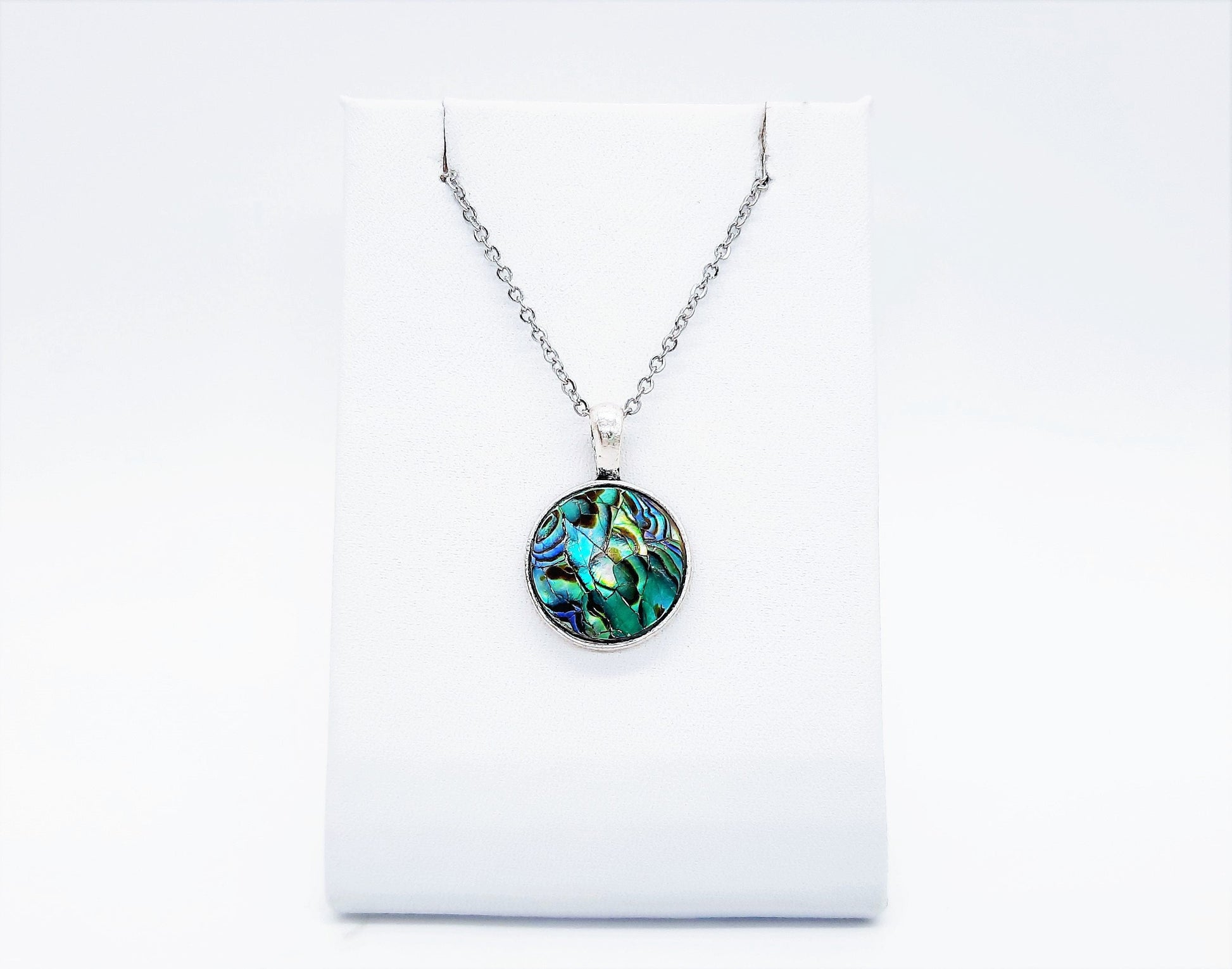 This pendant boasts a metallic circular frame Holding a cracked, iridescent, blue-green abalone shell that shimmers and changes in the light. Comes with an 18" stainless steel chain with lobster claw closure.