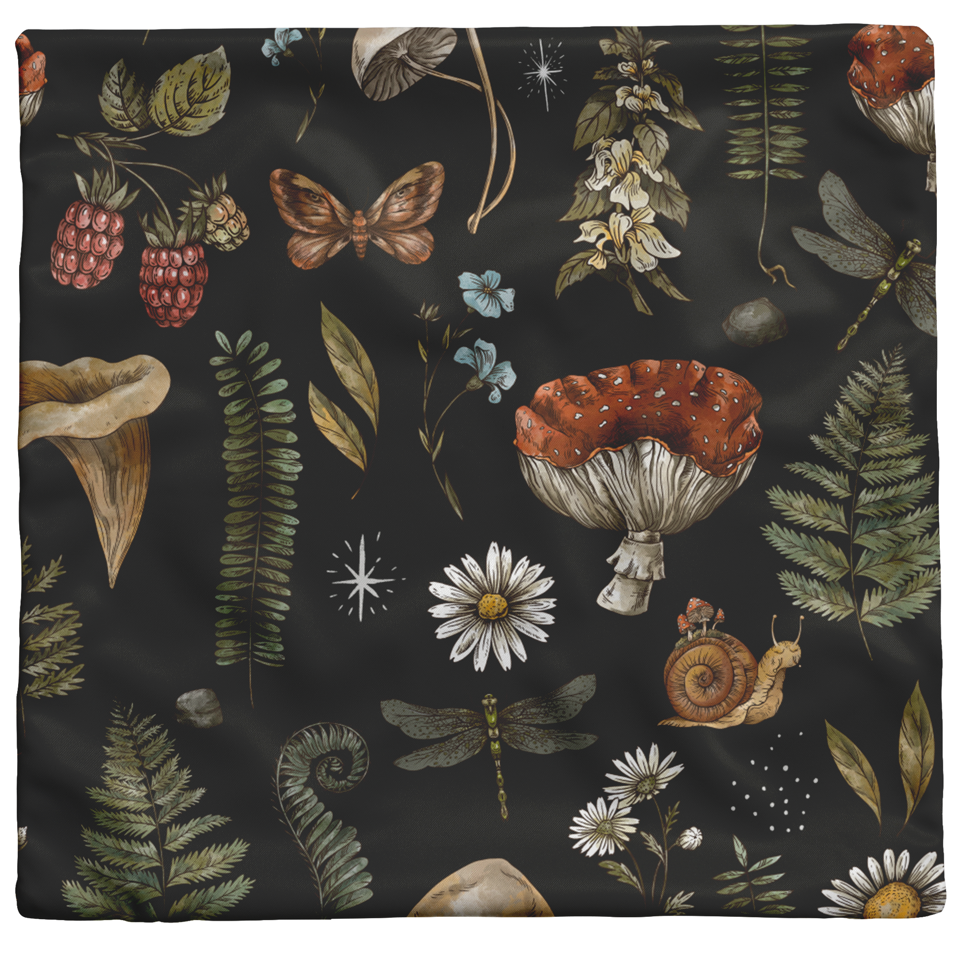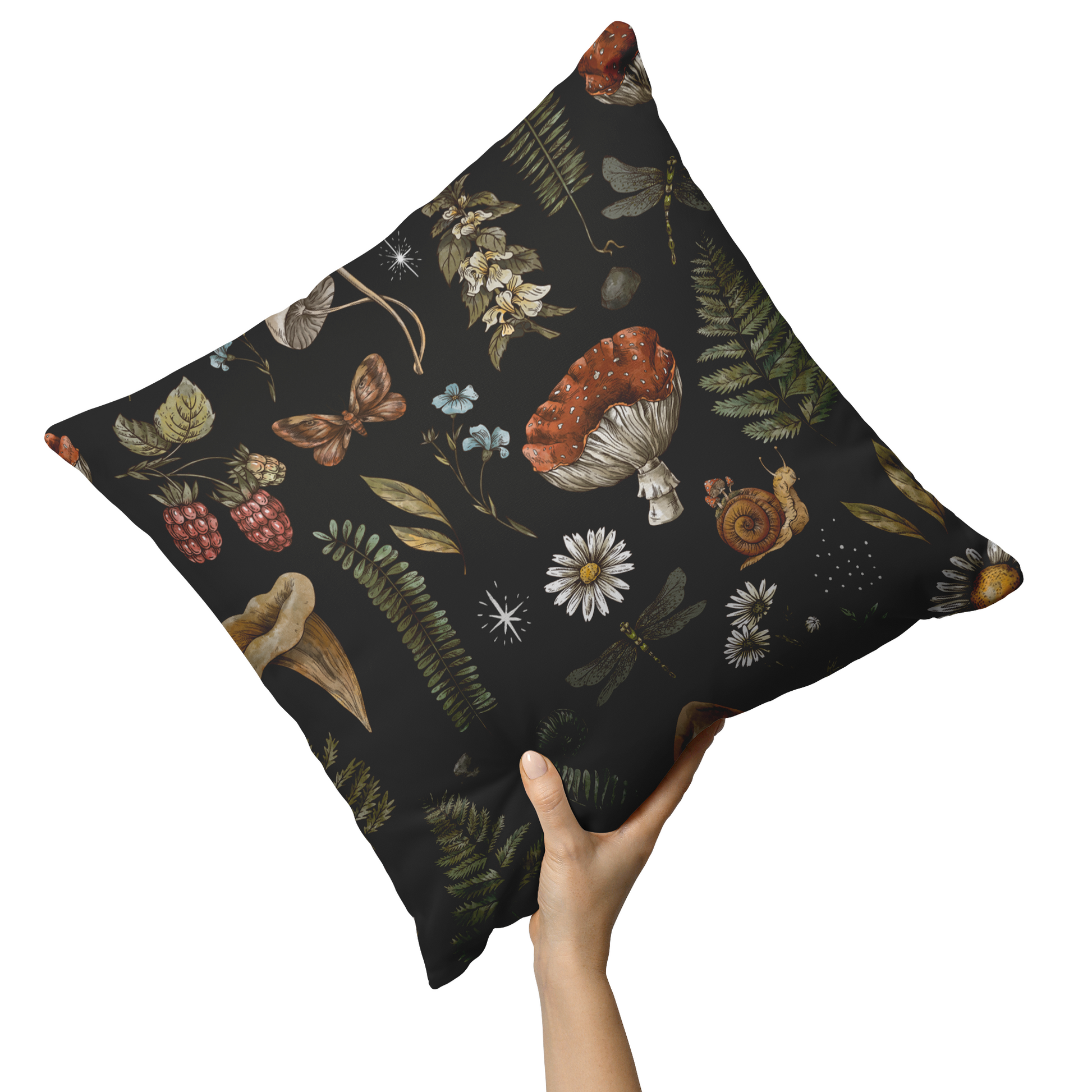 Create a cozy and mysterious ambiance in your home with this throw pillow. This throw pillow features a dark forest themed pattern of flora and fauna found on the forest floor on a black background. The fabric is 100% polyester microfiber, which is soft, durable, and wrinkle-resistant. It has a hidden zipper closure at the bottom that makes it easy to insert and remove the pillow insert, and gives it a seamless and elegant look.