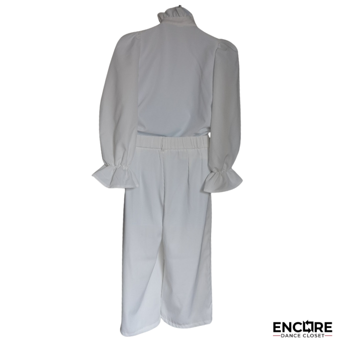 Sleepwear meets stagewear in this whimsical pajama-inspired look. A white ruffled blouse and flowing wide-leg pants give off serene dreamscape vibes. Ideal for storytelling pieces or soft, character-driven performances. This costume has been sewn together to easily put on and off as a jumpsuit.