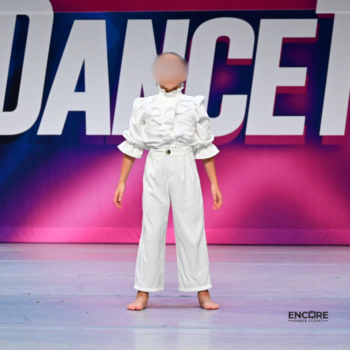Sleepwear meets stagewear in this whimsical pajama-inspired look. A white ruffled blouse and flowing wide-leg pants give off serene dreamscape vibes. Ideal for storytelling pieces or soft, character-driven performances. This costume has been sewn together to easily put on and off as a jumpsuit.