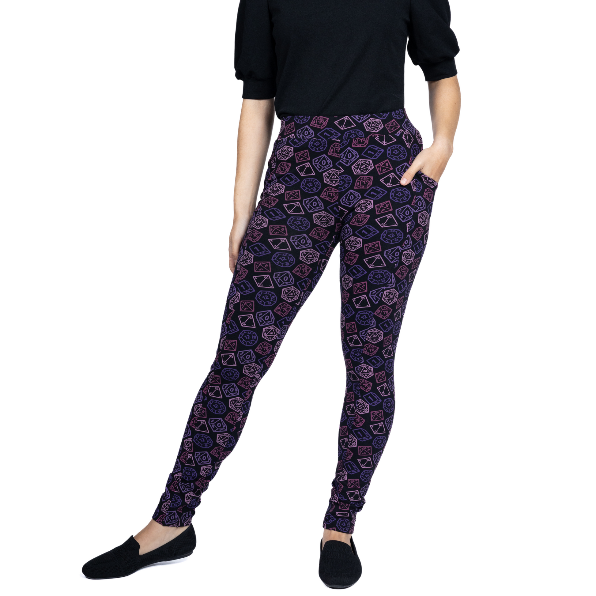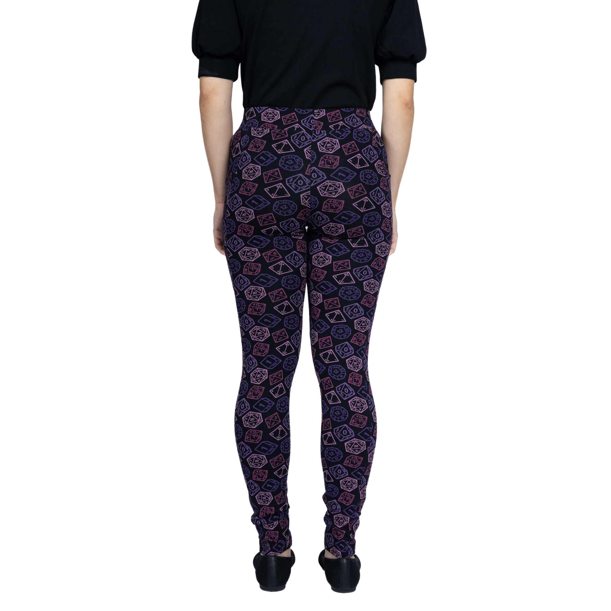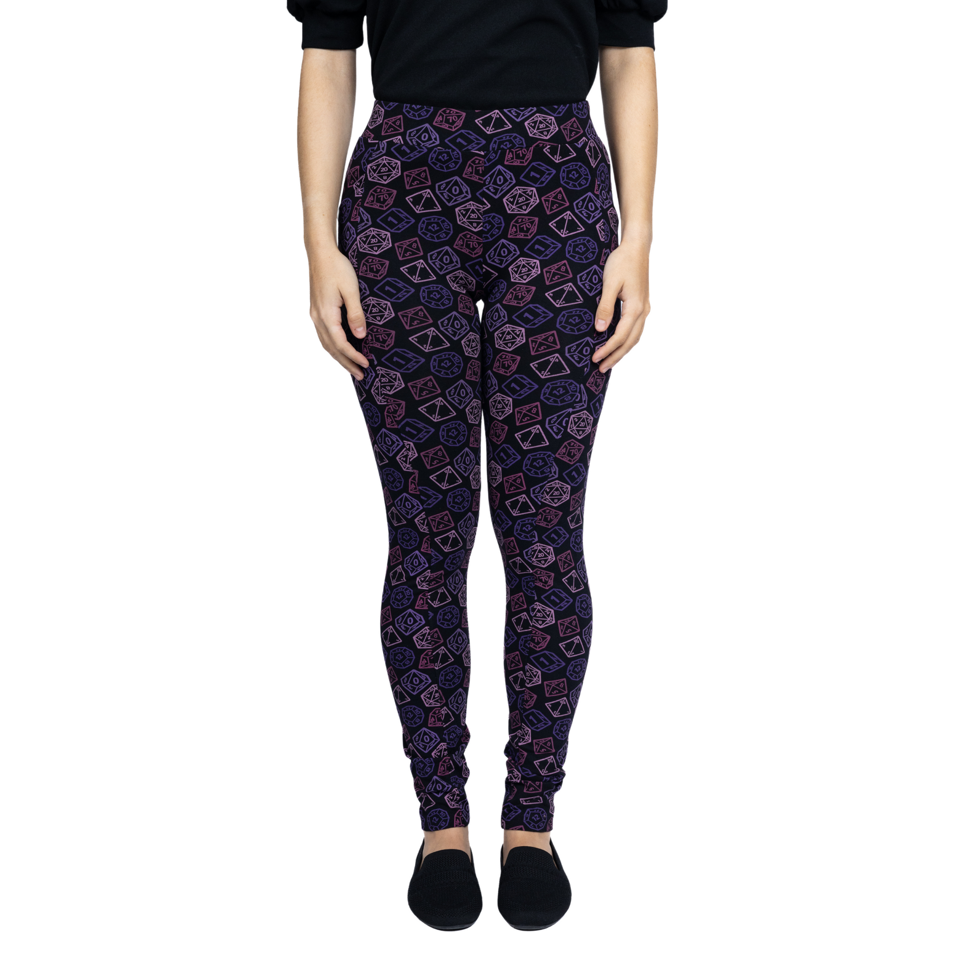 These leggings are adorned with an eye-catching pattern of various dice designs, from classic six-sided dice to colorful polyhedral shapes. Perfect for the game-lovers, it is a surefire way to add some luck and levity to your wardrobe. These leggings is sure to be a critical hit- buy yours before it rolls away!