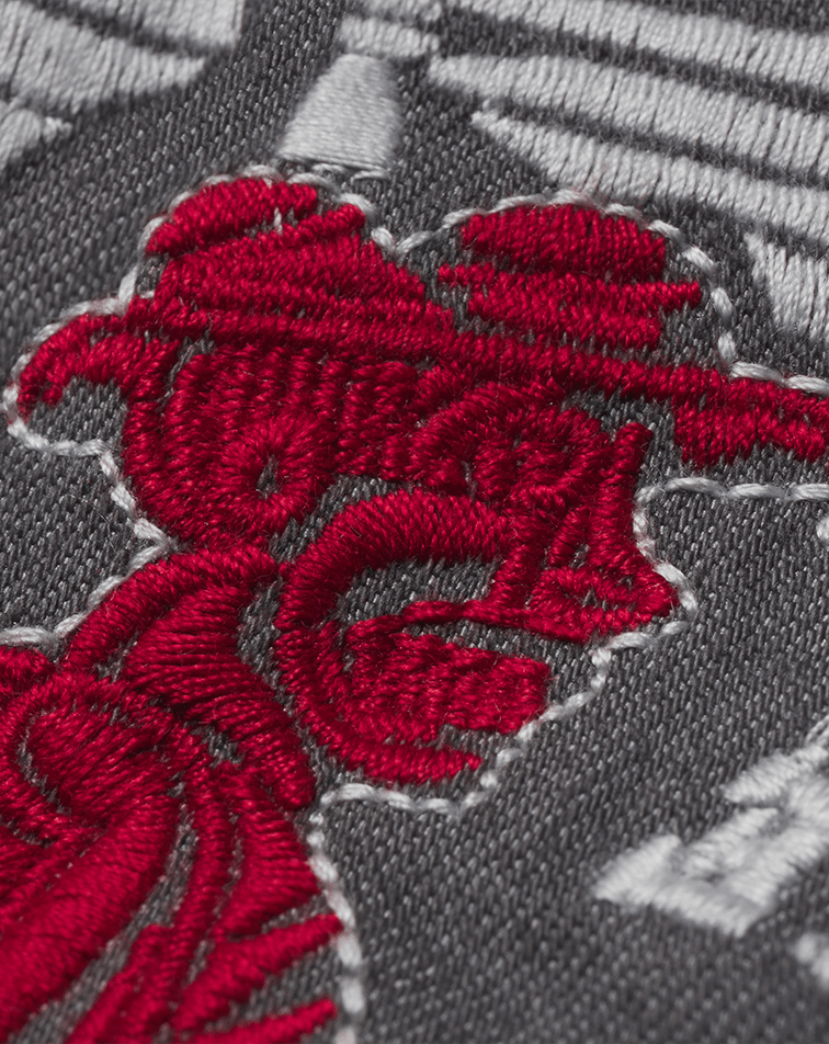 In collaboration with world renowned artist Carlos Luna, the Empingated Bomber Jacket brings to life the striking themes of mortality, life, and death from Luna’s work Empingated. The embroidered artwork depicts an anthropomorphic man caught in the jungle of life experiences, wrestling with the inevitable truth of his own mortality. As death reaches out to him with open arms, the man hides a knife behind his back, hoping to slay death and prolong his life. The design contrasts the cycles of life and death through the Spanish phrases “La Vida” (Life) and “La Muerte” (Death). Luna’s piece adds a winking commentary with the Cuban explicative “Pinga”, suggesting that the entire dynamic is “F*cked.” This garment captures the tension between life and death, offering a powerful visual narrative on both the internal struggle and the cycle of existence.