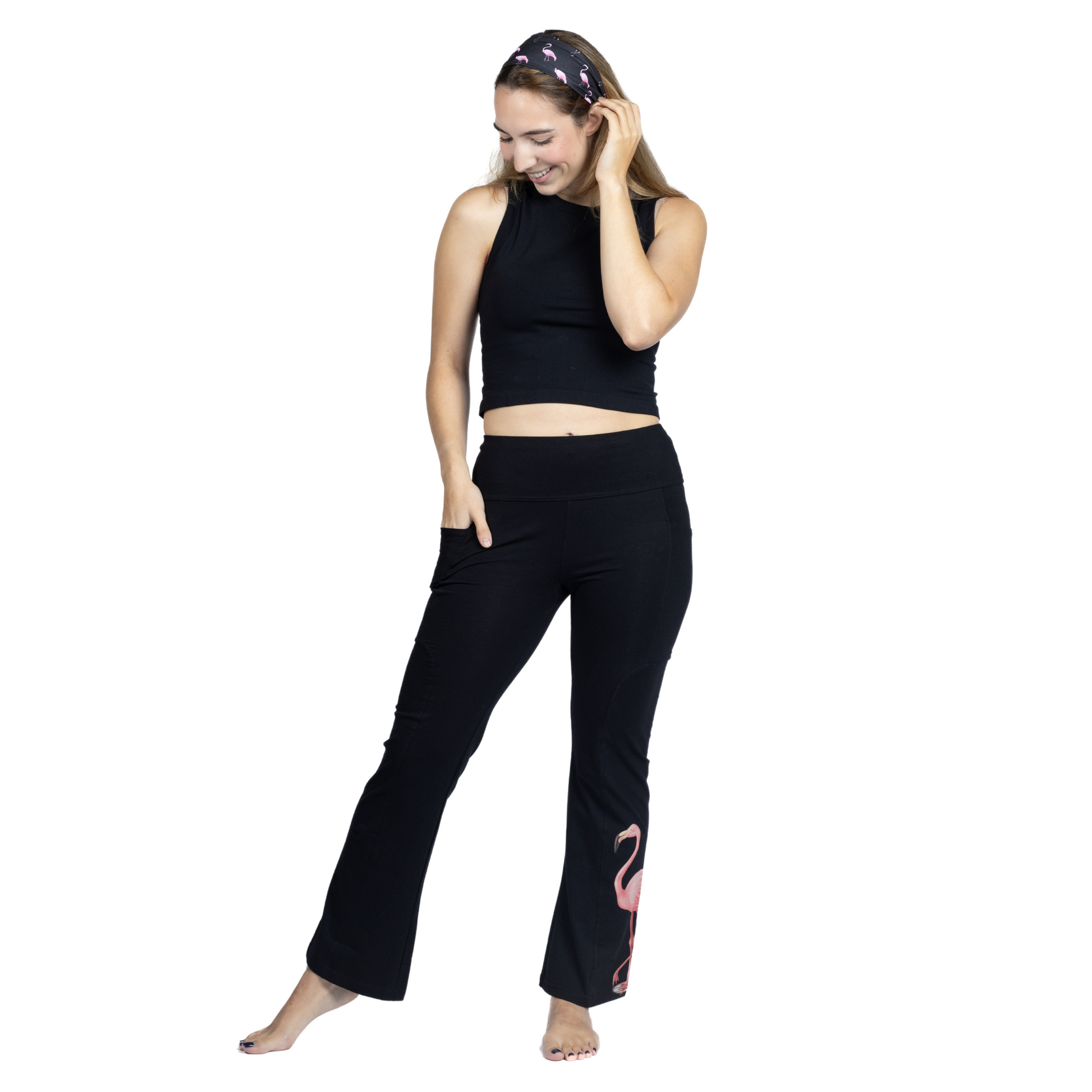 - Color: Black with pink flamingo design on the side of the yoga pants