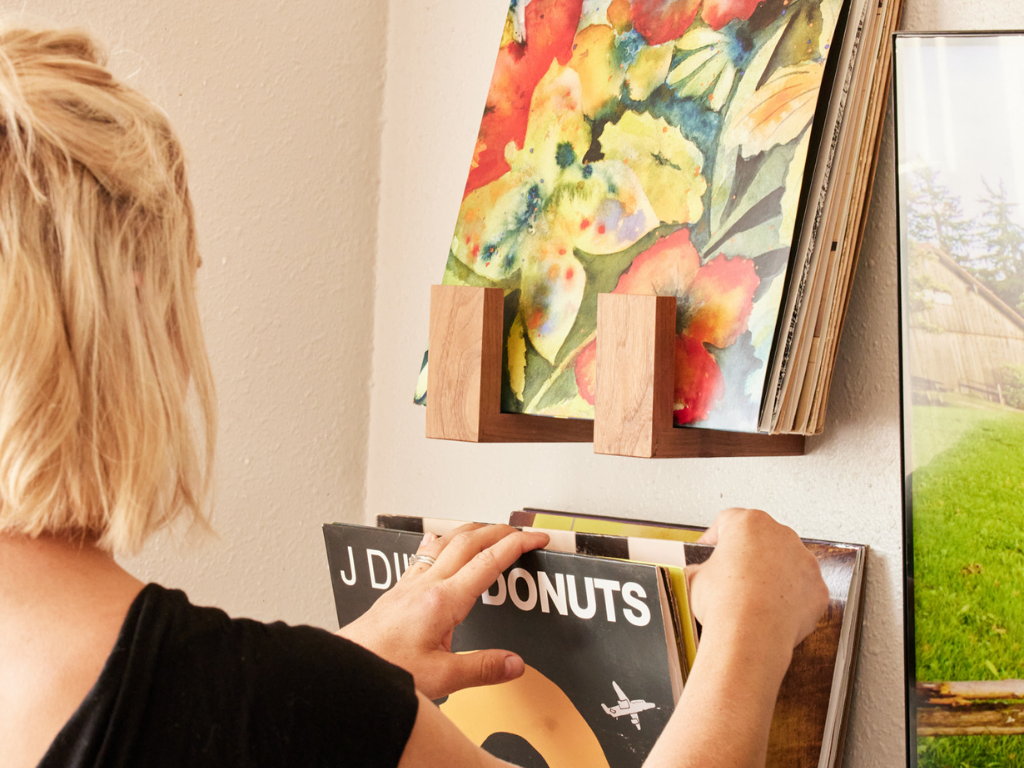The perfect way to display and store your records on the wall in style. These simple, floating brackets hold up to 15 records per set while displaying your favorites at the front. Each set is handcrafted from 100% hardwood, walnut or hard maple in small batches to stylishly display your vinyl within the natural beauty of hardwood, available in rich, dark walnut or light hard maple.