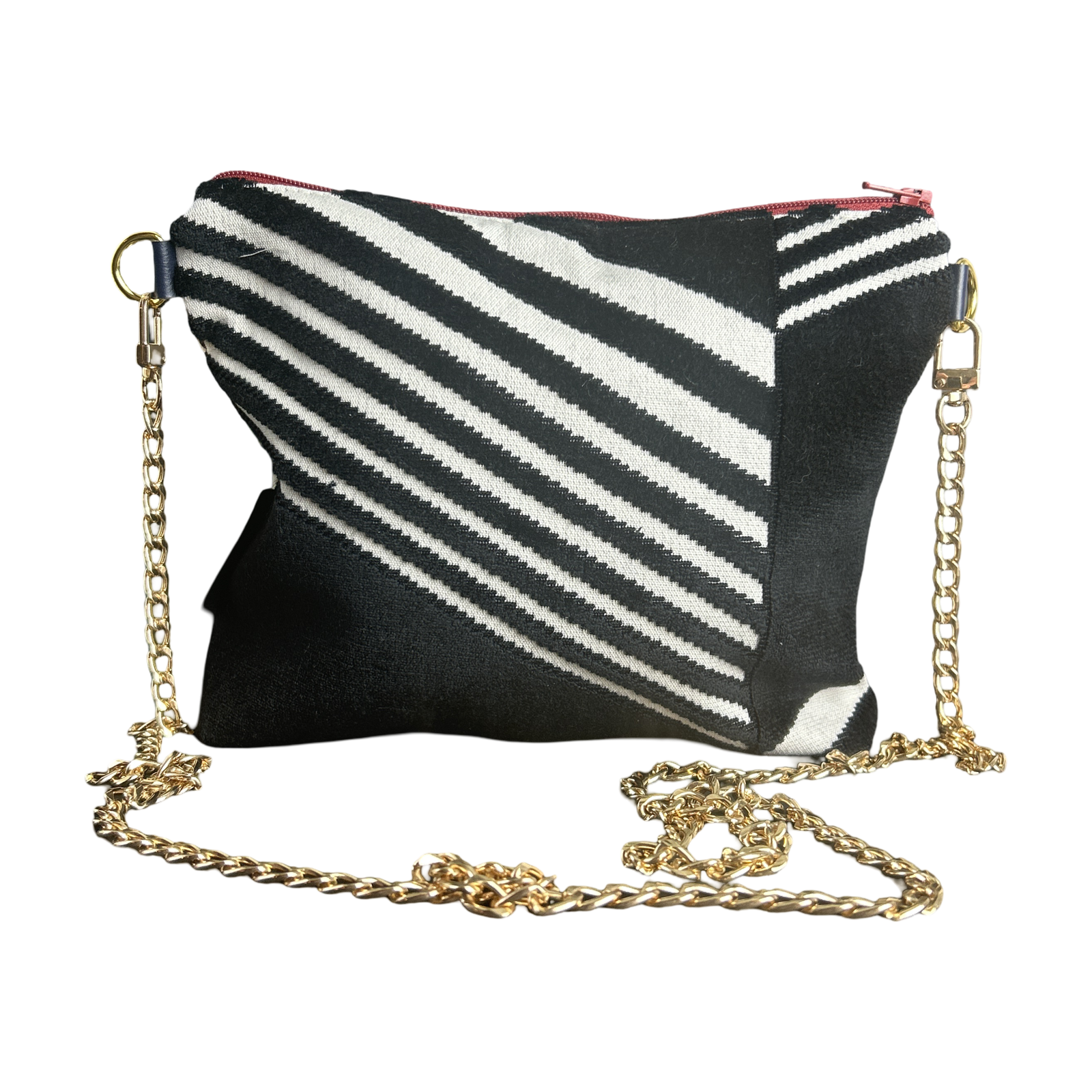 Vintage Gucci 100% silk scarf front paired coordinating black & white velvet back. Fully lined with zipper closure and removable 23" drop gold-tone crossbody chain.
