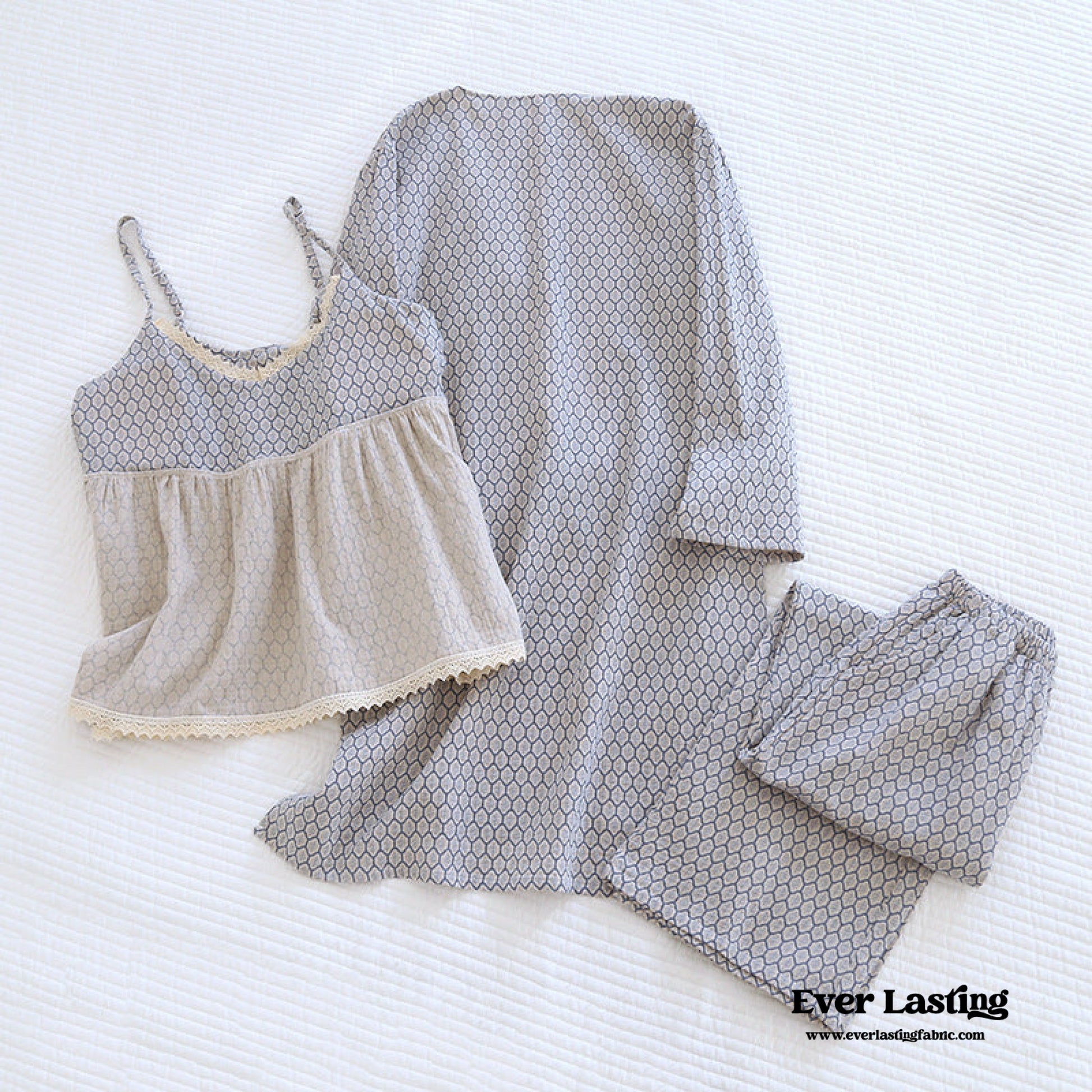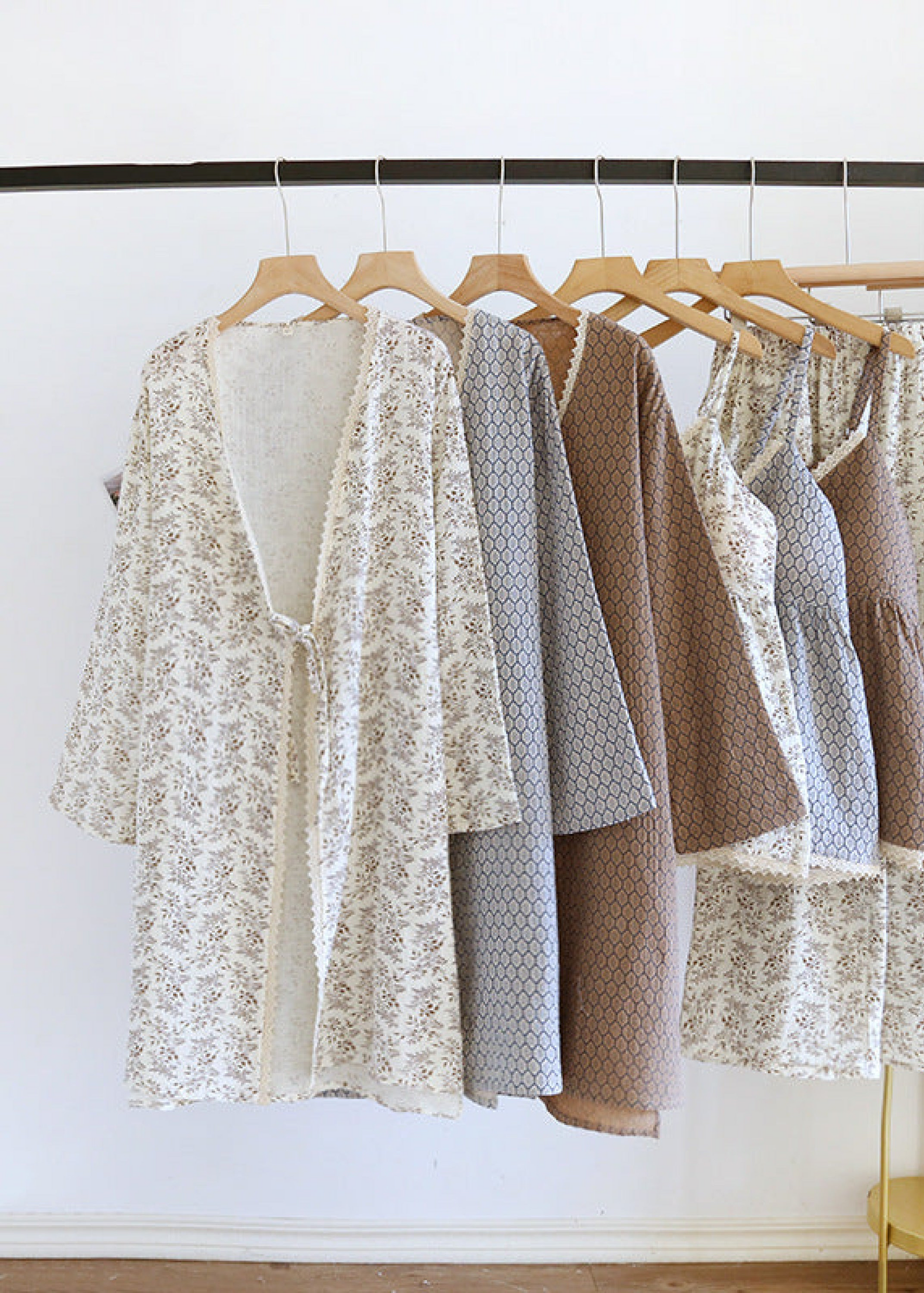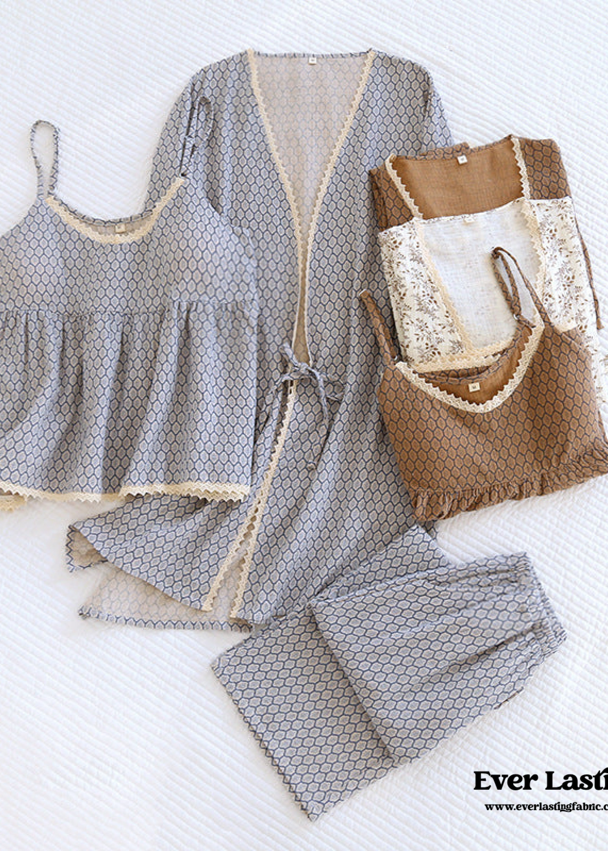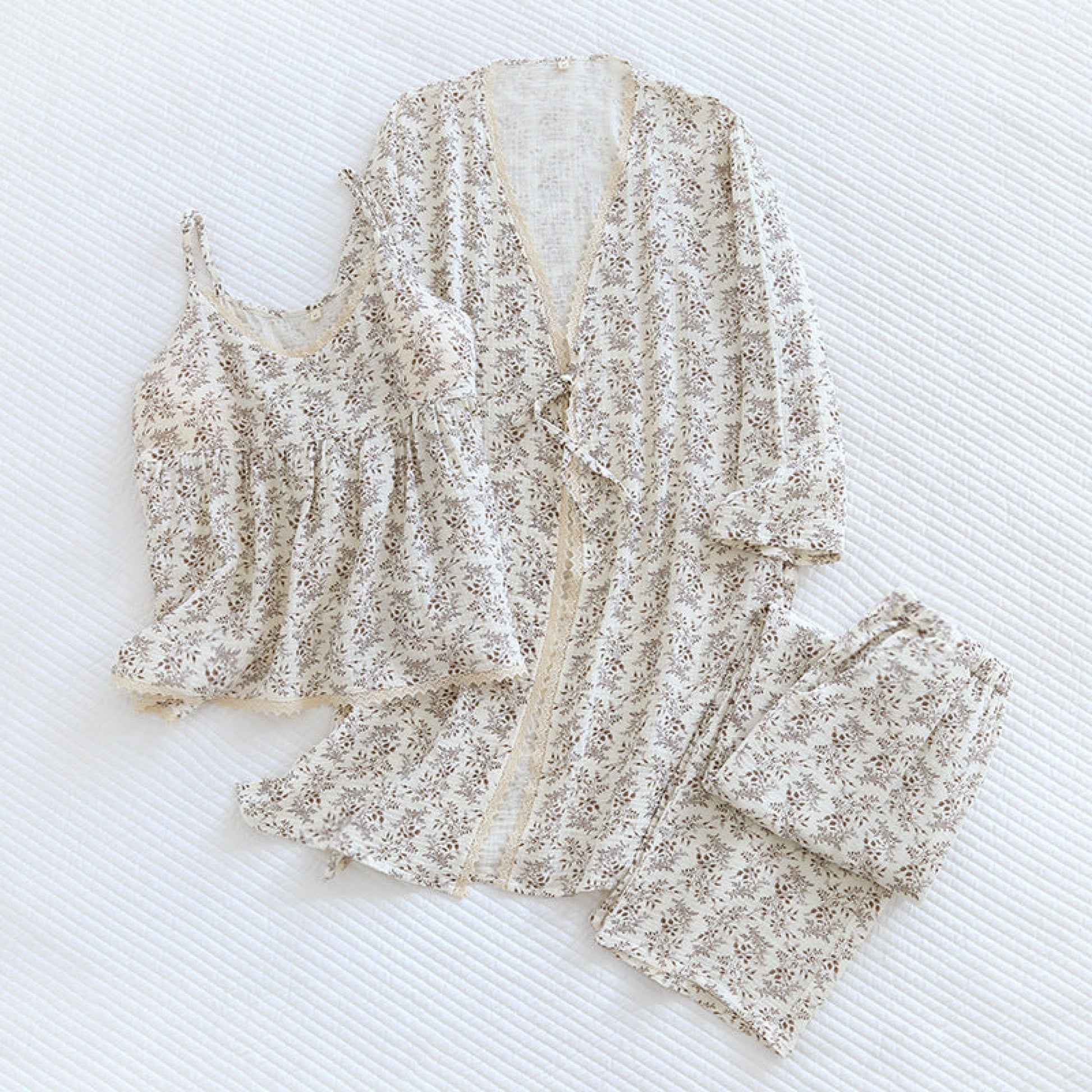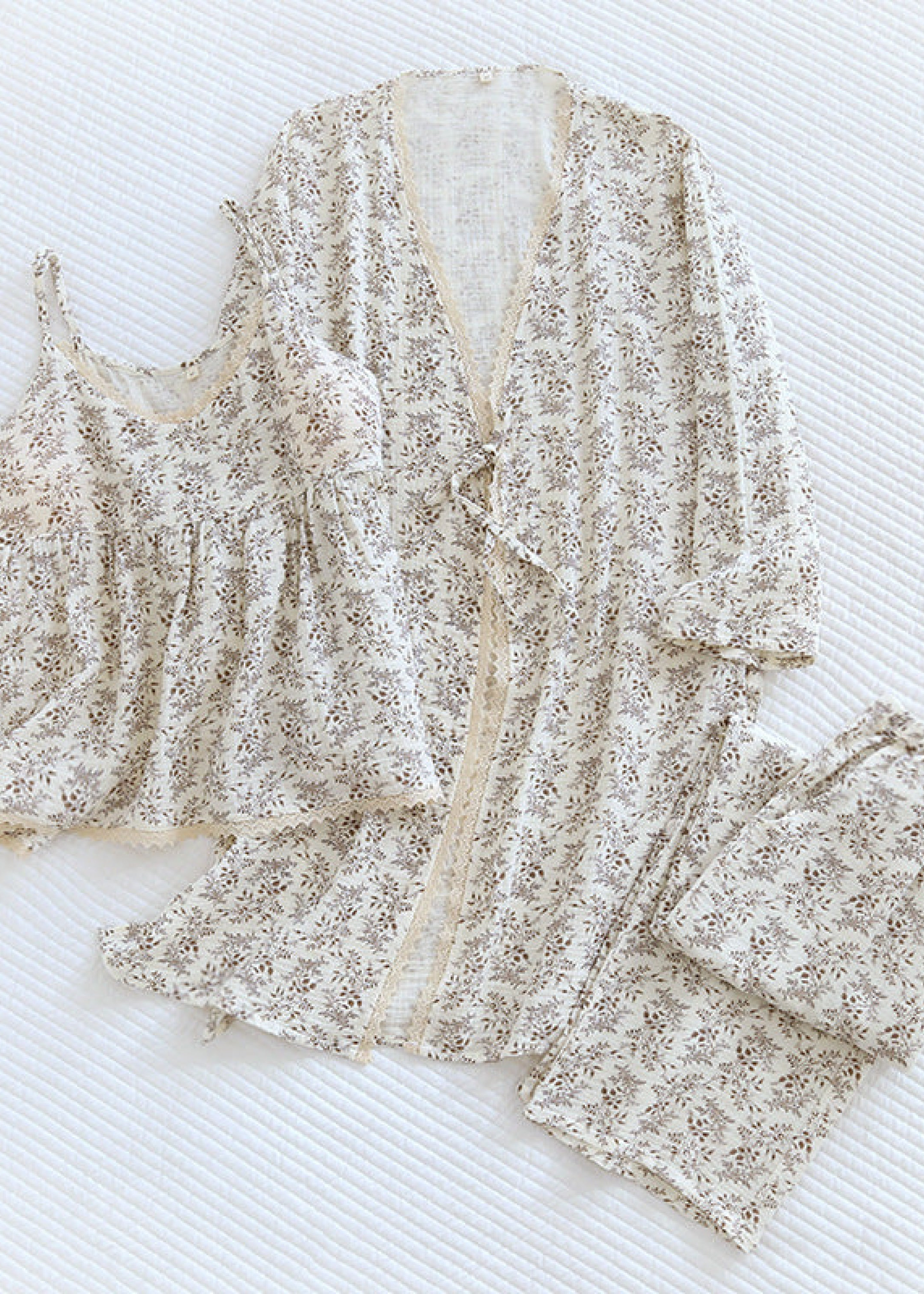 Unwind in comfort and style with our Floral V Tank and Long Pants with Cardigan Cotton Pajama Set. This meticulously crafted ensemble features a floral V-neck tank top and long pants, both made from soft, breathable cotton fabric, ensuring cozy coverage and freedom of movement throughout the night. With delicate floral patterns adorning the tank top and a coordinating cardigan providing extra warmth and versatility, this set is perfect for relaxing evenings or leisurely mornings, promising to make every moment of relaxation feel extra special.