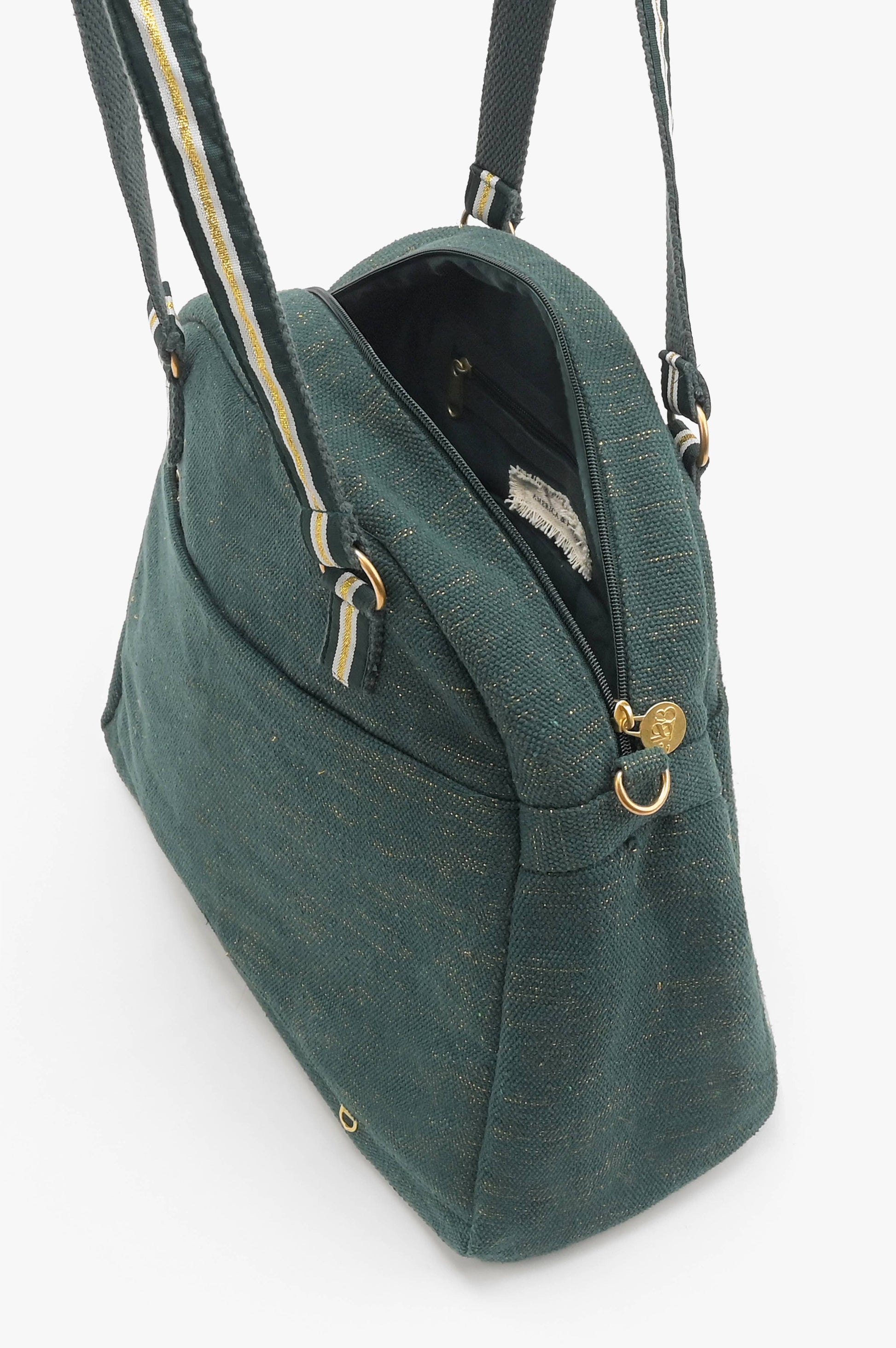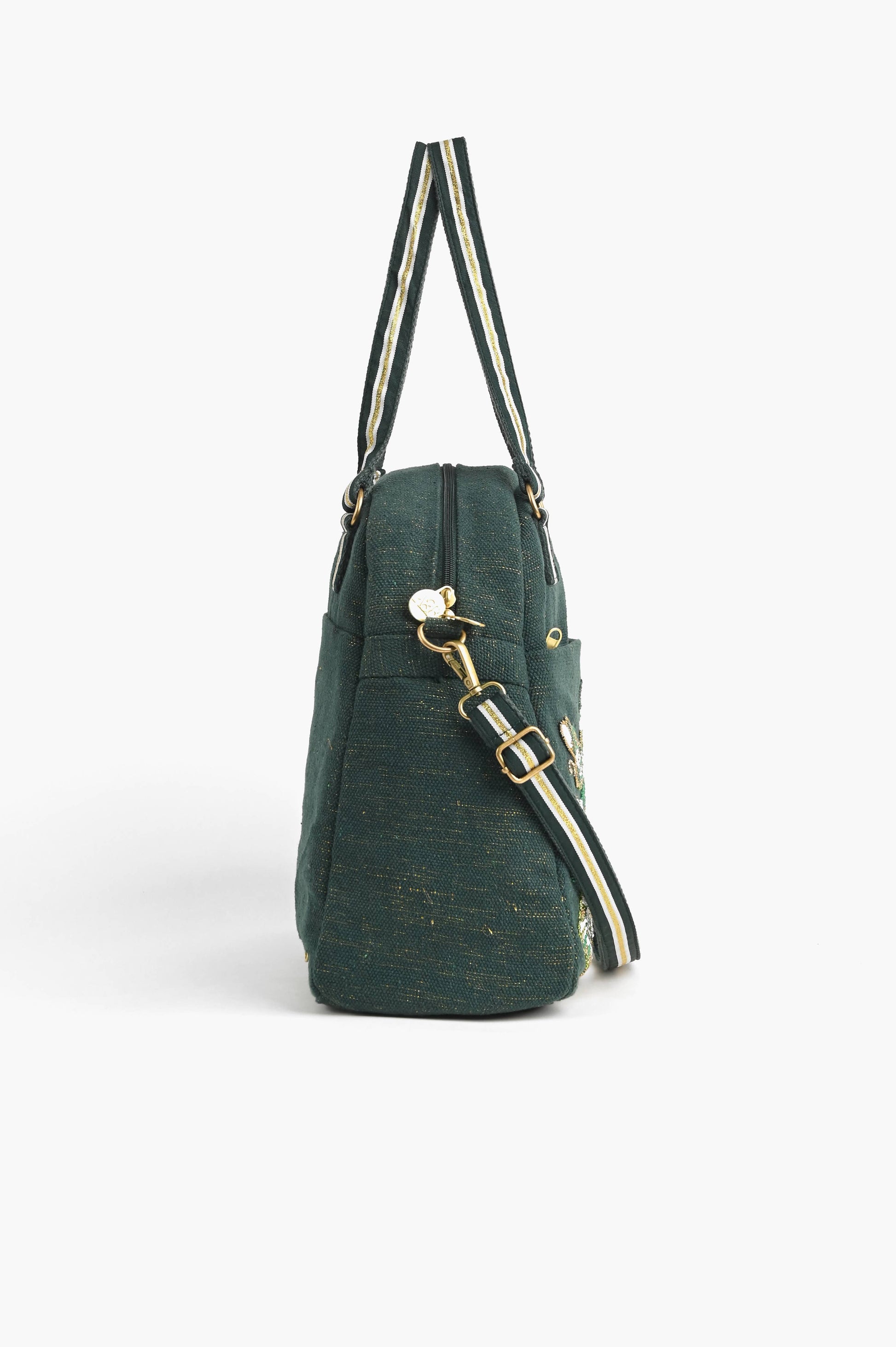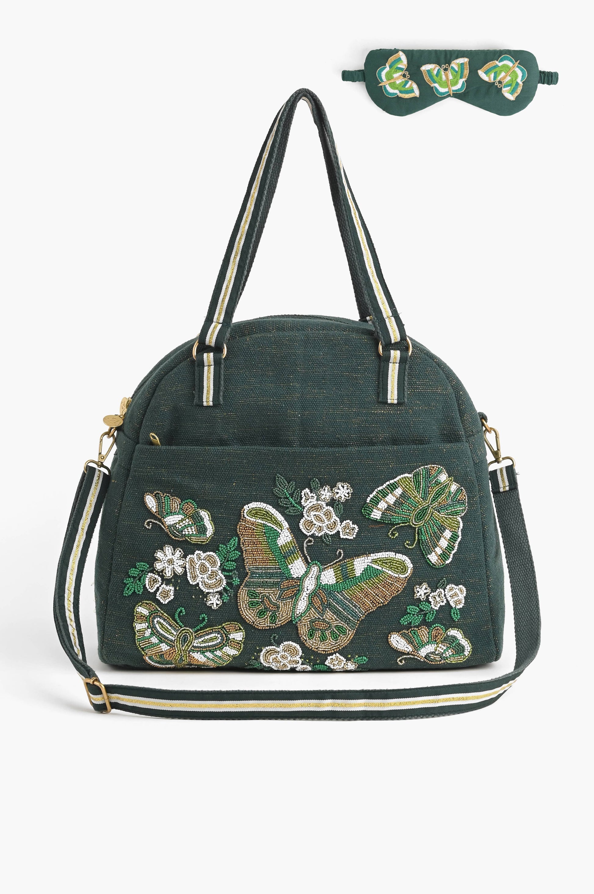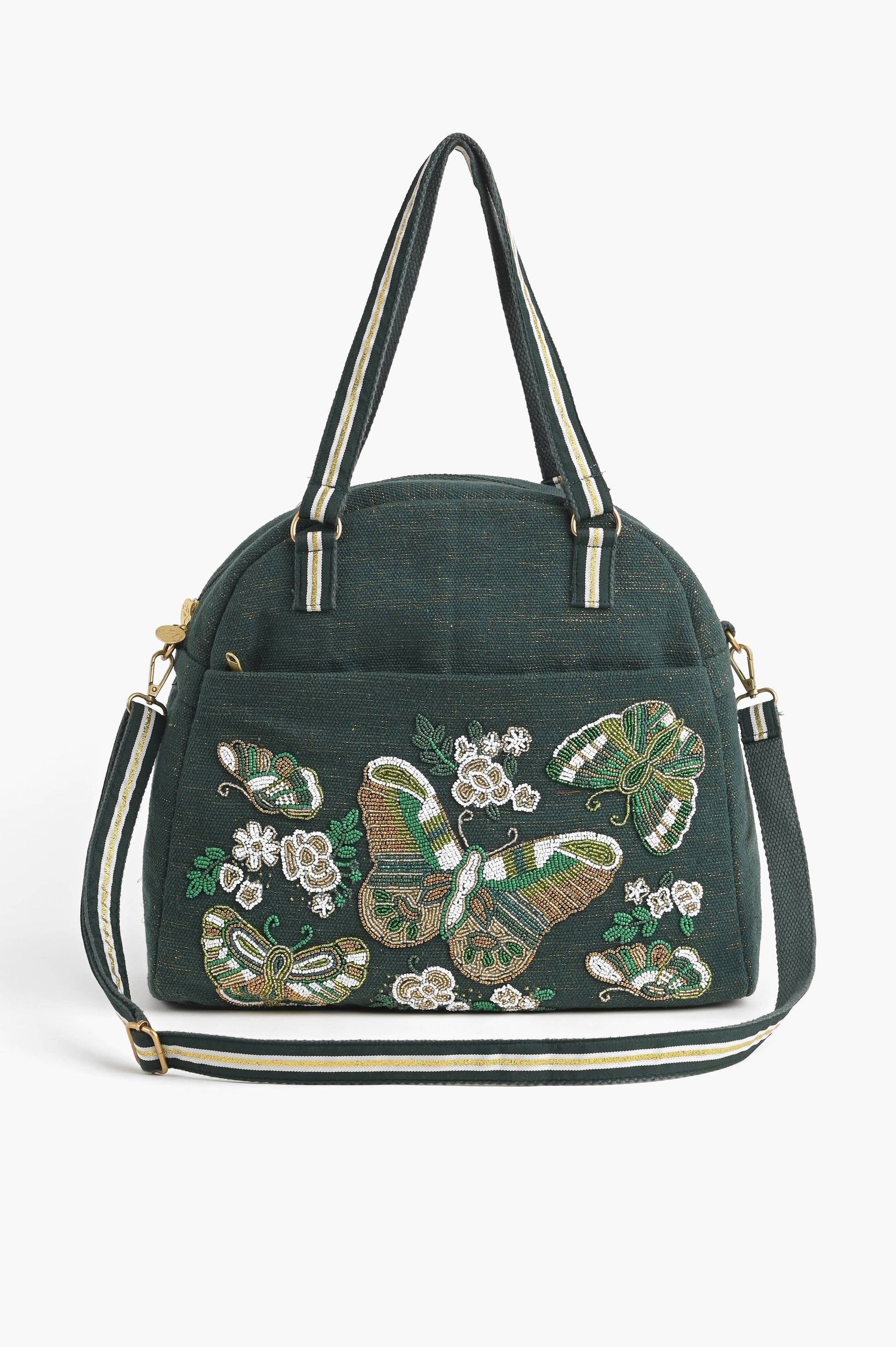 The hand-embellished butterfly design symbolizes freedom, transformation, and the magic of movement. The multi-purpose tote features a top zip closure, comfortable double shoulder straps, and a long adjustable crossbody strap for hands-free ease. With pockets on both the front and back, and fully lined interiors, it keeps you beautifully organized whether you’re flying cross-country or heading out for a soul-nourishing weekend away.