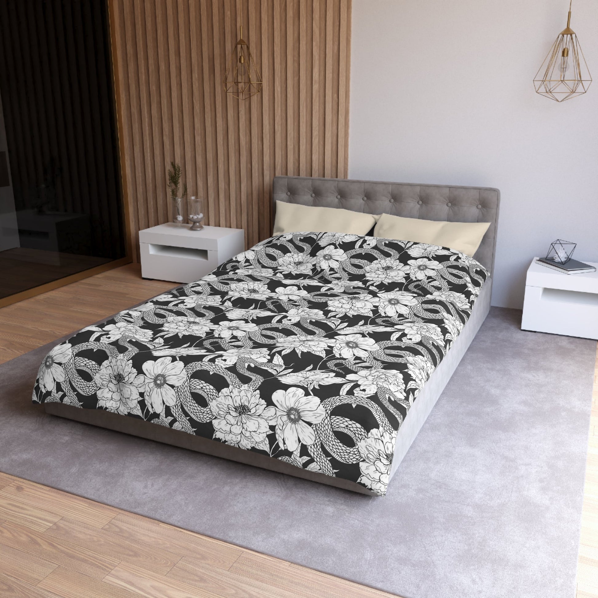 Add some contrast and elegance to your bedroom with this Garden in Gray duvet cover. This duvet cover features a pattern of intertwined flowers and snakes on a black background. The duvet cover is made of 100% polyester microfiber, which is soft, durable, and wrinkle-resistant. It has a zipper closure at the bottom that makes it easy to insert and remove your duvet, and gives it a seamless and elegant look.