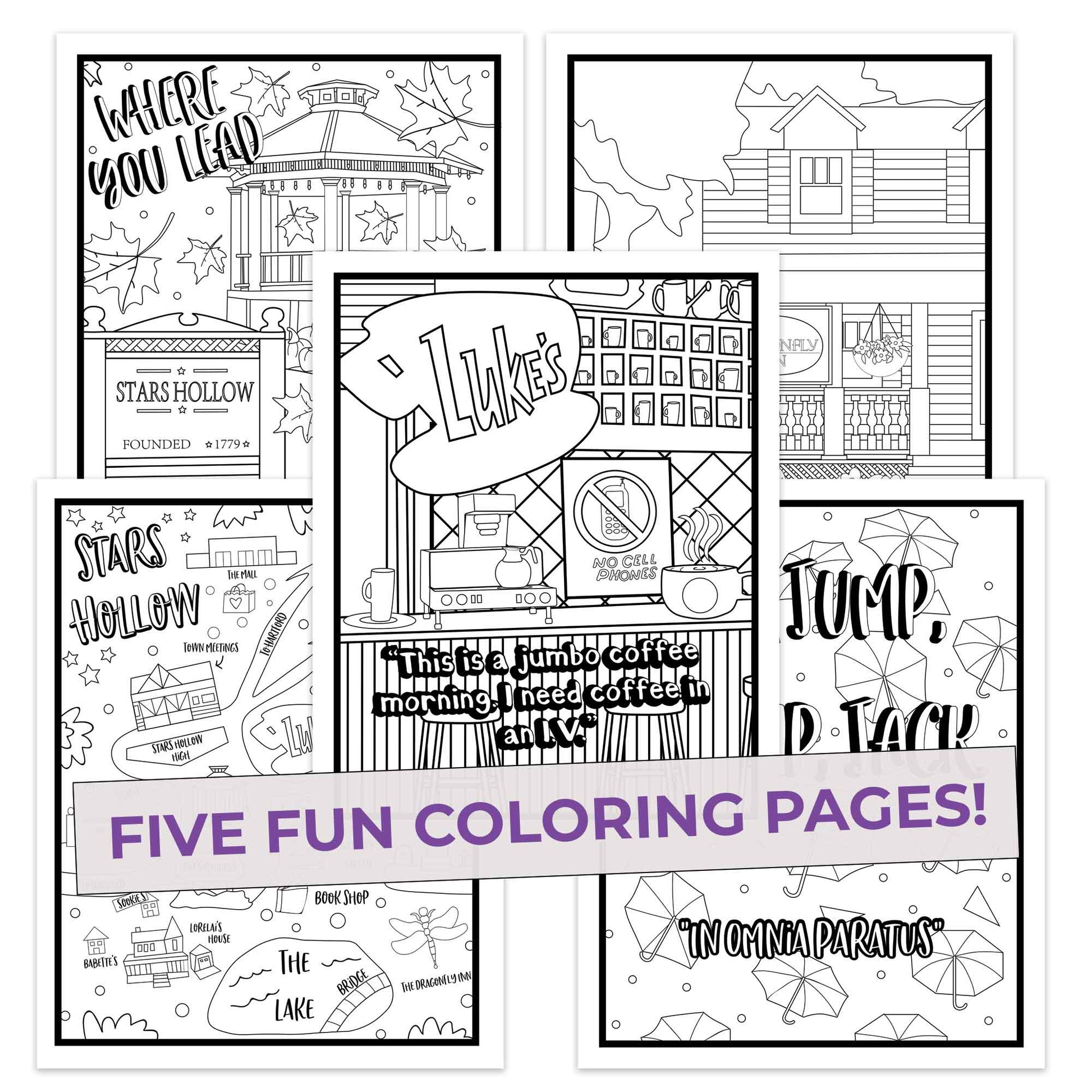You’ll love this pack of five (5) Gilmore Girls coloring pages. Each coloring page was designed from a classic scene or reference from the show. Each page is printed with quality inks on 8.5” x 11” heavy cardstock pages. The pages are not bound in a book form so you can frame them easily. Each pack is designed and printed by a small business in Charlotte, NC.