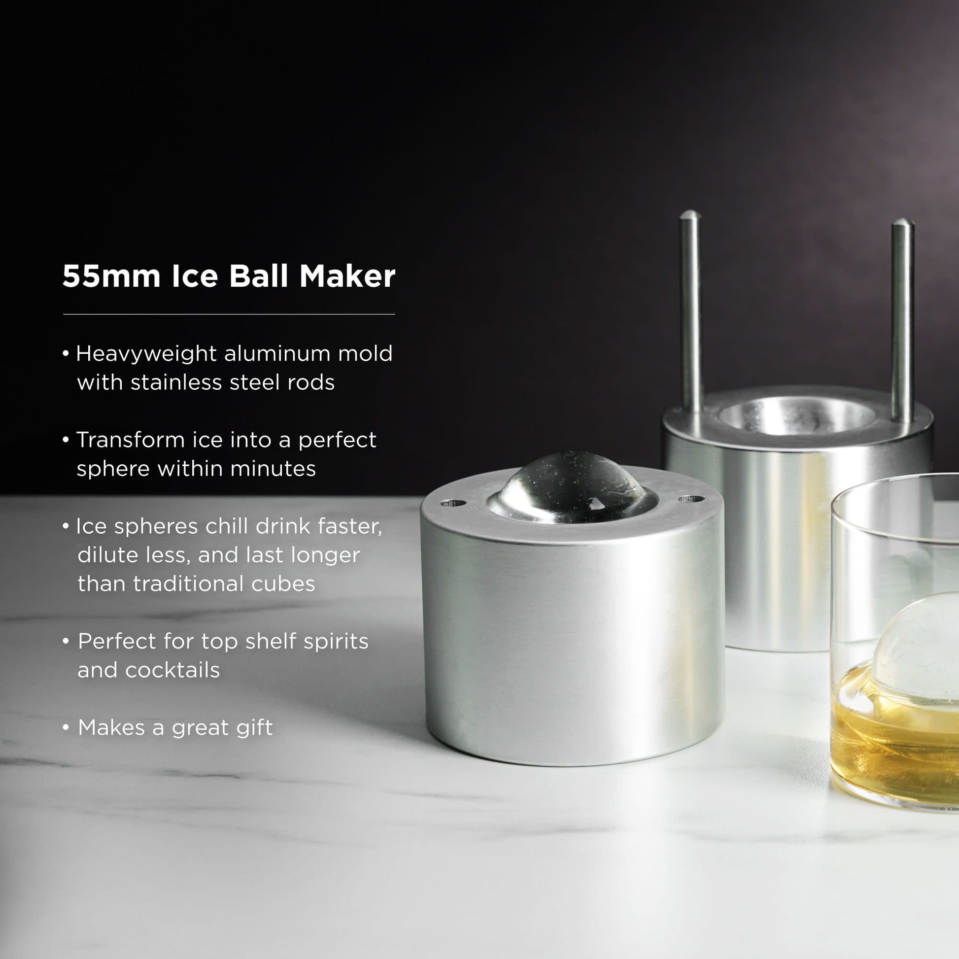 Crystal-clear ice spheres chill faster, dilute less and last longer than cubes can. Fill this 55 mm ice ball maker with a chunk of ice and watch as it transforms into a perfect orb within minutes.