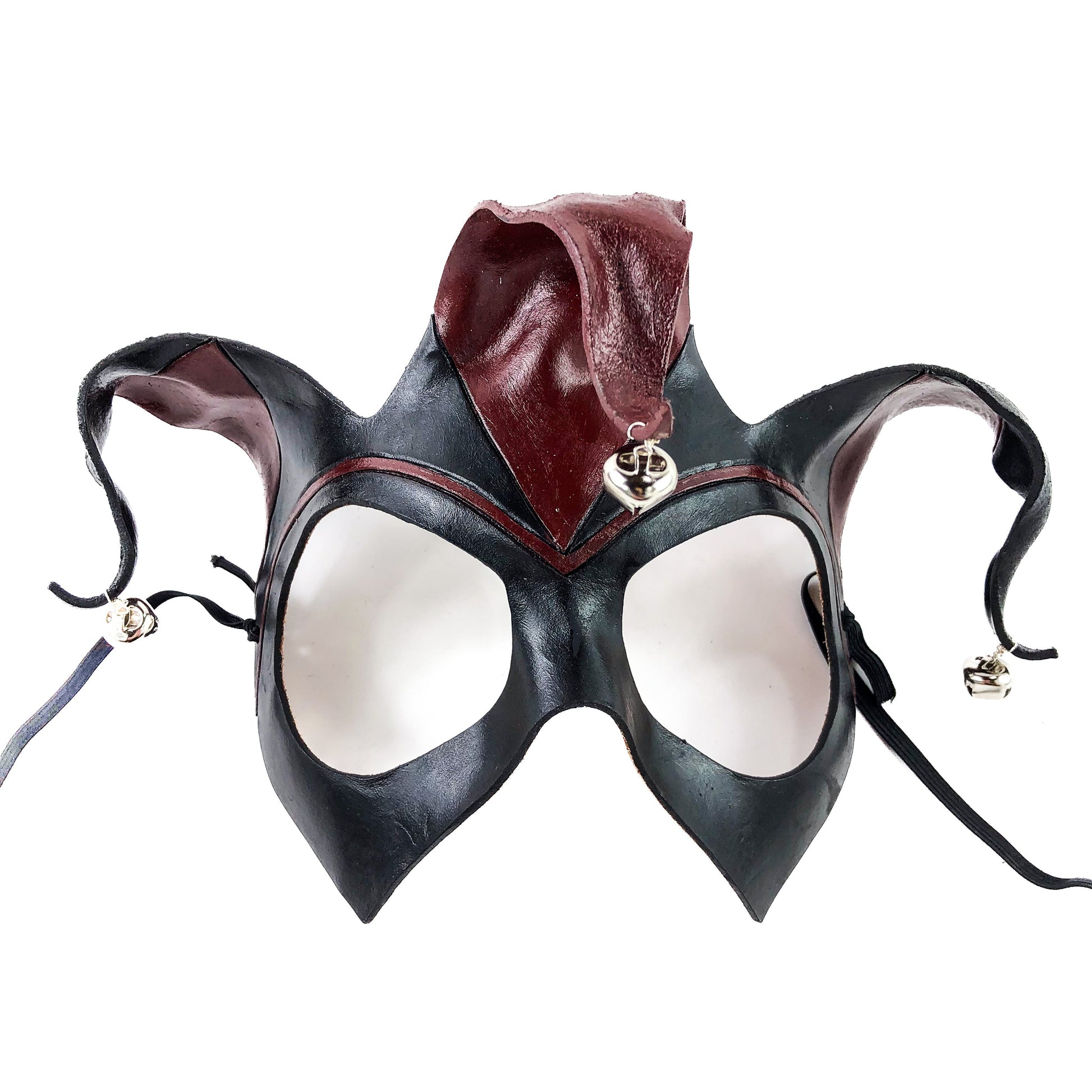 Handmade Genuine Leather Jester Mask in Red and Black with Silver Bells