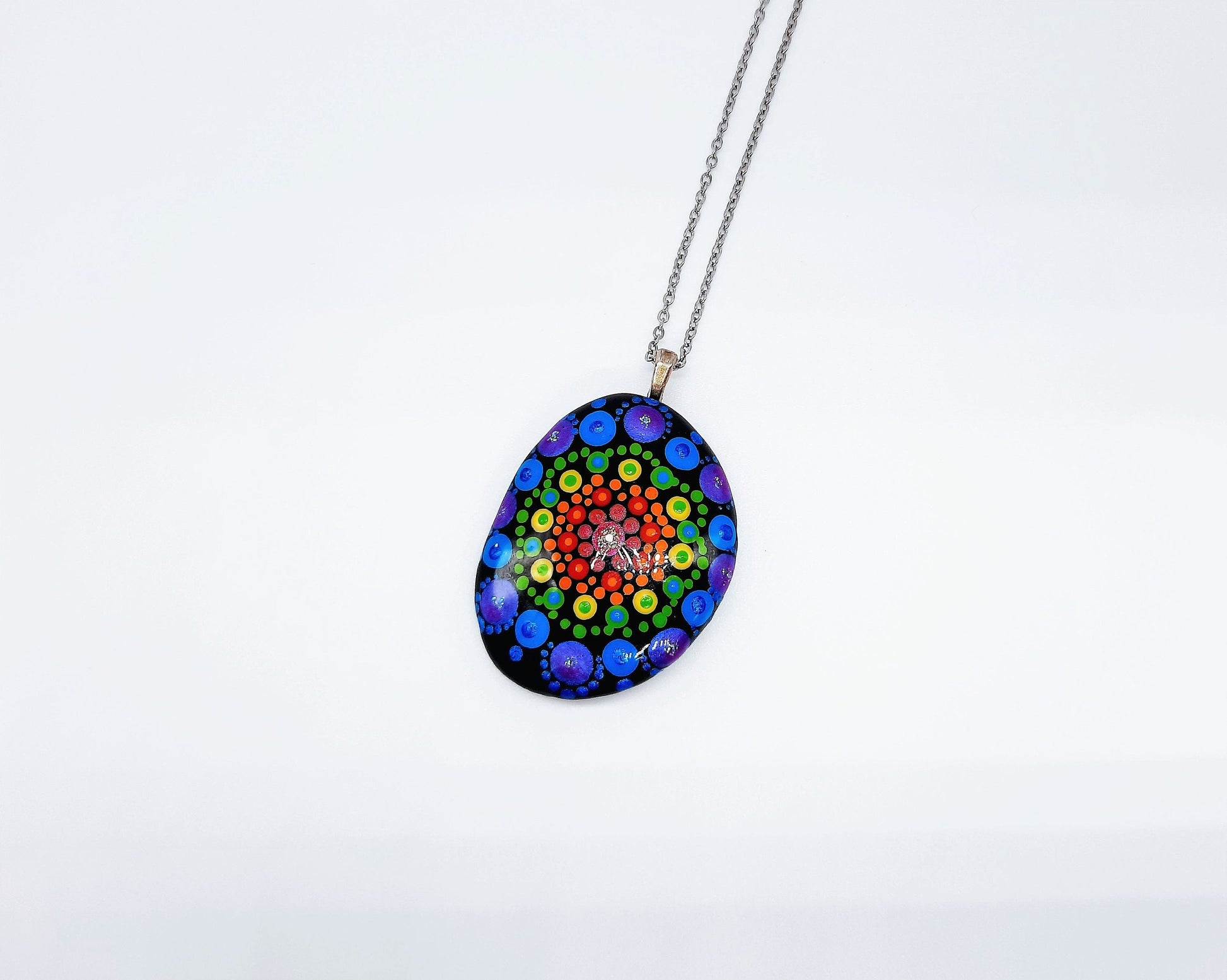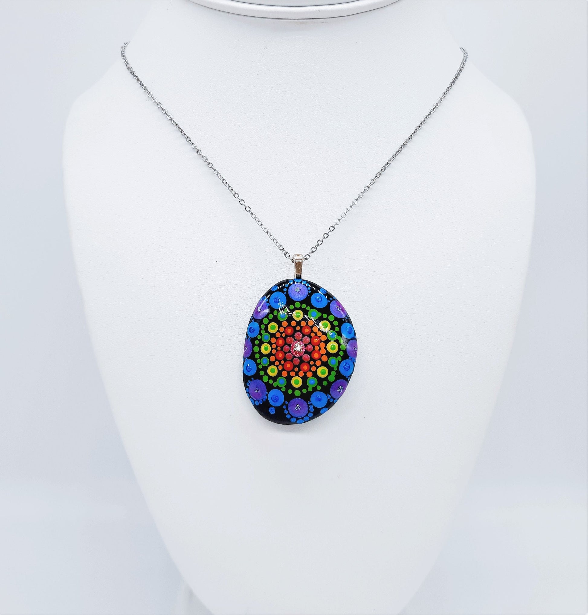 Hand-painted, one of a kind, approximately the size of a fifty cent piece, sealed with resin, comes with a hypoallergenic stainless steel 18" chain with lobster claw closure.